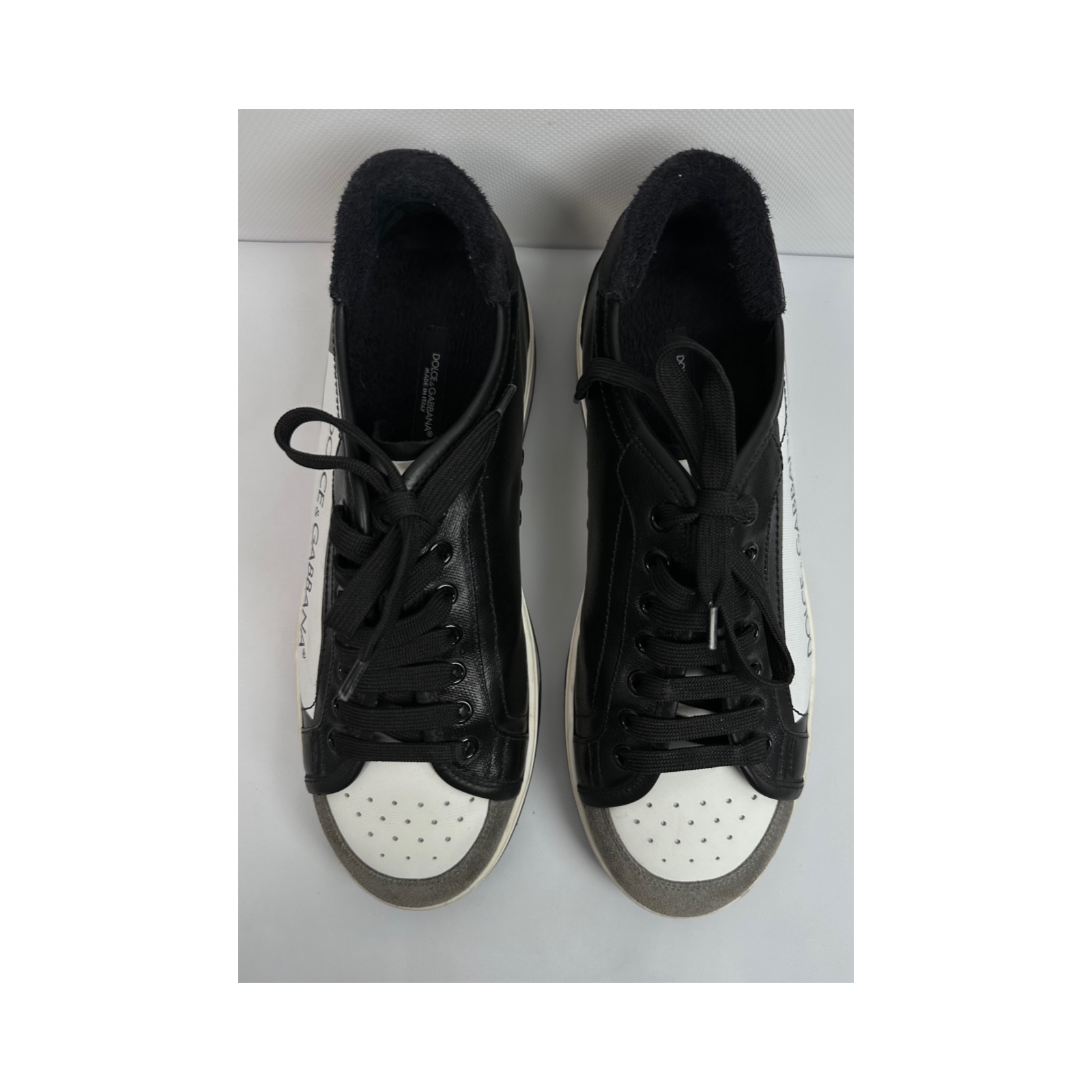"Sneakersy czarno-białe z lodowaniem po zewnętrznej stronie buta. Wykończone na czubie szarym zamszem. Rozmiar 7."
