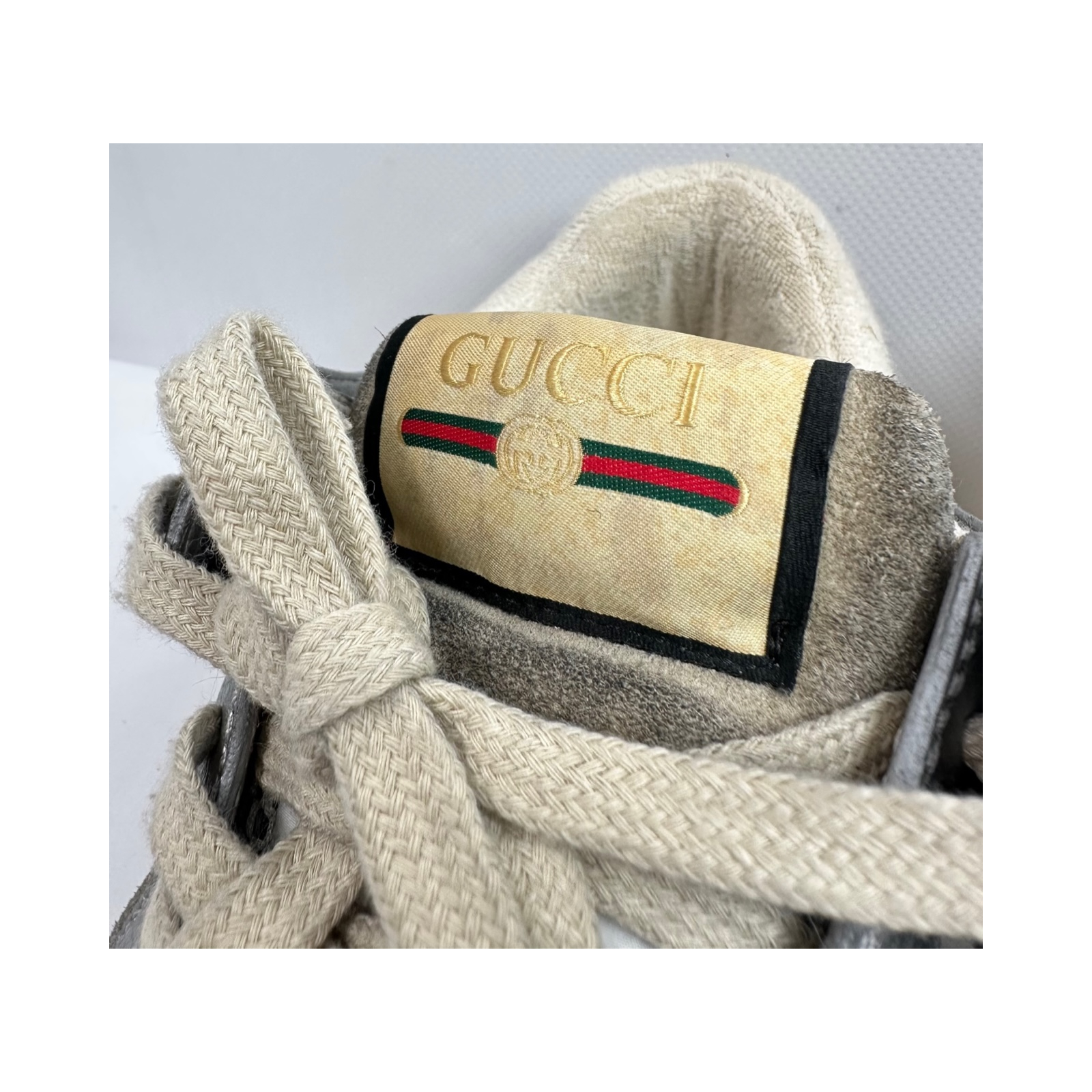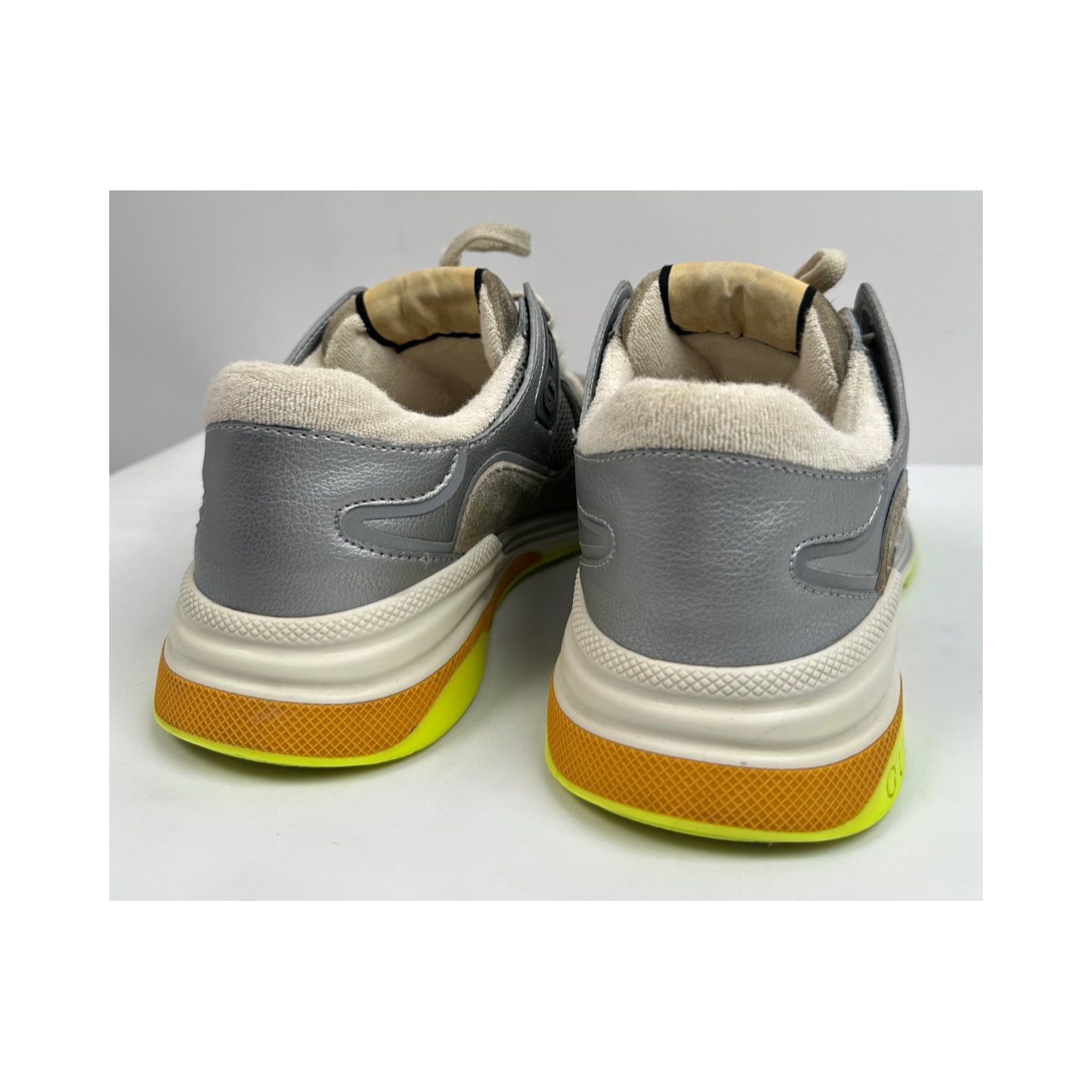 "Srebrno-szare snekaresy wykonane z łączonych materiałów, skórzane i zamszowe wstawki, siatka w przedniej części, sznurowane, zaokrąglone noski, gumowa biało-pomarańczowo-żółta podeszwa, logo marki z boku, na podeszwie, przy sznurówkach oraz na języku, wnętrze wykonane z tkaniny frotte w kolorze kremowym, używane. Stan bardzo dobry, lekko zabrudzona podeszwa. Rozmiar 39."