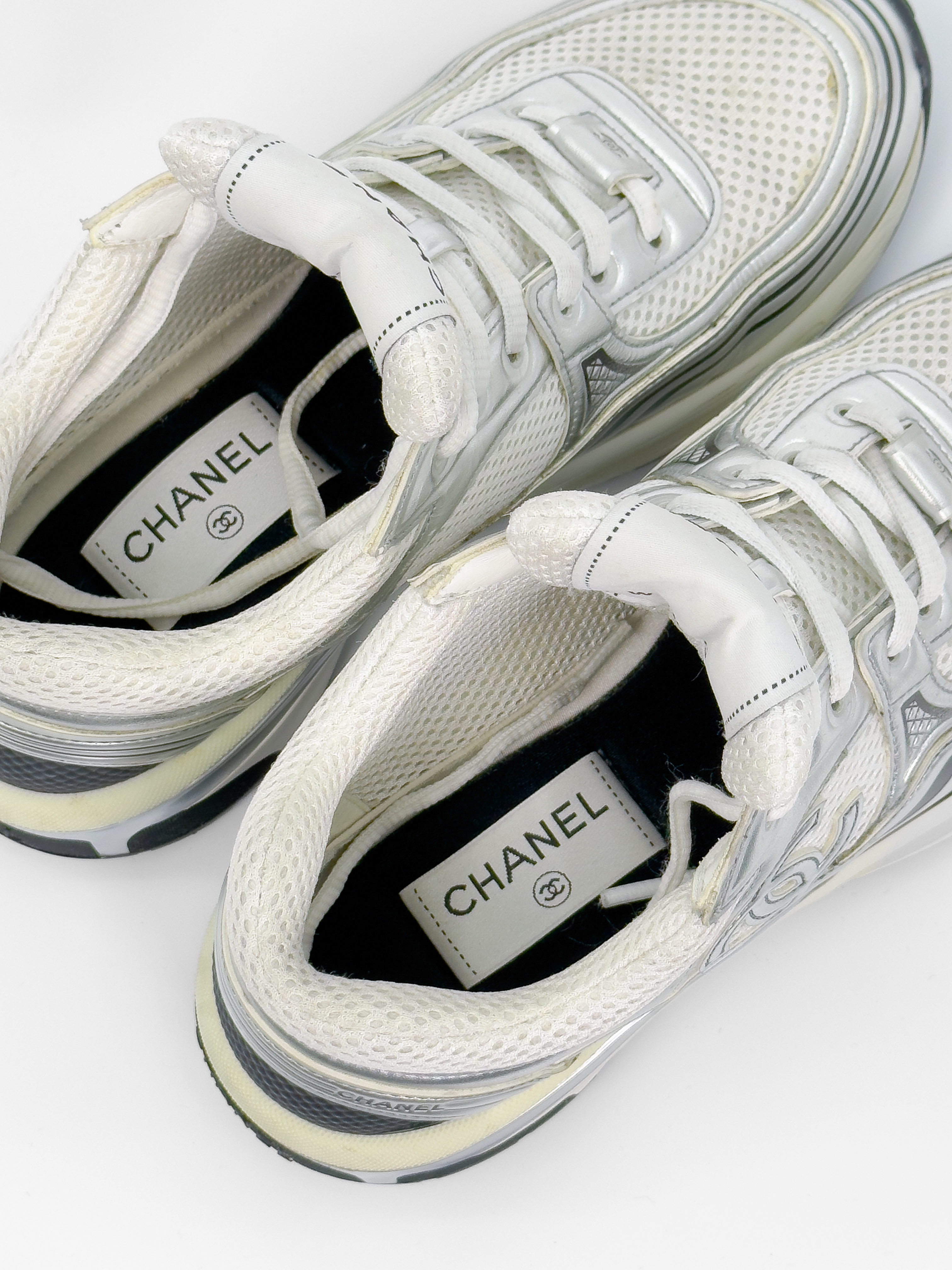 "Biało-srebrne sneakersy wykonane z łączonych materiałów, zaokrąglone noski, sznurowane, białe/szare sznurówki, duże srebrne skórzane logo marki w bocznej części, mniejsze w tylnej oraz na języku i noskach, gumowa podeszwa, w zestawie z pudełkiem, zapasowymi sznurówkami oraz workami przeciwkurzowymi, używane. Stan bardzo dobry, delikatne zabrudzenia na skórze, marszczenia na skórze. Rozmiar 36."