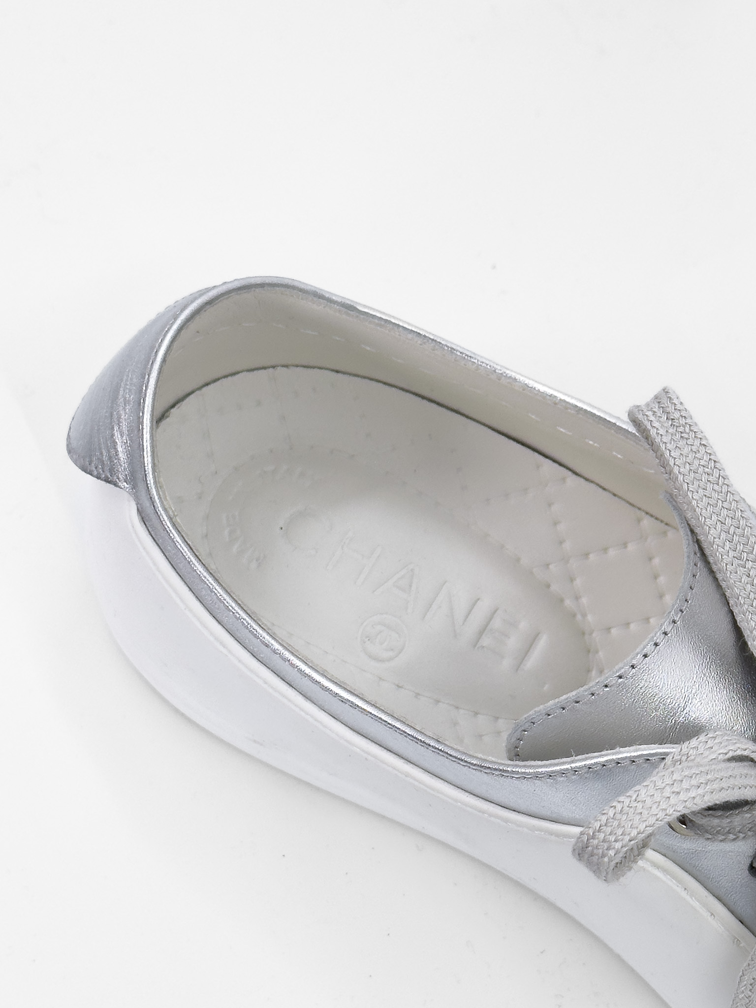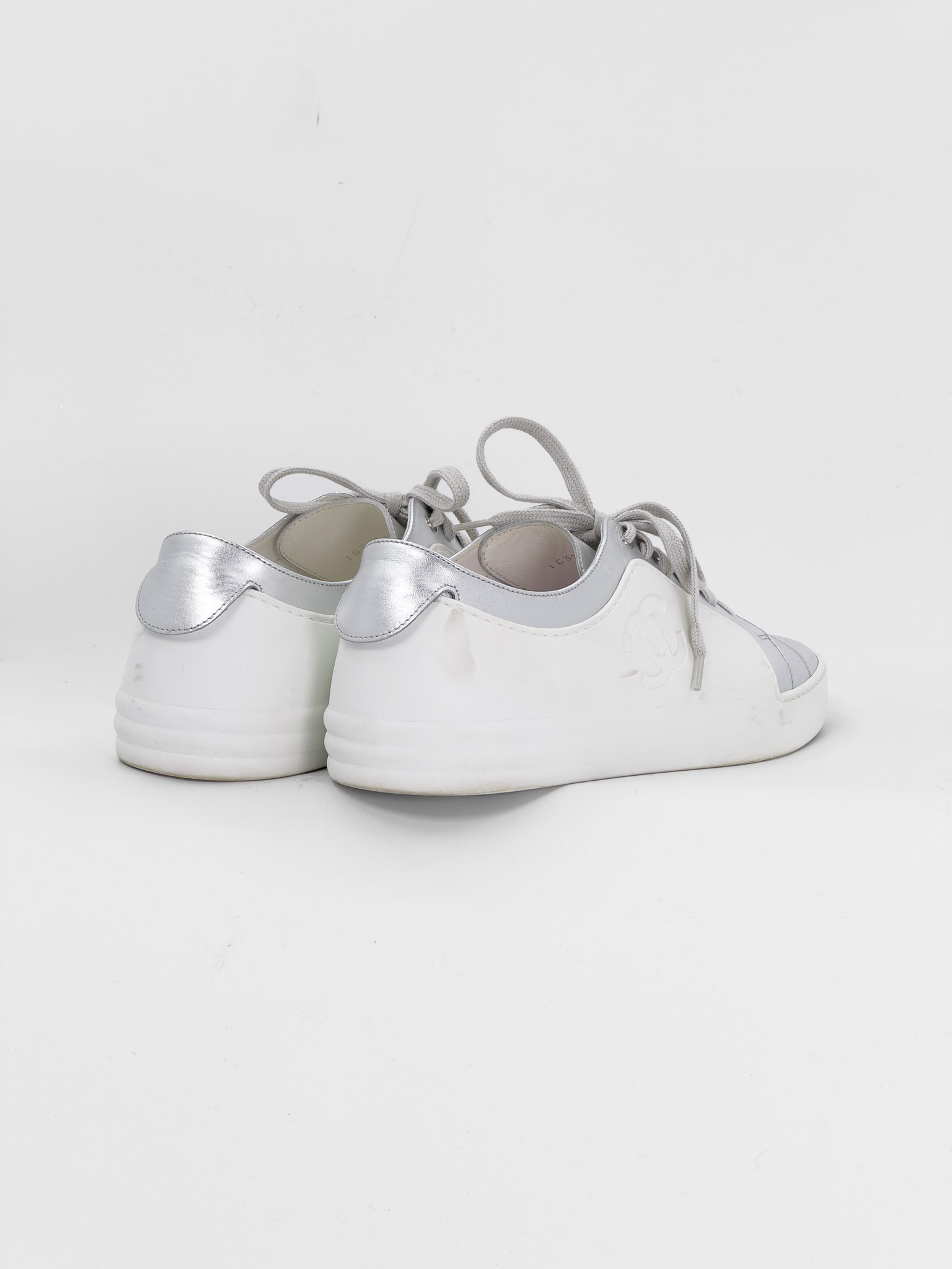 "Biało-srebrne sneakersy ozdobione wytłaczanym logo marki bocznej części, srebrne skórzane wstawki, zaokrąglone noski, sznurowane, szare sznurówki, gumowa podeszwa, używane. Stan dobry, miejscowe marszczenia na skórze oraz zabrudzenia na podeszwie. Rozmiar 40,5."