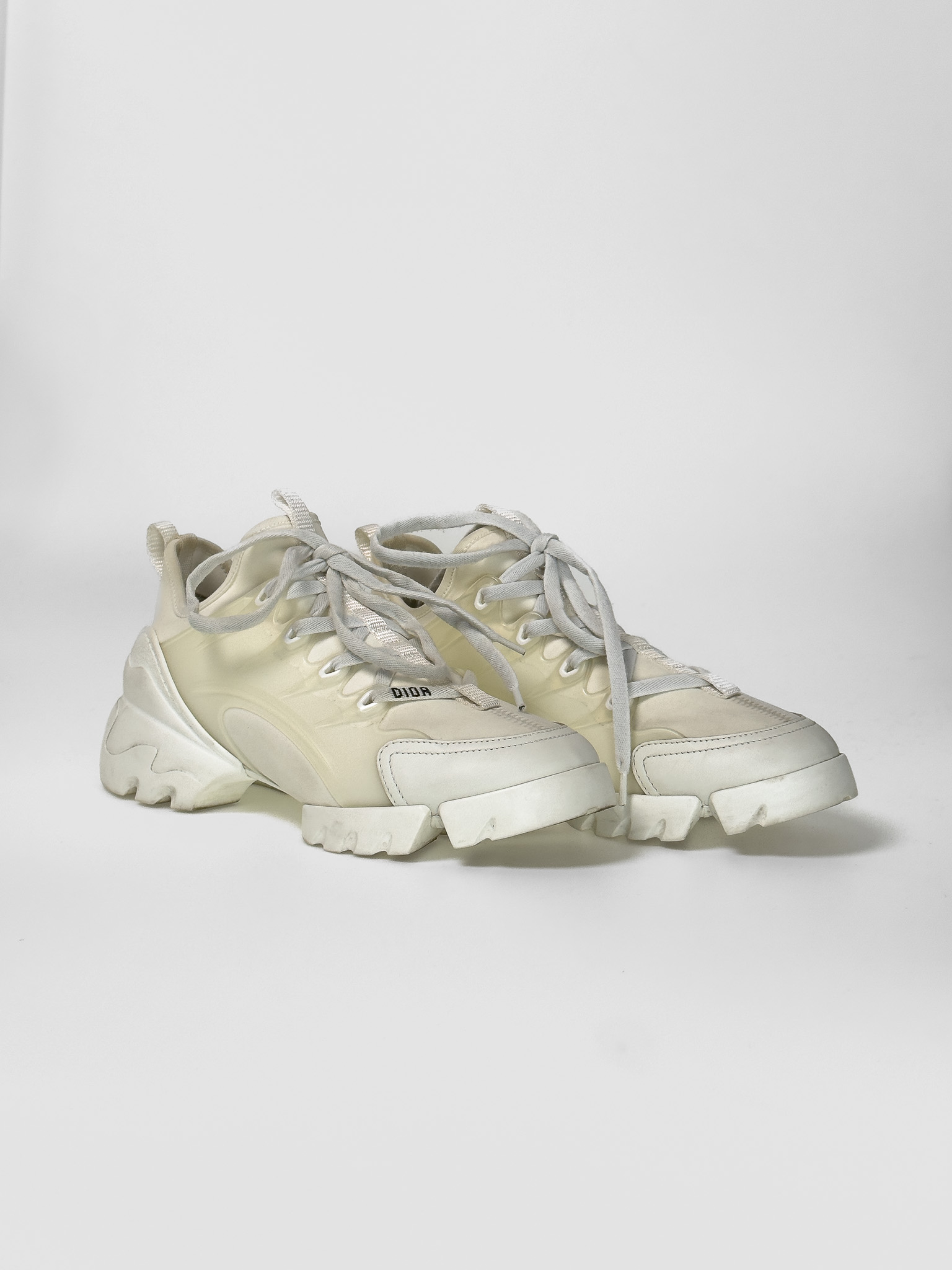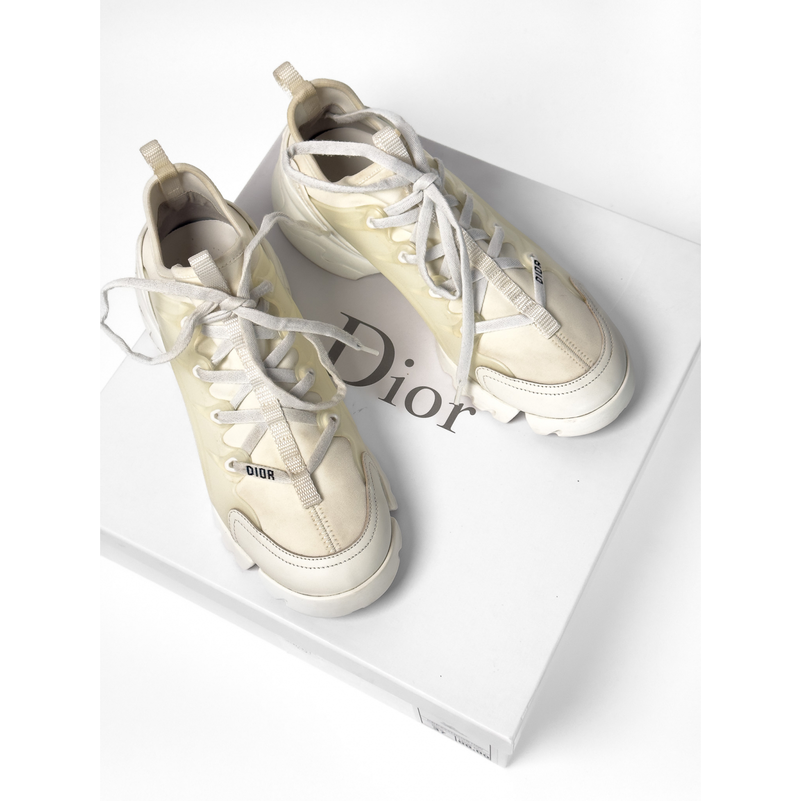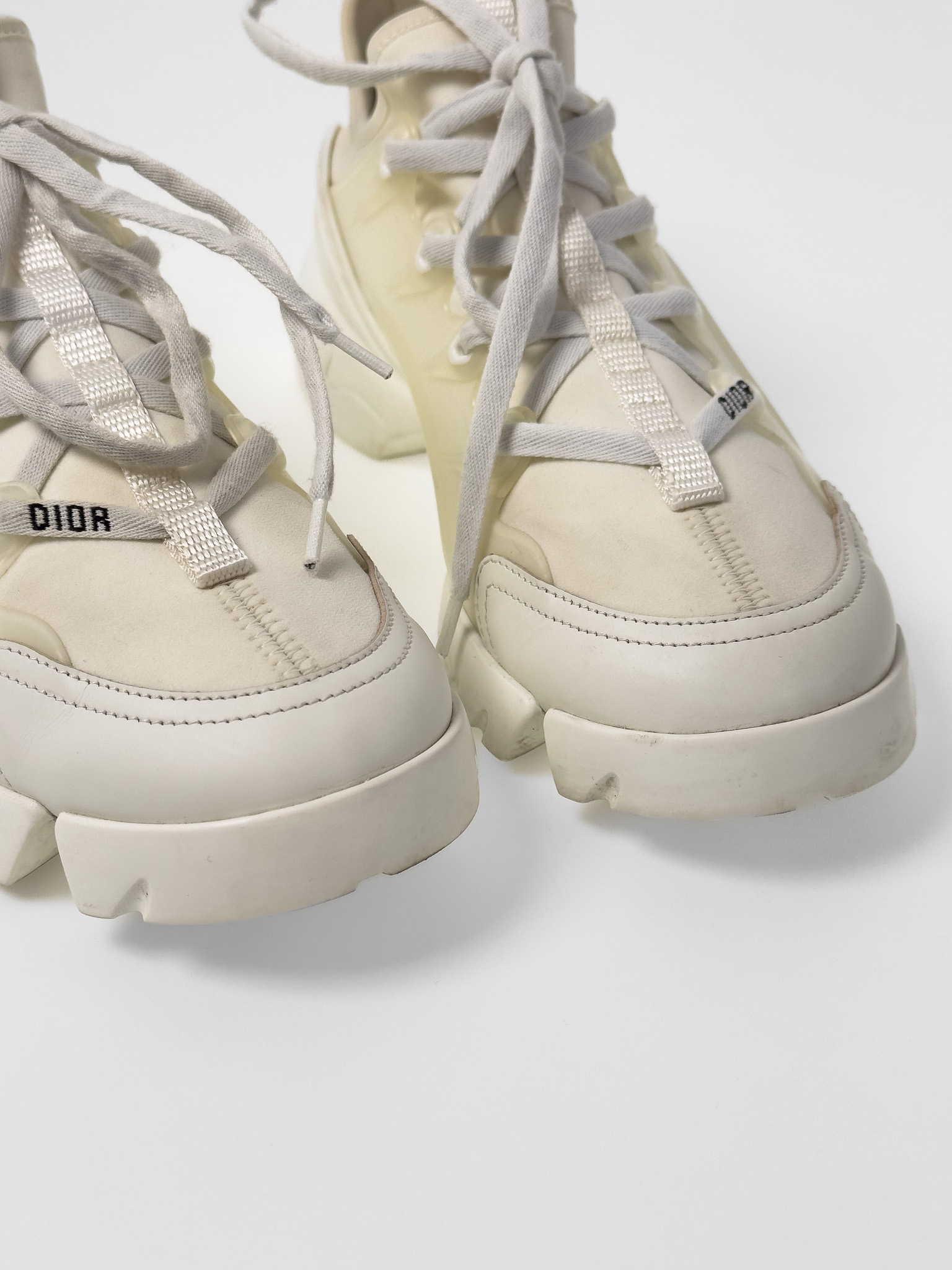 "Sneakersy w kolorze off-white ozdobione transprentnymi, gumowymi wstawkami po bokach, zaokrąglone skórzane noski, sznurowane, białe sznurówki wykończone czarnym logo marki, gumowa wyższa ząbkowana podeszwa, pętelka w tylnej części, używane. Stan bardzo dobry, przybrudzona podeszwa. Rozmiar 37."