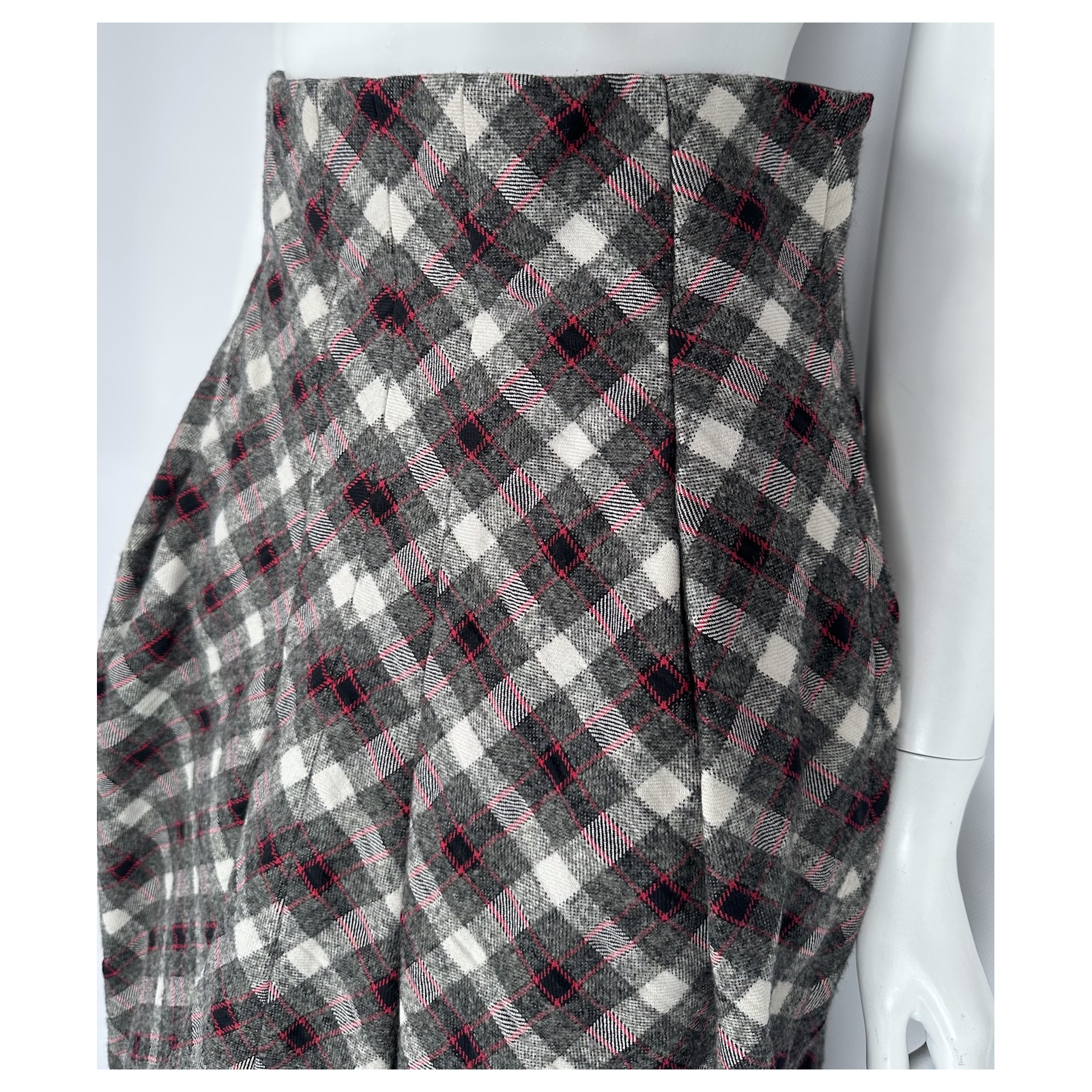 "Szara spódnica w czerwono-czarno-szarą kratę, taliowana, o kroju bombki, dekoracyjne przeszycia, wysoki stan, długość do kolan, zapinana z tyłu na kryty suwak oraz haftkę. Rozmiar z metki IT 40. Skład: 51% bawełna, 49% wełna; podszewka: 52% acetat, 48% wiskoza. Wymiary: szerokość w pasie 35cm, długość całkowita 60cm."