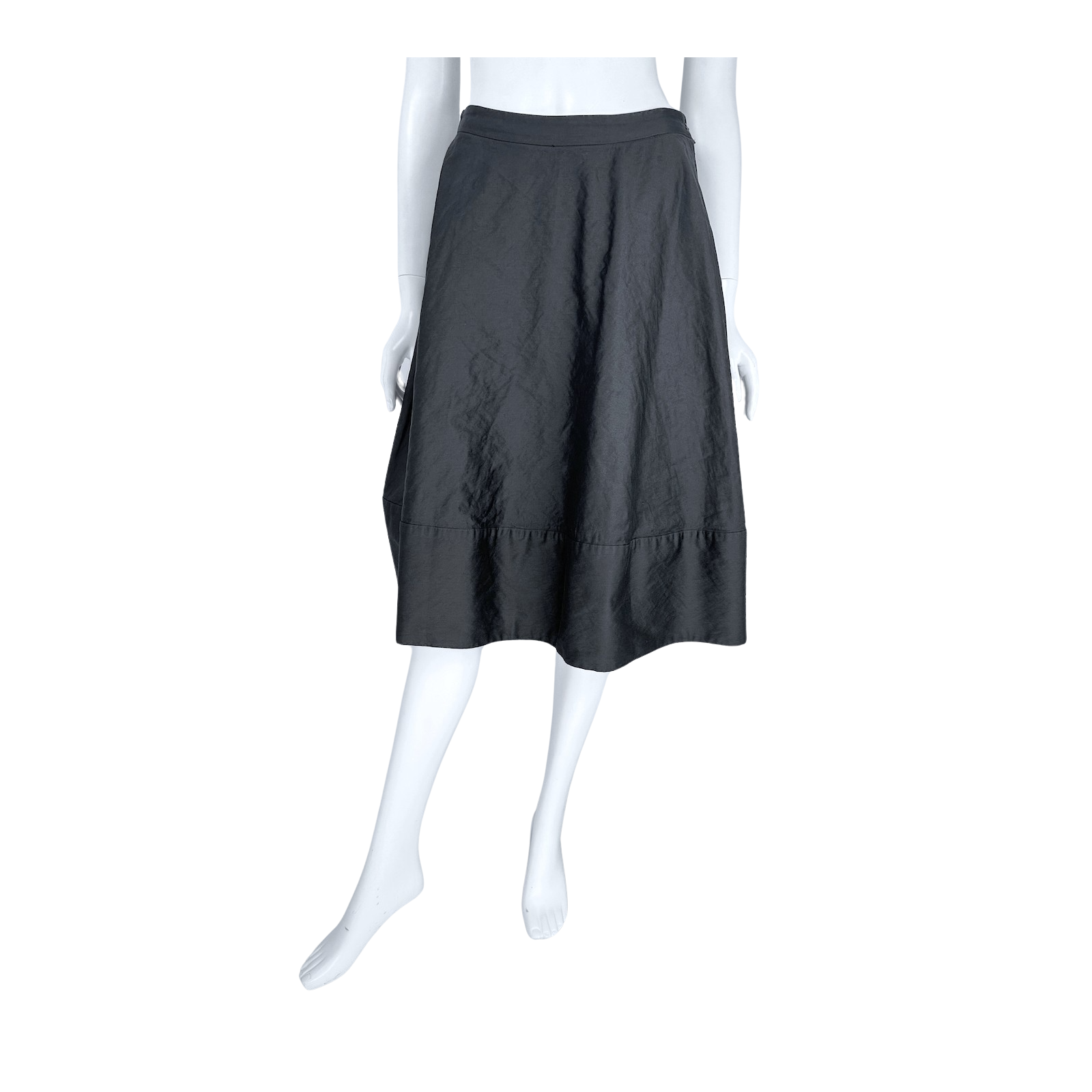 "Czarna bawełniana spódnica, połyskujący materiał, długość do kolan, wysoki stan, zapinana z boku na kryty suwak oraz guzik, rozszerzana ku dołowi, rozkloszowana, szeroki pas dołu, błyszcząca podszewka. Brak metki ze składem, rozmiarowo wypada jak M. Skład: 50% bawełna, 44% rayon, 6% włókno metaliczne. Wymiary: szerokość w pasie 36cm, długość całkowita 63cm."