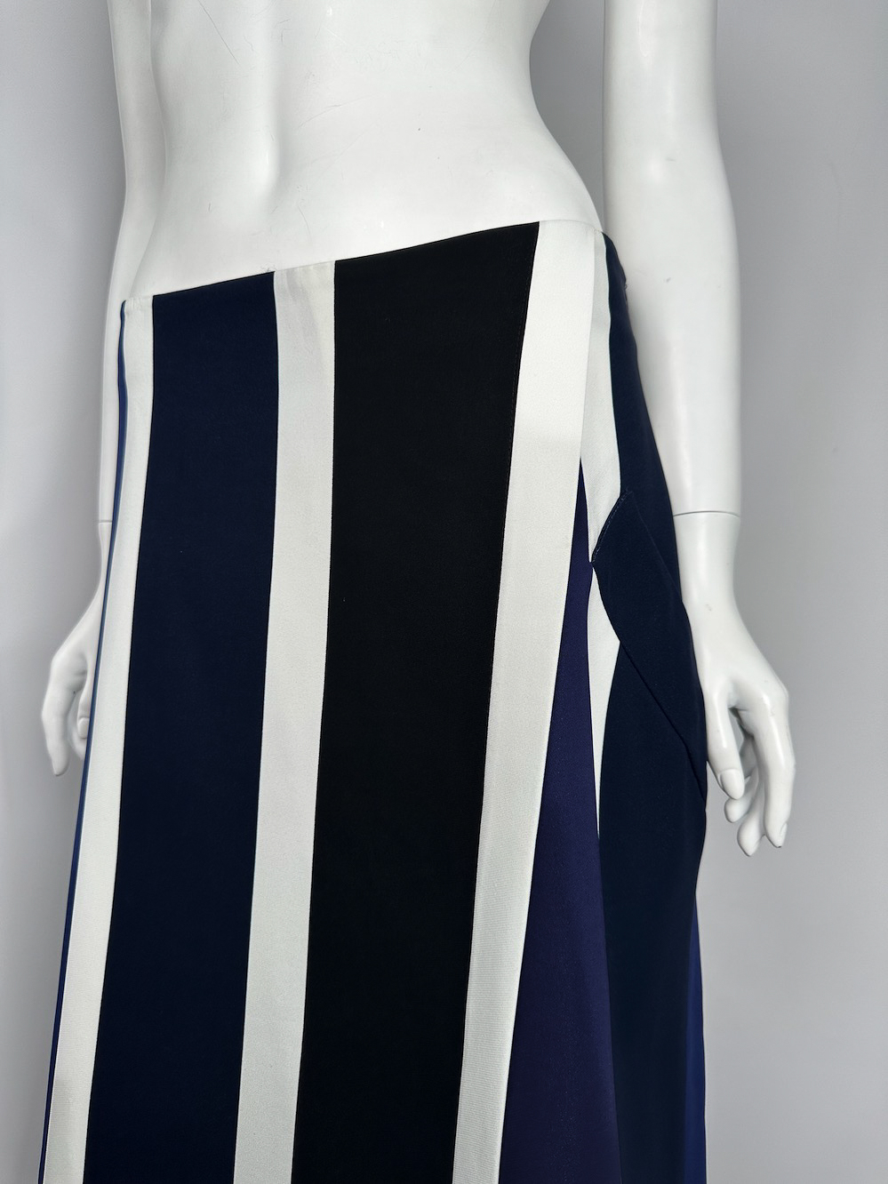 "Granatowa spódnica w czarne i białe pasy z zakładką, wysoki stan, zapinana z boku na kryty suwak, długość za kolano, rozporek z boku, rozszerzana ku dołowi, jedna kryta kieszeń z boku. Rozmiar z metki IT 46. Skład: 96% wiskoza, 4% elastan; materiał wewnętrzny: 100% poliester. Wymiary: szerokość w pasie 40cm, długość całkowita 77cm."