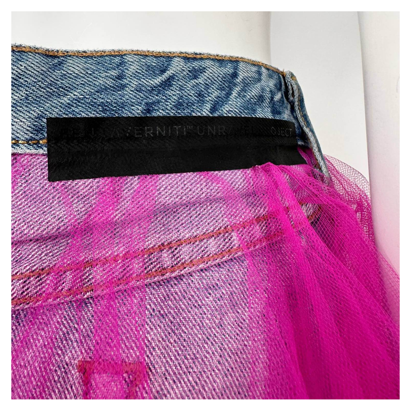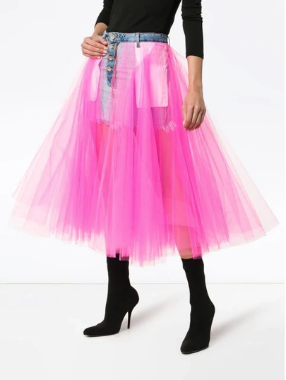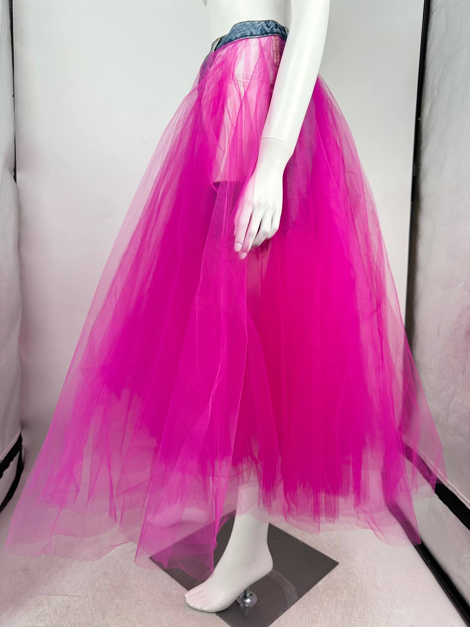 "jeansowa mini spódnica z różowym tiulem, zapinana z przodu na guziki. Rozmiar 36. Skład: 100% bawełna. Wymiary: szer. talii 36 cm, szer. bioder 40 cm, dł. jeansu 35 cm, dł. tiulu 78 cm."