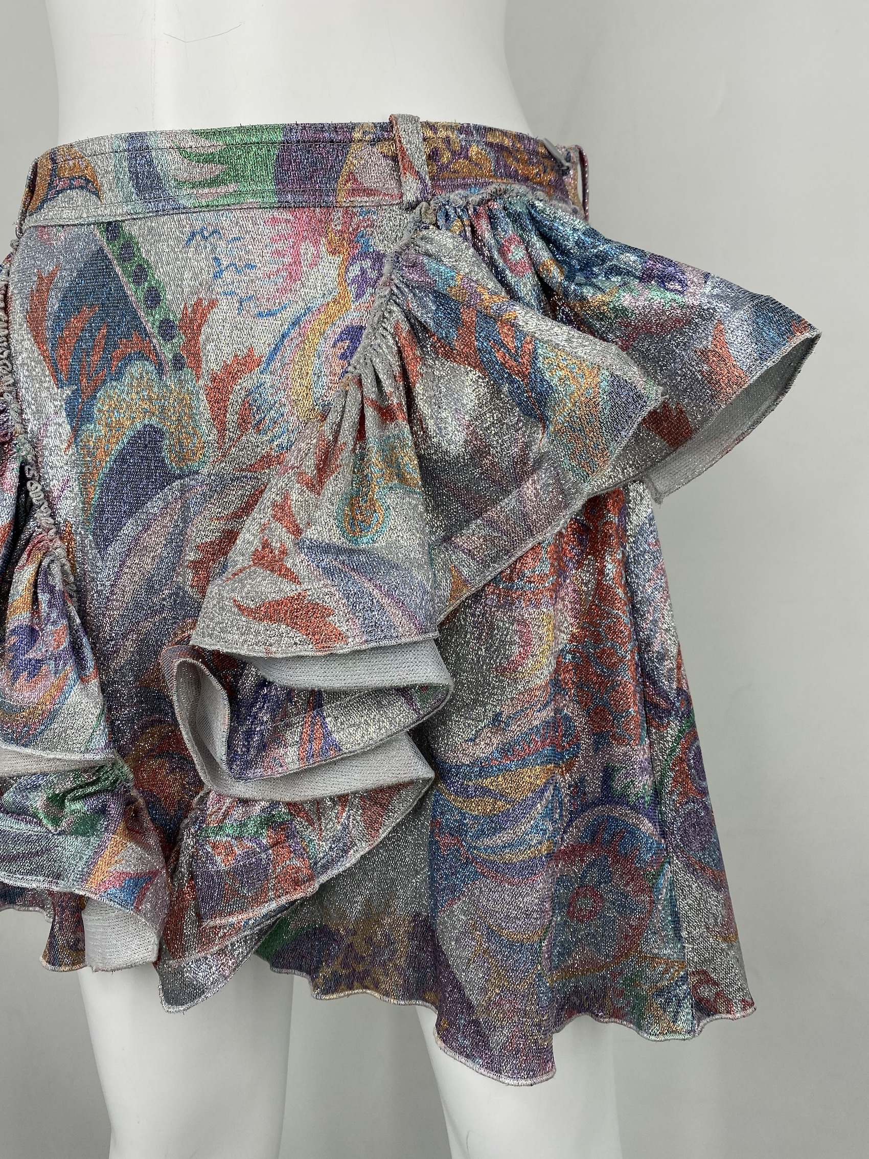 "spódnica mini, kolorowa w metaliczne nitki ( srebrny czerwony zielony żółty) falbanki układające się w trójkąt na przodzie. Brak meti z rozmiarem i składem. Wymiary: szer. talia 36cm, dł przód 38, tył 44cm, szer. biodra ok. 50 cm"