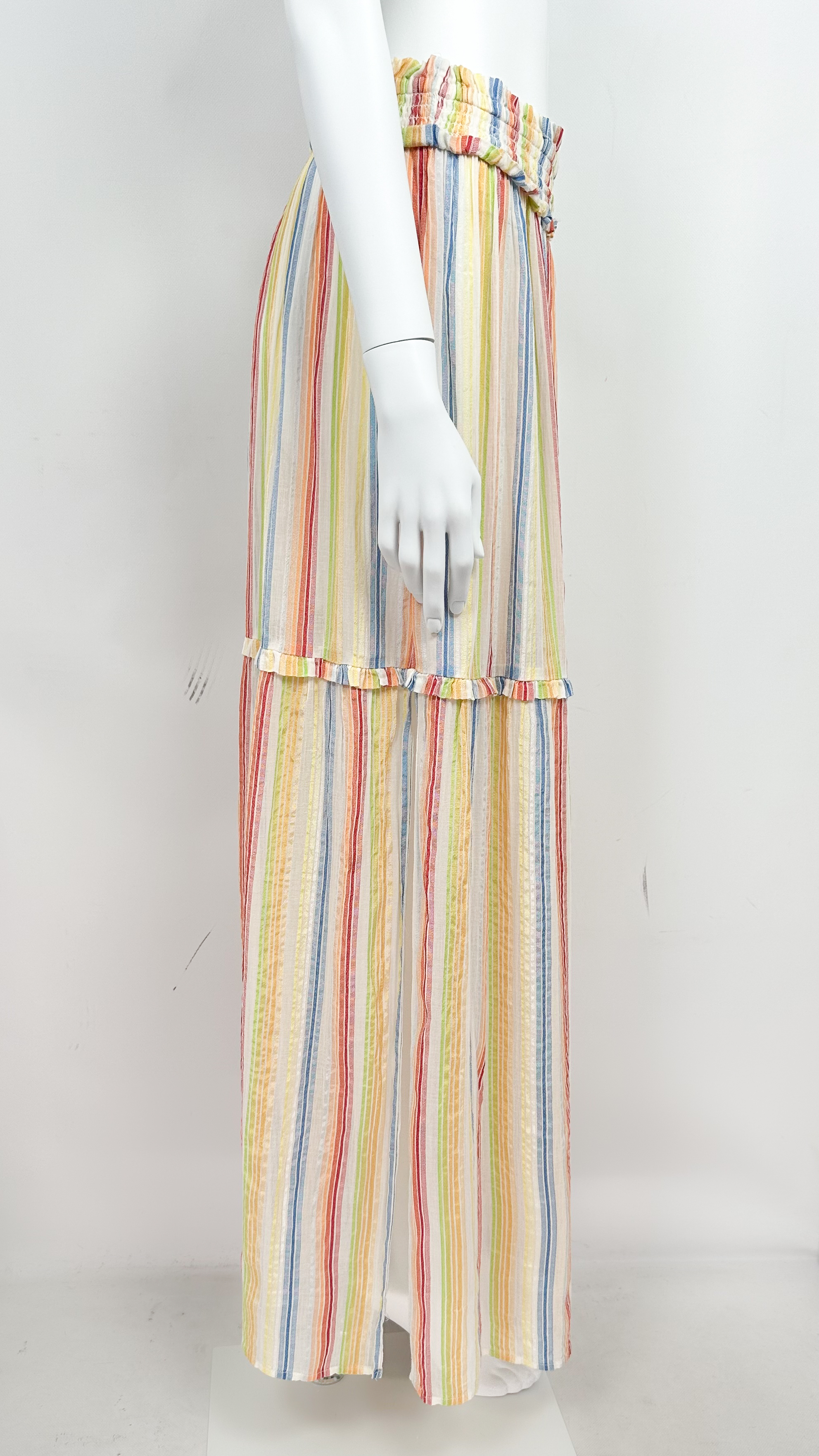 "Kolorowa spódnica w pionowe pasy w odcieniach niebieskiego, czerwonego, pomarańczowego, zieloni, żółci oraz bieli, rozcięcie w bocznej części, szeroka guma w pasie, długość maxi, delikatnie rozkloszowana. Skład: 50% bawełna, 50% wiskoza; podszewka: 100% rayon. Wymiary: szerokość w pasie 35cm, długość całkowita 110cm."