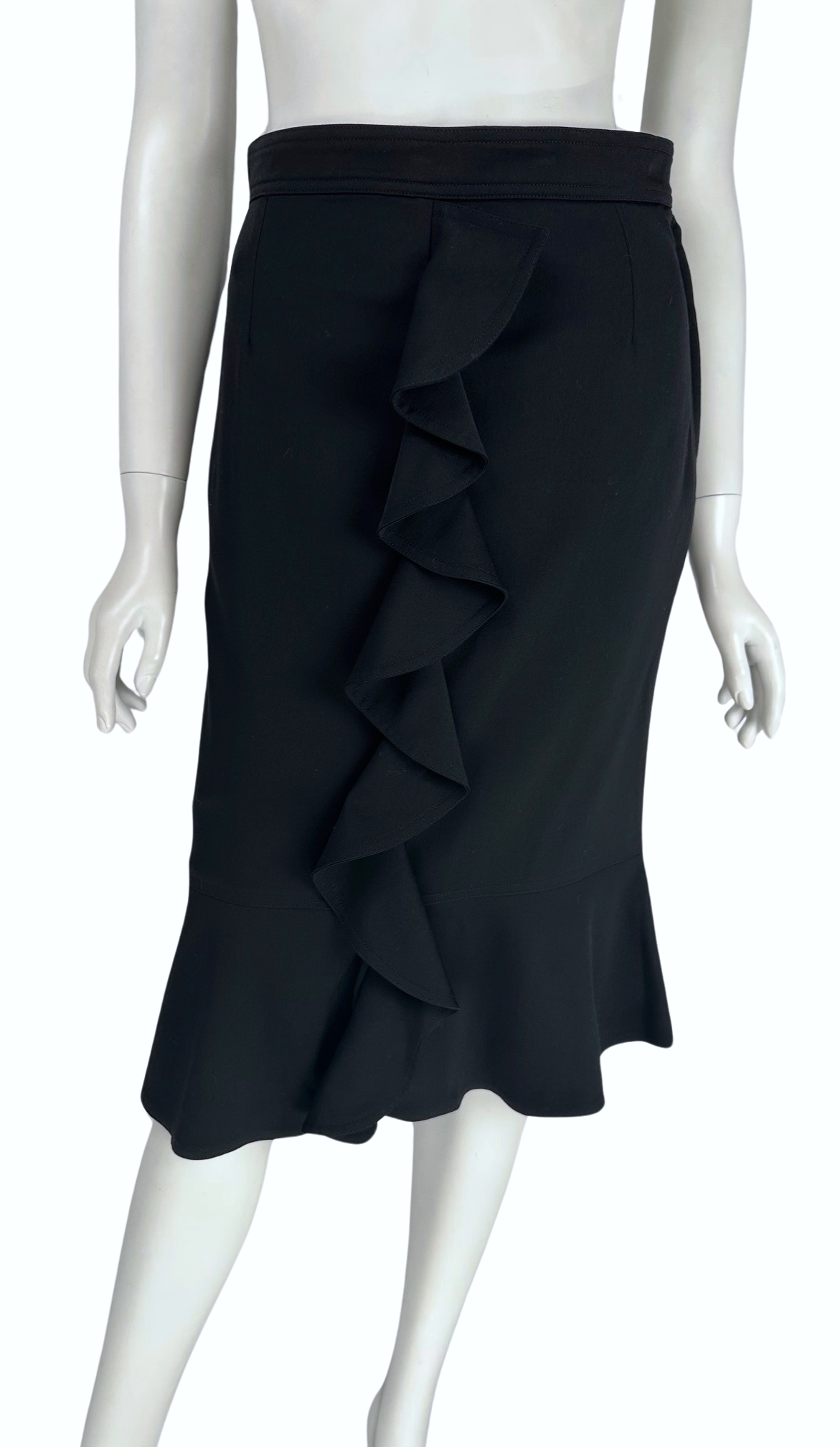 "Czarna wełniana spódnica, vintage, prosty krój, dekoracyjna falbana na przodzie oraz na zakończeniu, długość do kolan, wysoki stan, zapinana na metalowy logowany zamek oraz guzik z boku. Rozmiar z metki FR 38. Skład: 98% wełna, 2% elastan.