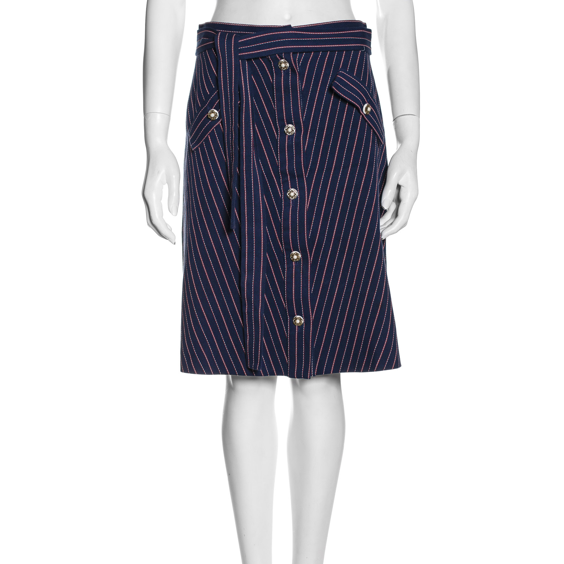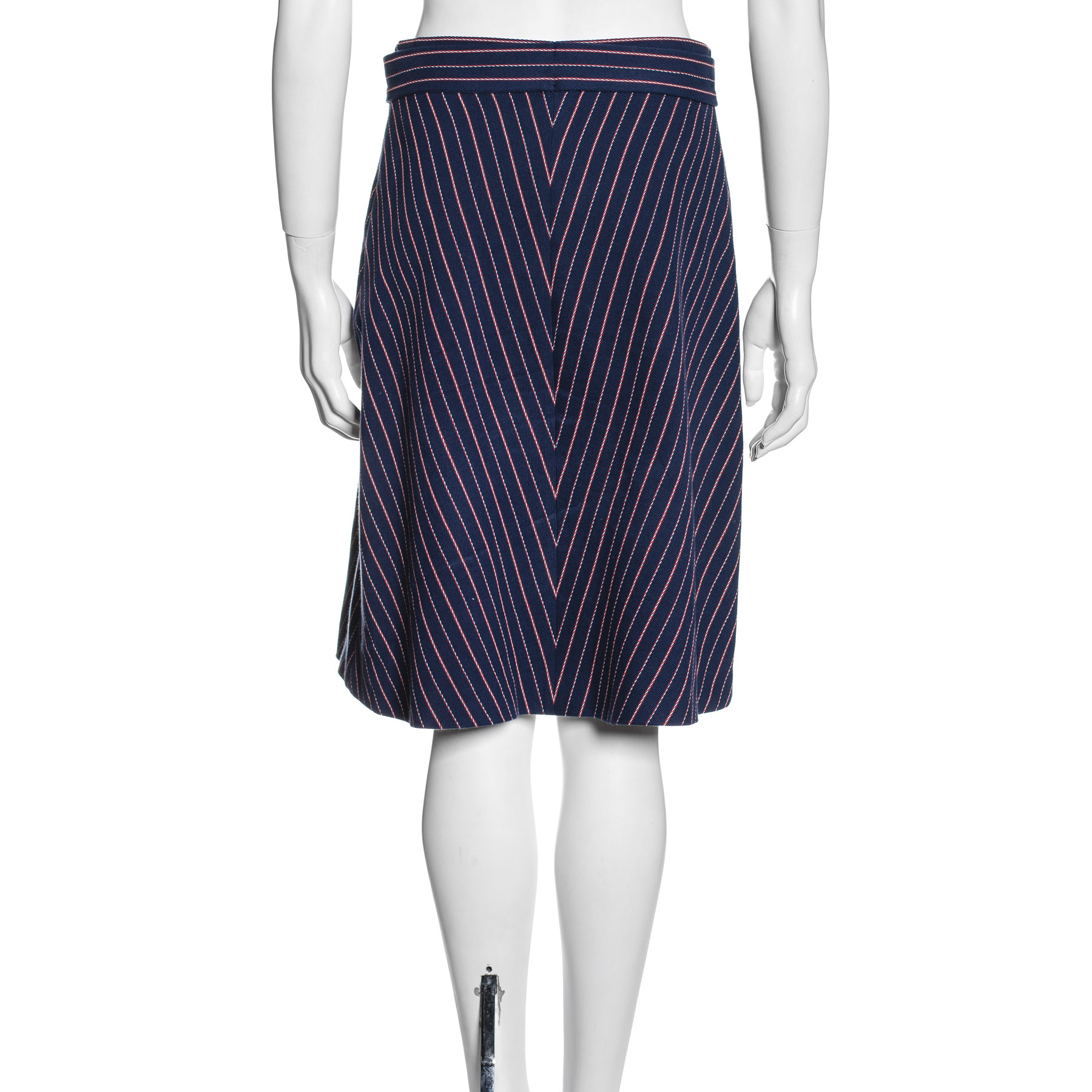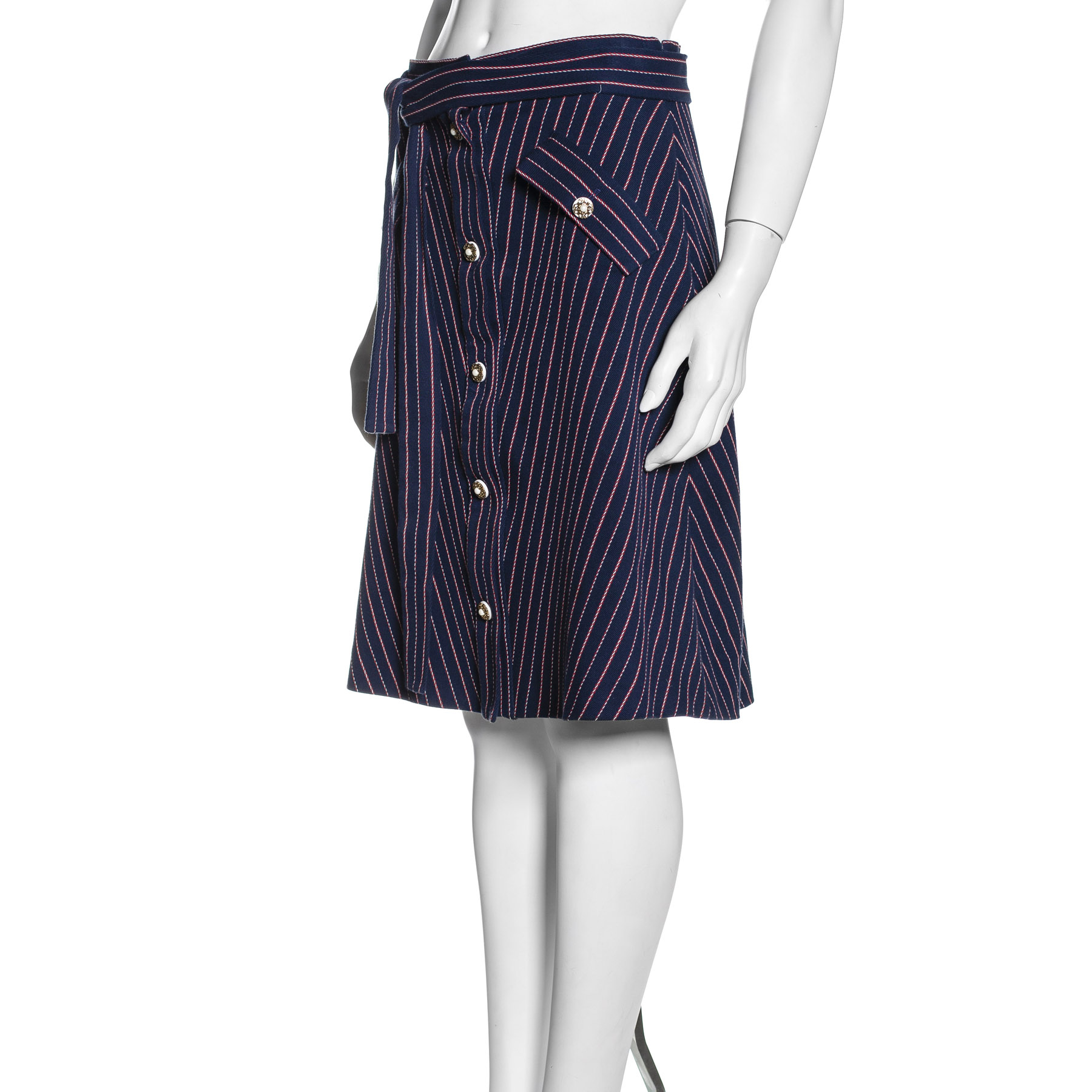 "spódnica trapezowa granatowa z w czerwono białe paseczki, ozdobne guziki, wszyty pasek, zapinana z boku na suwak. Skład: 100 % bawełna Wymiary: talia 36 cm długość 59 cm."