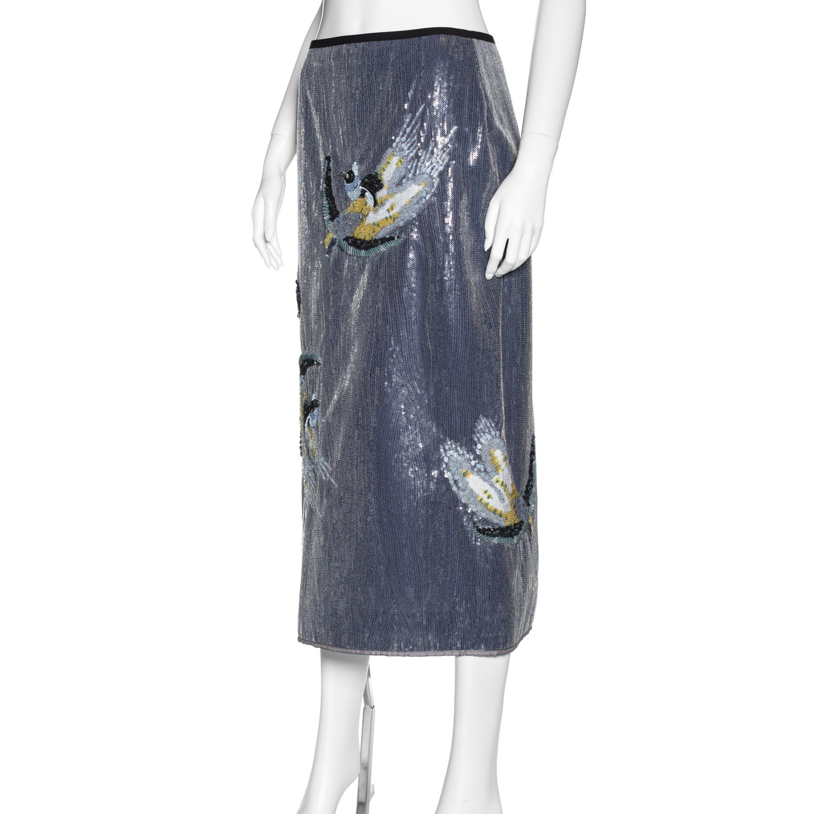 "Szara spódnica midi wyszywana cekinami. Haftowana w cekinowe ptaki. Rozmiar 38. Skład: 100% poliester, podszewka 100% jedwab. Wymiary: talia 37 cm., biodra 48 cm., długość 84 cm."