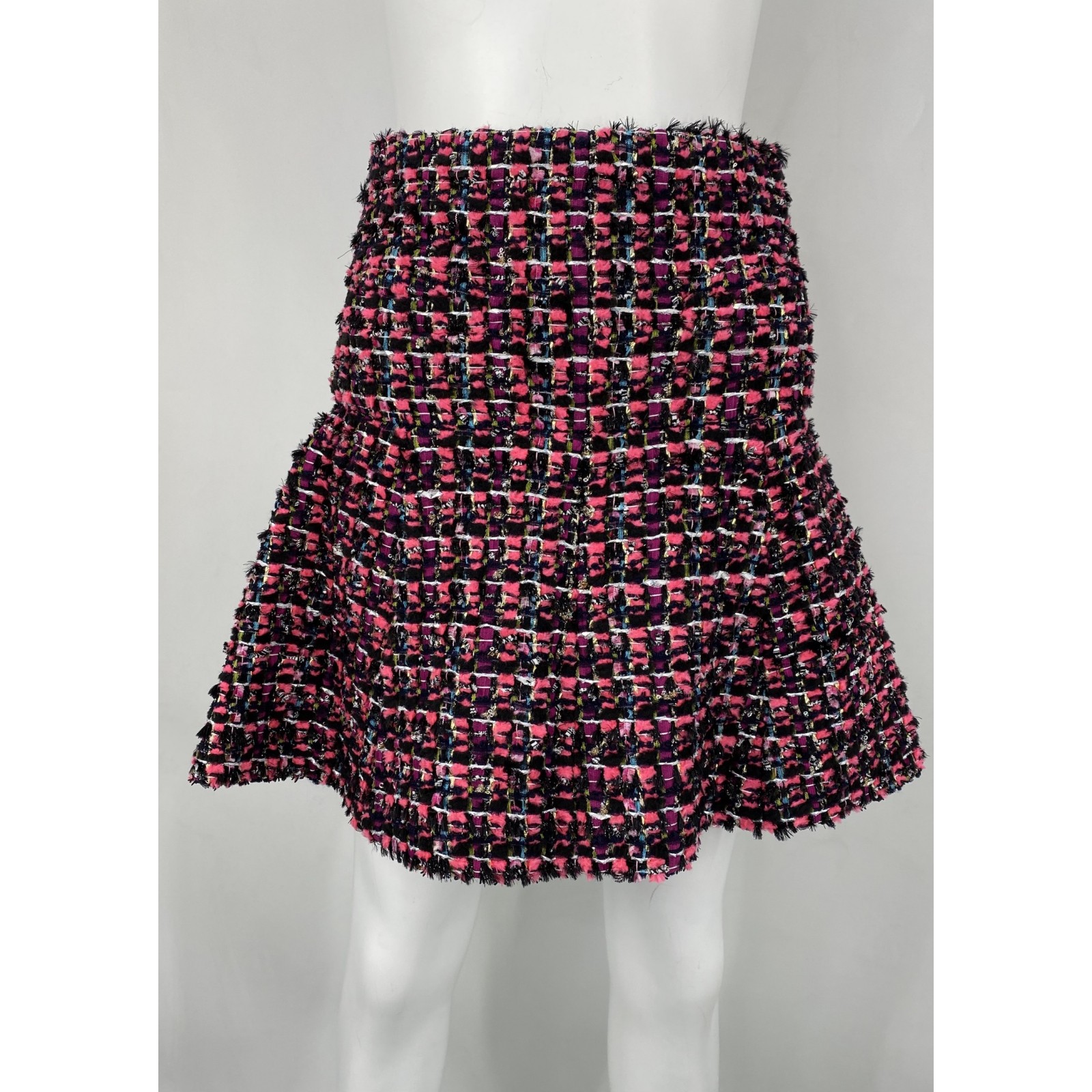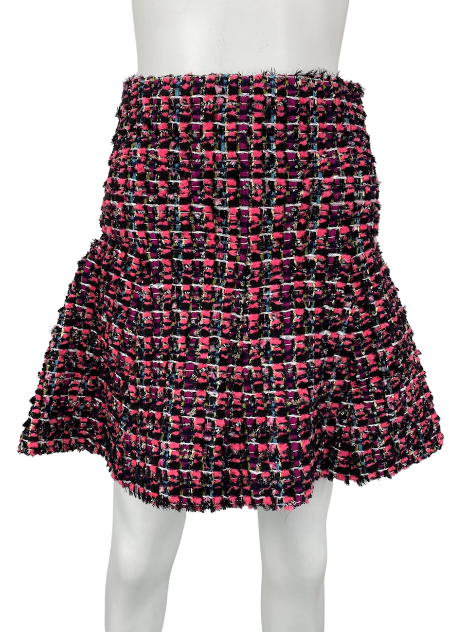 "tweedowa spódnica z wysokim stanem, rozkloszowana, kolorystyka różowo-czarno-szaro-błękitna, tył dłuższy, roz. 36, skład: 44% polyamid, 30% wełna, 10% bawełna, 9% acrylic, 5% polyester, 2% viskoza, podszewka: 100% jedwab. Wymiary: dł. przód 46cm, tył 52cm, szer. talia 35cm,"