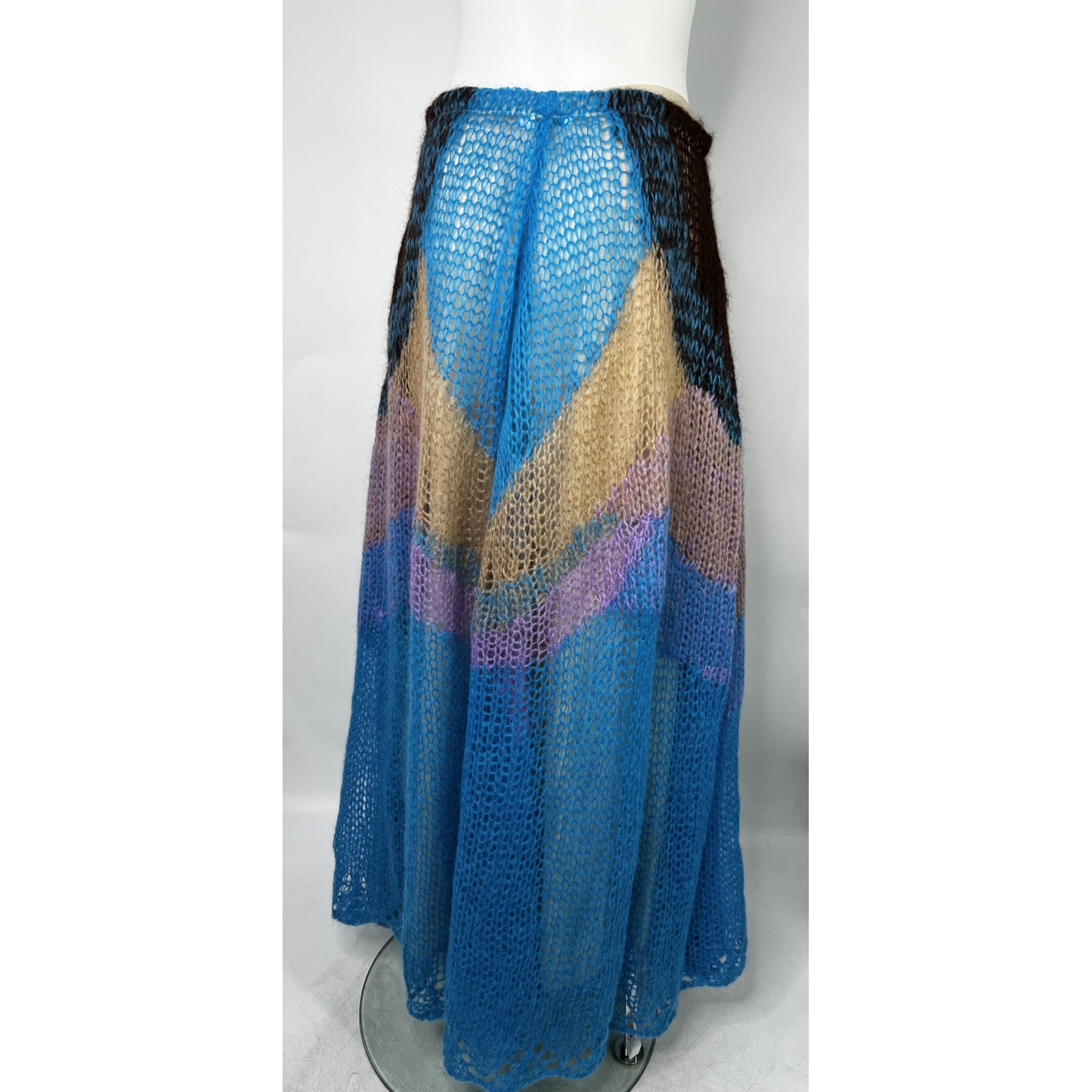 "wełniana, długa, ażurowa spódnica, w kolorach niebiesko-fioletowo-beżowo-brązowym, na gumce, oddzielna podszewka w kolorze beżowym. Brak metki z rozmiarem. Skład: 7% mohair 5% virgin wool 28% polyamide. Wymiary: szer. talii 38 cm, dł. całkowita 105 cm, podszewka: szer. talii 37 cm, szer. bioder 45 cm, dł. całkowita 95 cm."