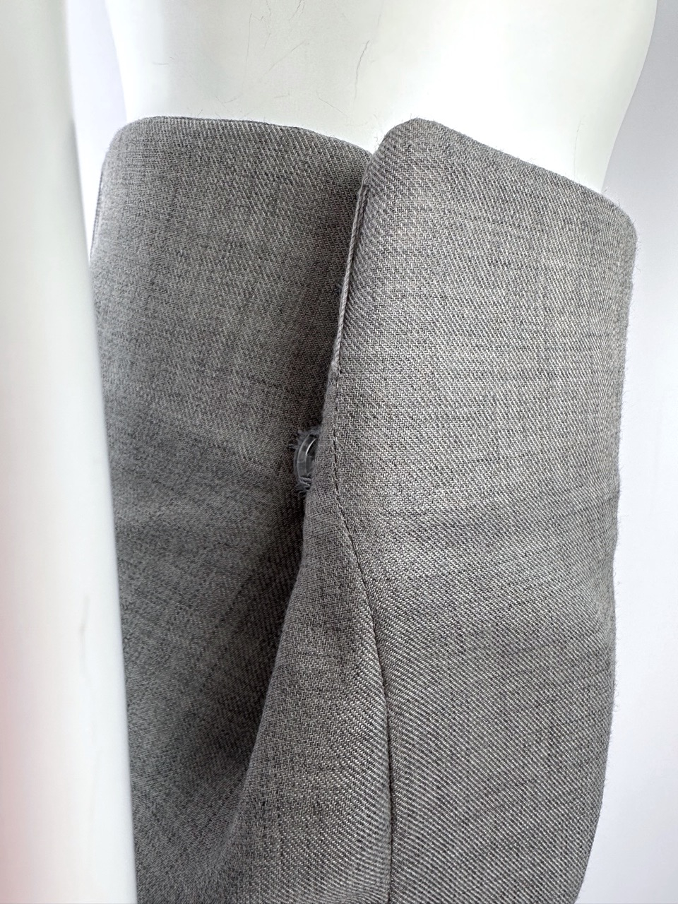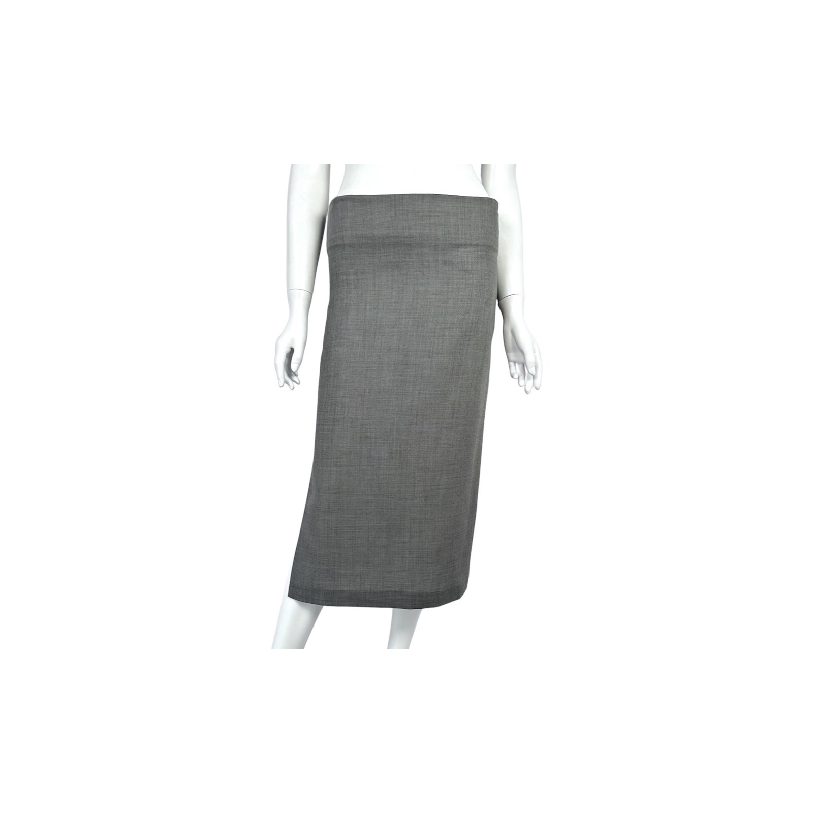 "szara ołówkowa spódnica midi, z boku rozcięcie, w talii gumka oraz zatrzaski z jednej strony. Rozmiar 38. Skład: 90% poliester, 10% wełna. Wymiary: szer. talii 41 cm, szer. bioder 44 cm, dł. całkowita 56 cm."