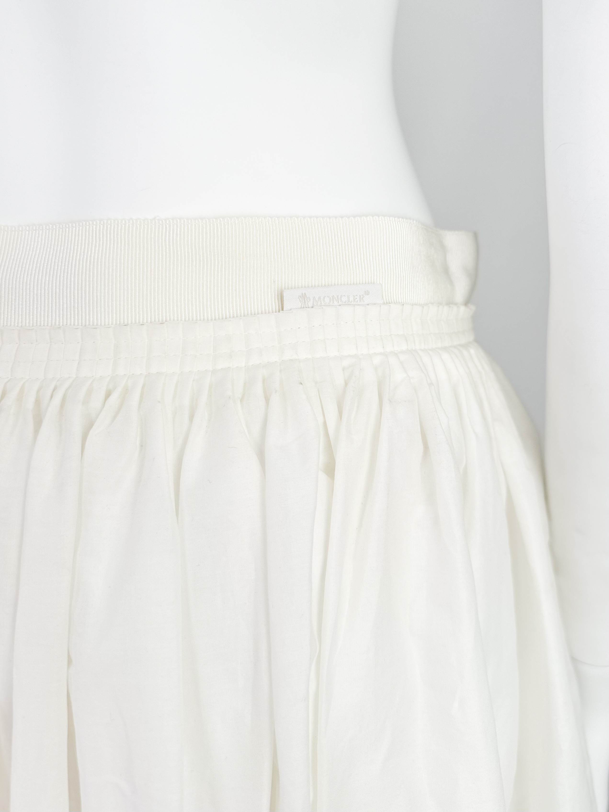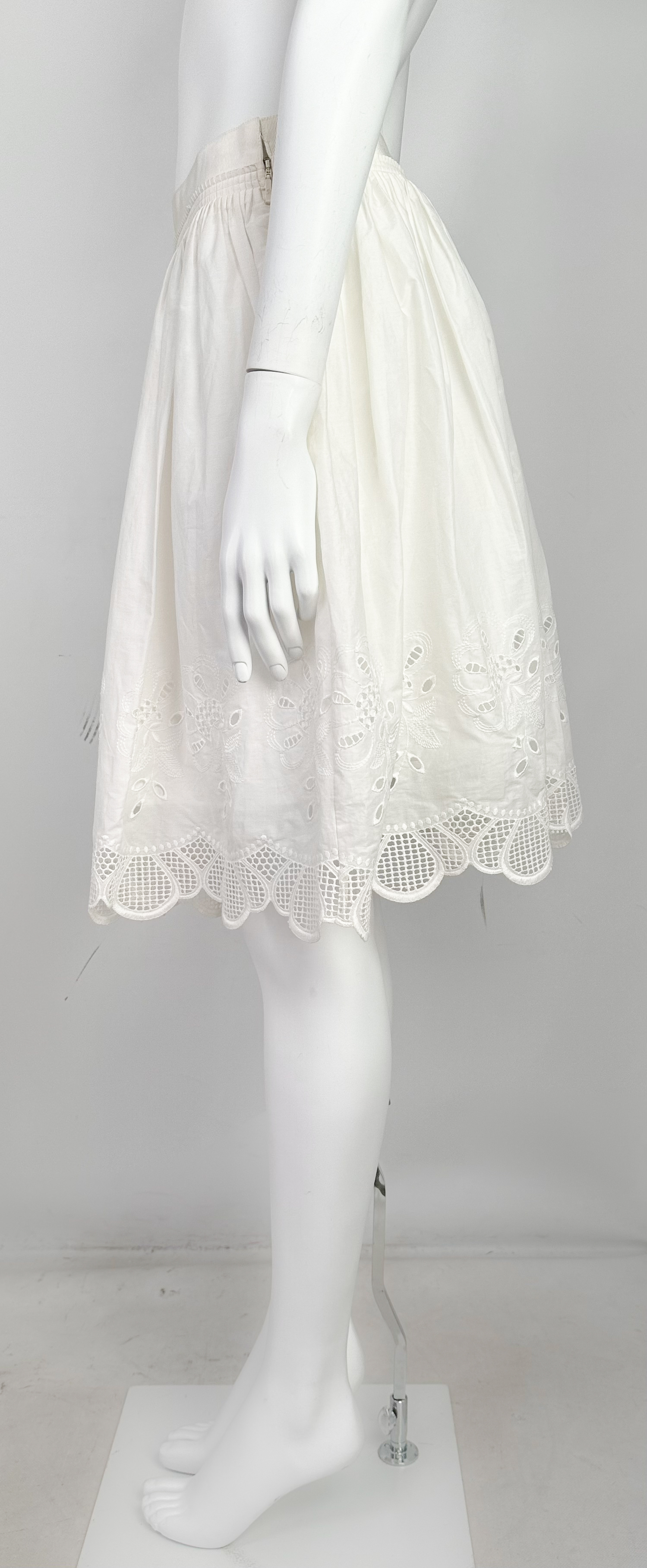 "Bawełniana spódnica w kolorze zgaszonej bieli wykończona haftowaniem o motywie kwiatowym, marszczona, rozkloszowany krój, długość do kolan, zapinana w bocznej części na kryty logowany suwak oraz dwie srebrne haftki, podszewka. Rozmiar z metki IT 44. Skład: 100% bawełna. Wymiary: szerokość w pasie 38cm, długość całkowita 57cm."
