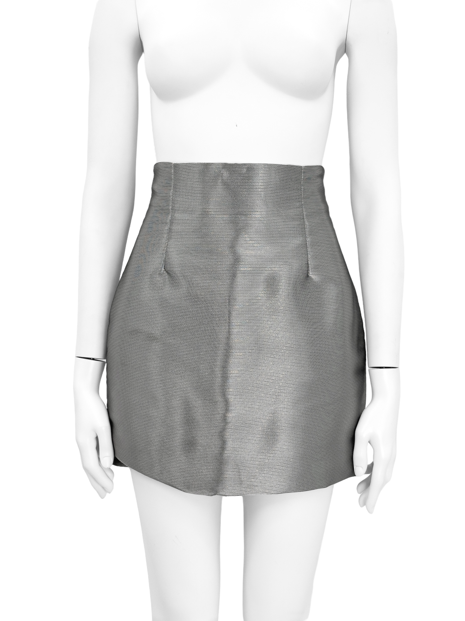 "Srebrno - metaliczna spódnica, długość przed kolano. Rozmiar z metki IT 42. Skład: 88% poliester, 22% materiał metaliczny. Wymiary: szerokość w pasie 36cm, długość całkowita 43cm."