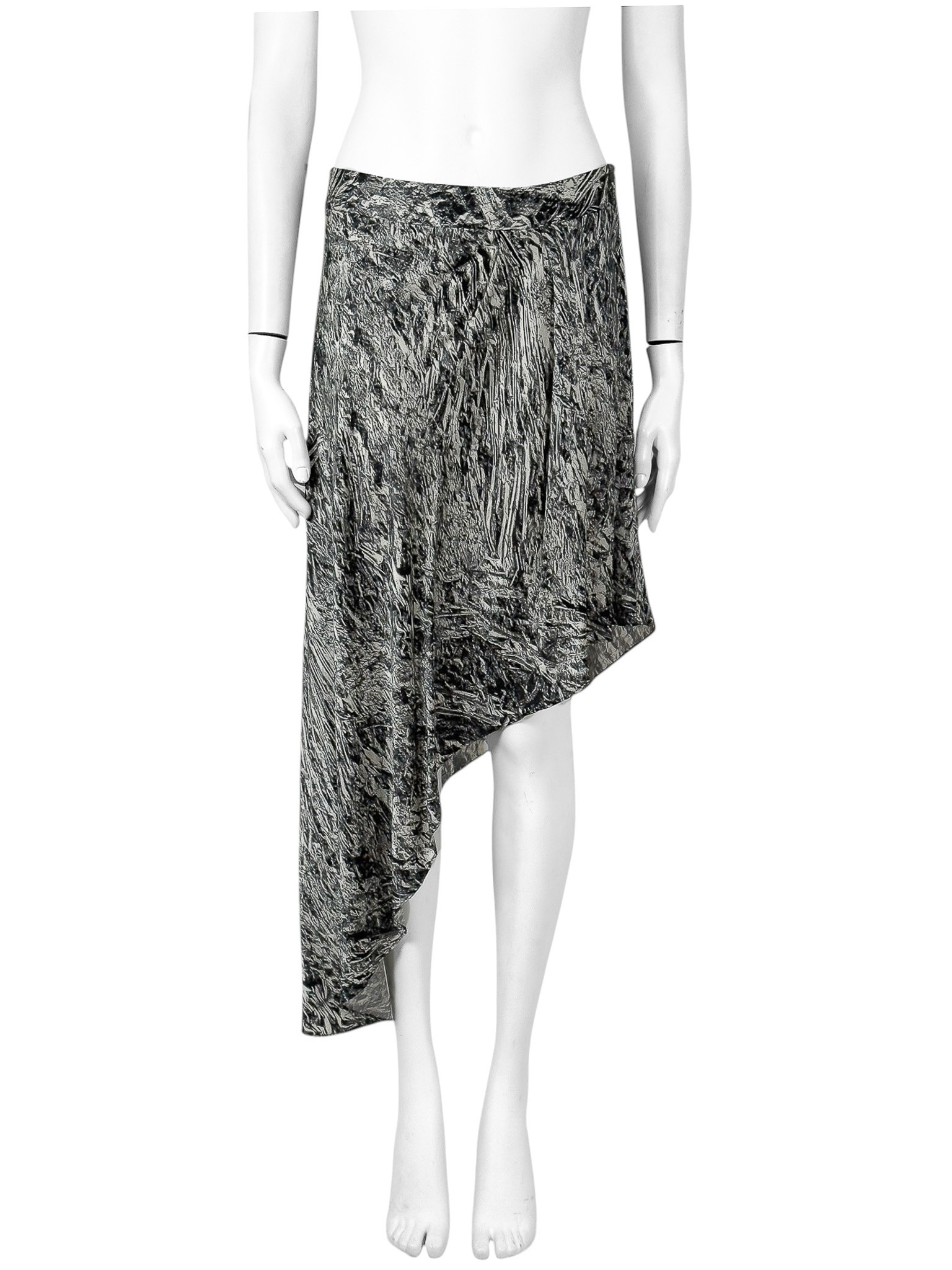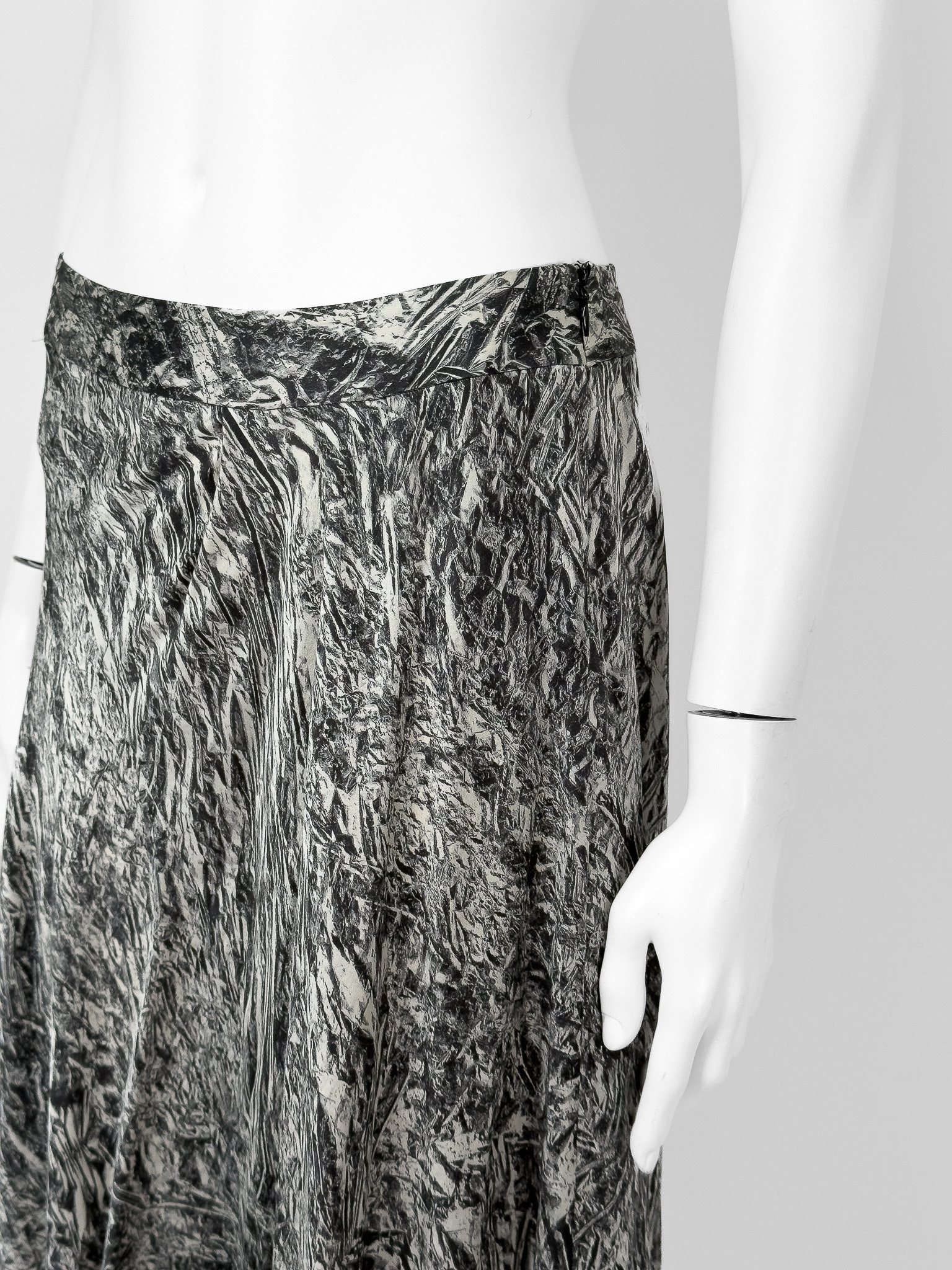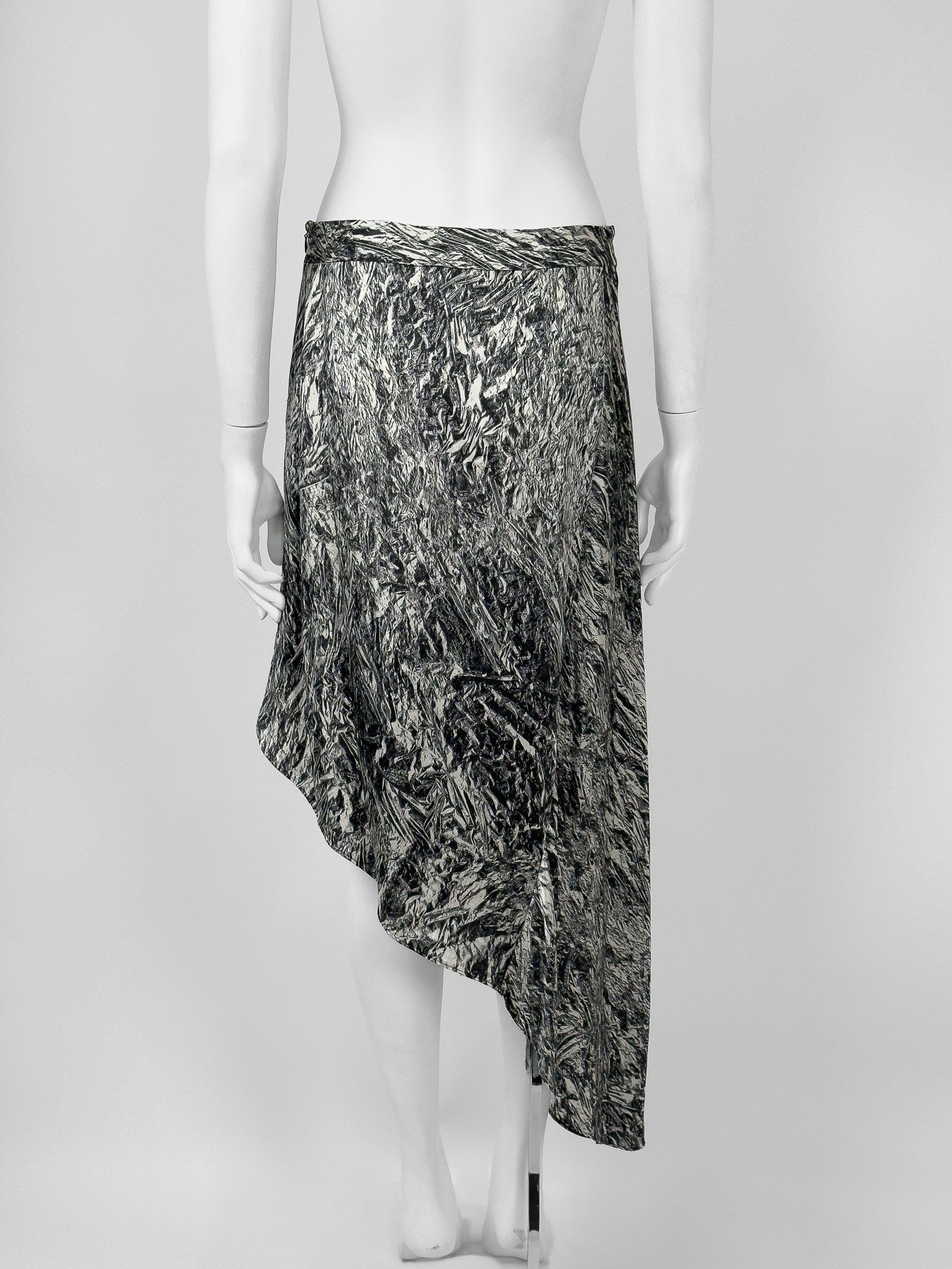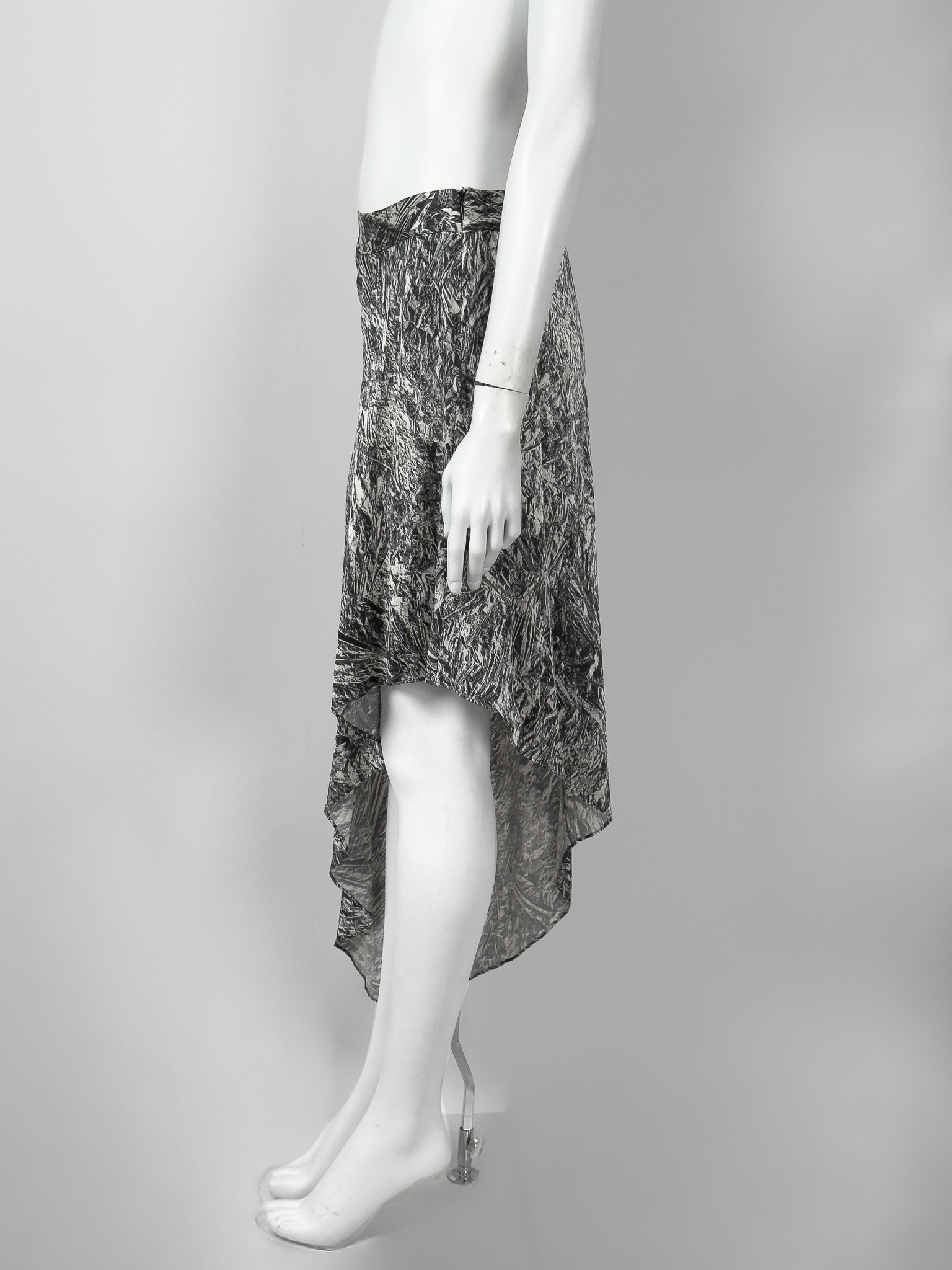 "Asymetryczna spódnica w grafitowo-biały wzór, zapinana z boku na kryty suwak. Brak metki z rozmiarem i składem. Wymiary: szerokość w pasie 39cm, długość całkowita 48cm."