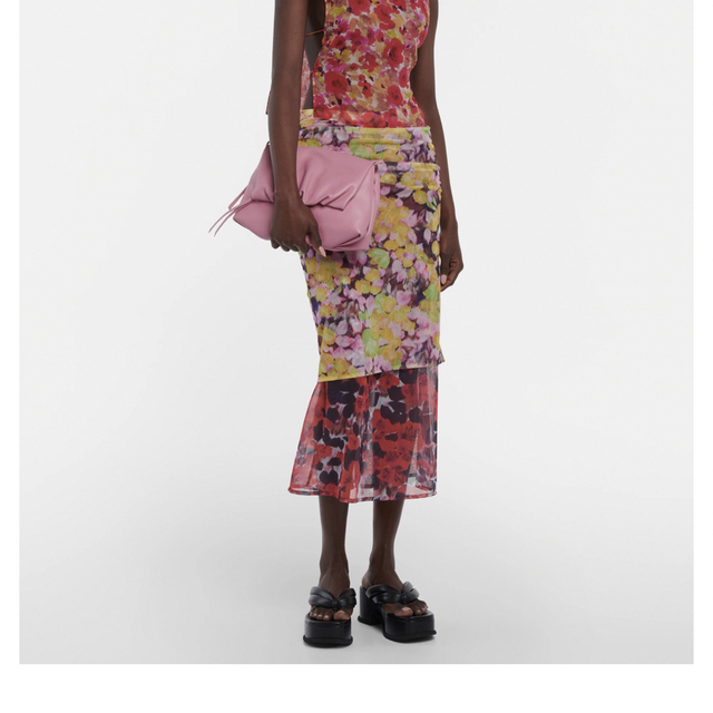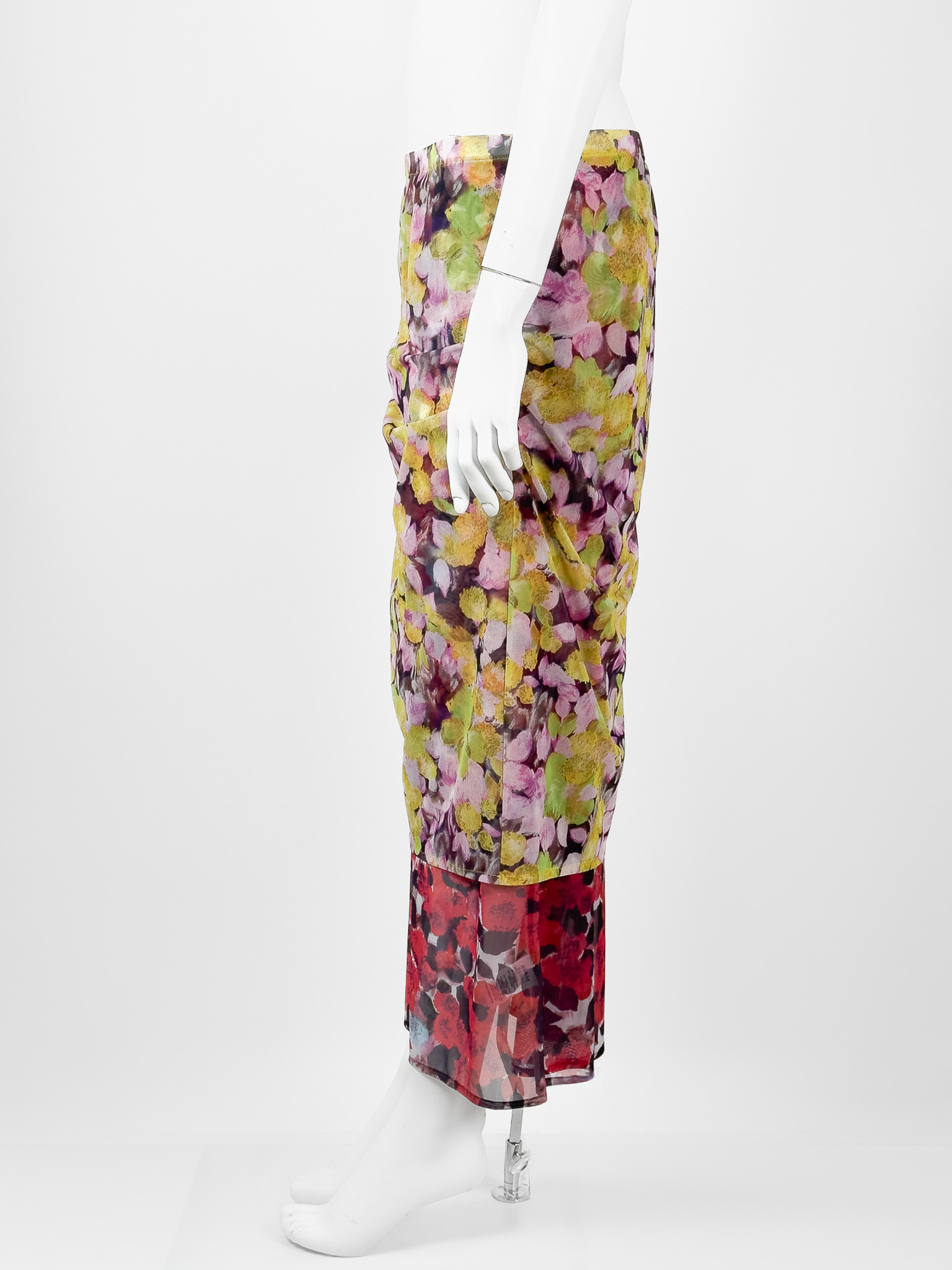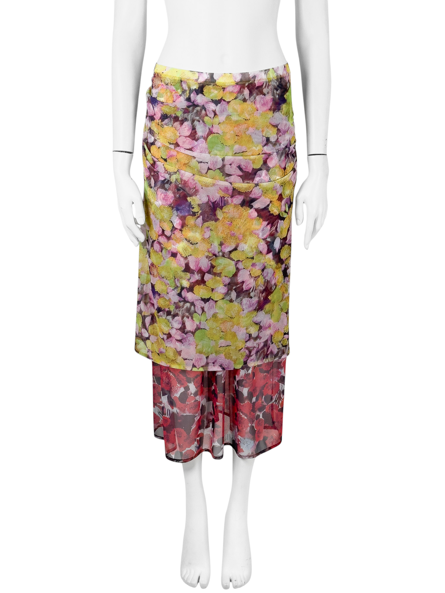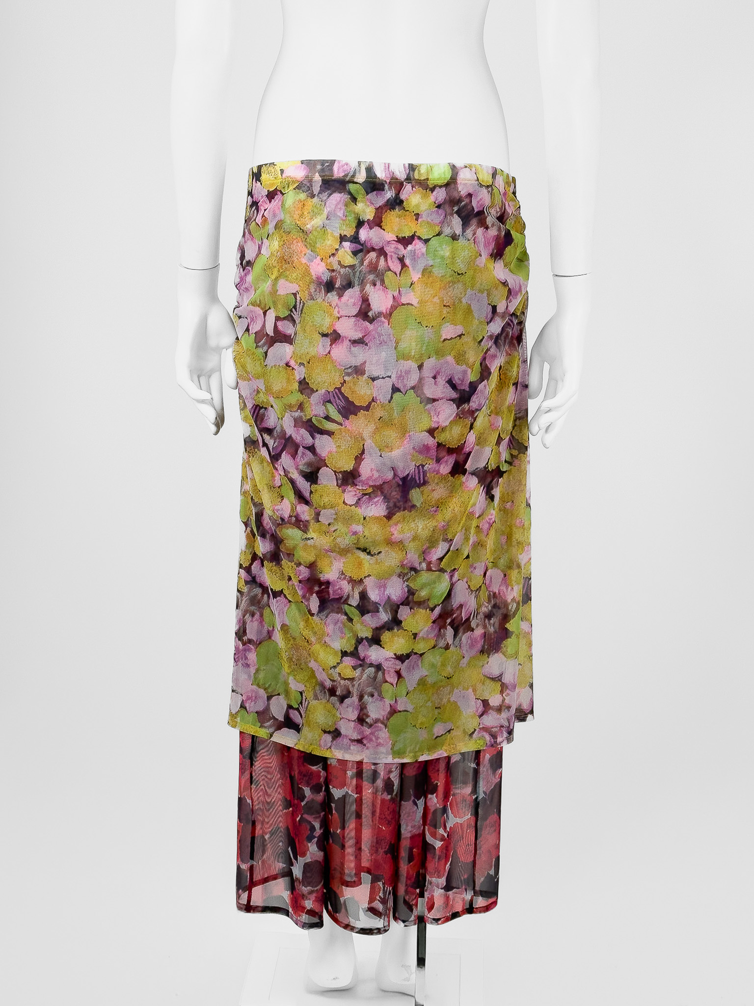 "Wielobarwna warstwowa spódnica ozdobiona dwoma wzorami kwiatów: zielono-żółto-różowym oraz czerwono-czarno-białym, długość midi, guma w pasie, delikatnie marszczona w bocznej części. Stan bardzo dobry. Rozmiar z metki L. Skład: 94% poliamid, 6% elastan. Wymiary: szerokość w pasie 40cm , długość całkowita 92cm. Kolekcja spring summer 2023r"
