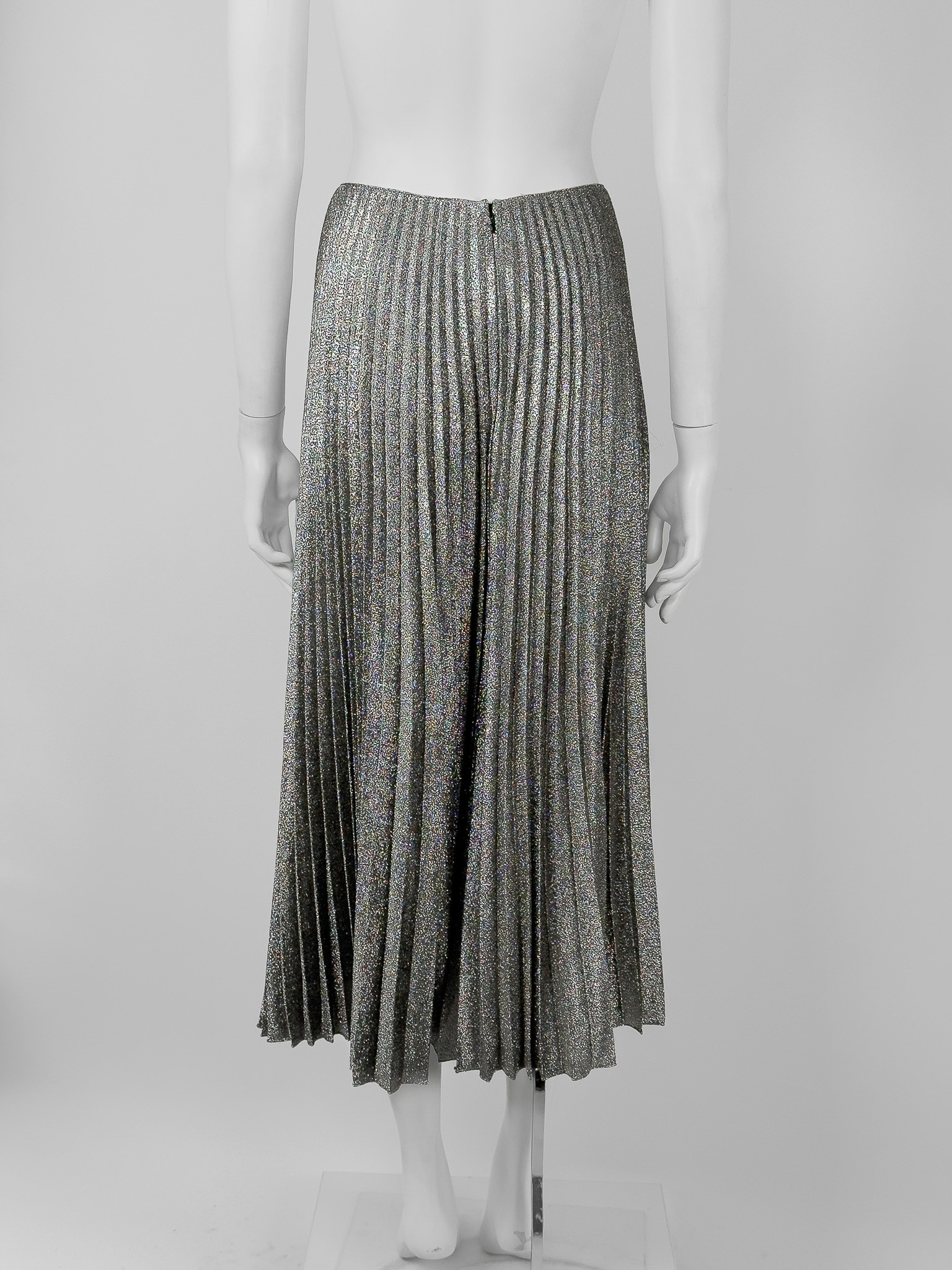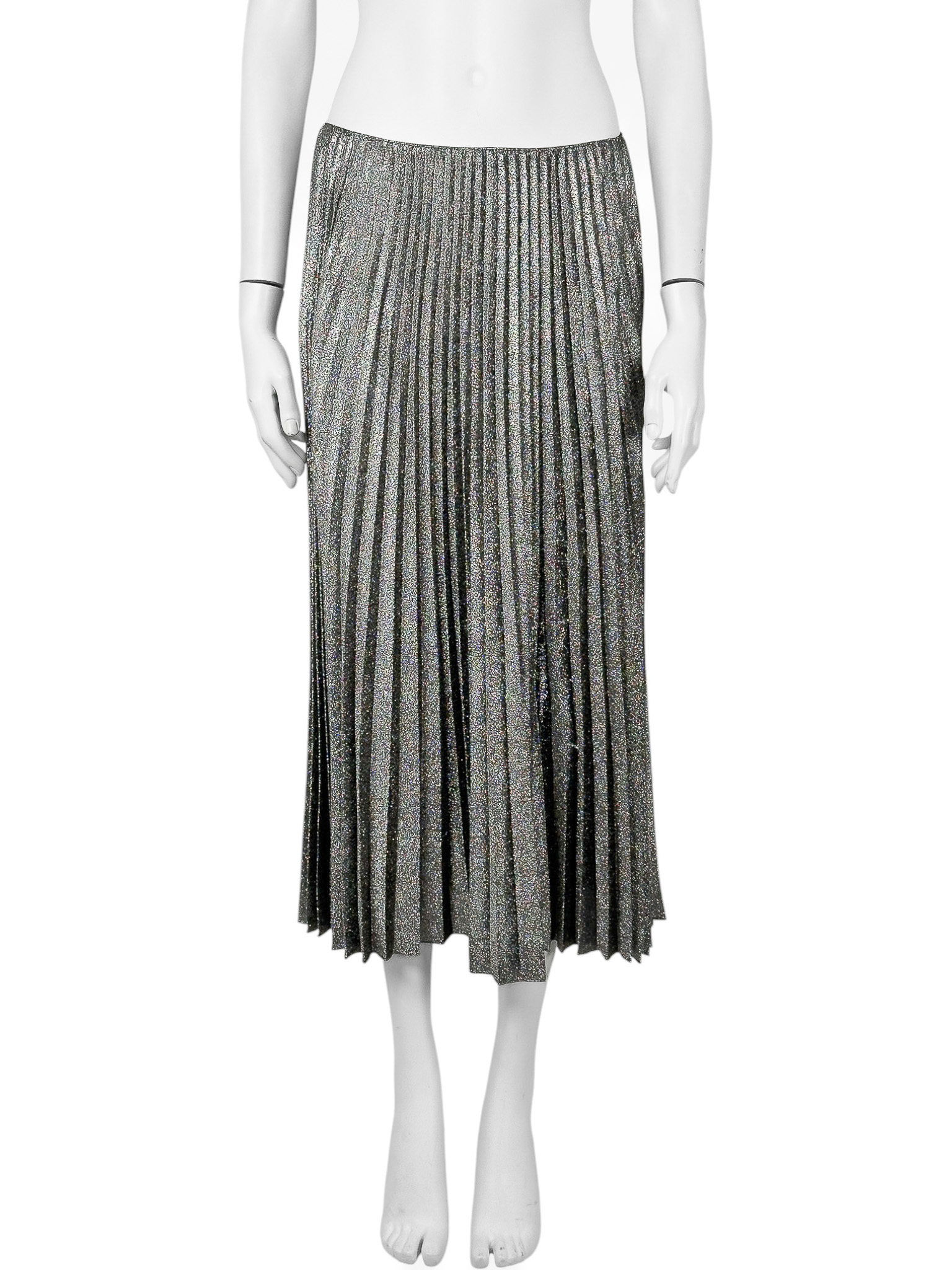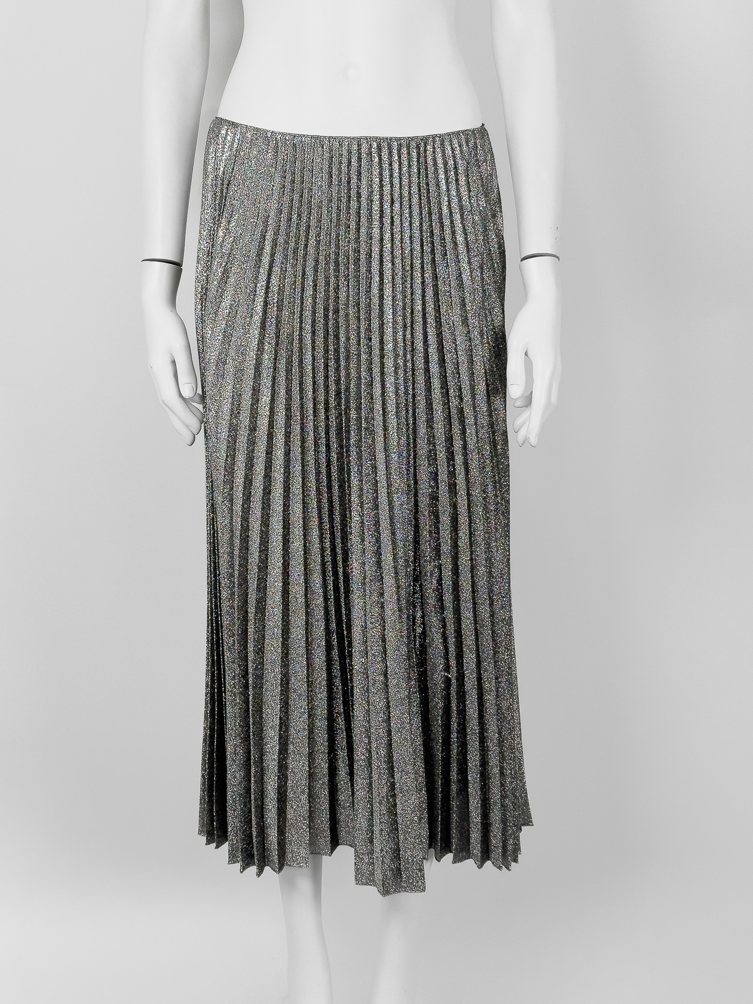 "Srebrna błyszcząca plisowana spódnica z domieszką jedwabiu w składzie, długość midi, rozkloszowany krój, zapinana w tylnej części na kryty suwak. Stan bardzo dobry. Rozmiar z metki IT 44. Skład: 60% jedwab, 35% poliester, 5% inne włókna. Wymiary: szerokość w pasie 39cm, długość całkowita 86cm."