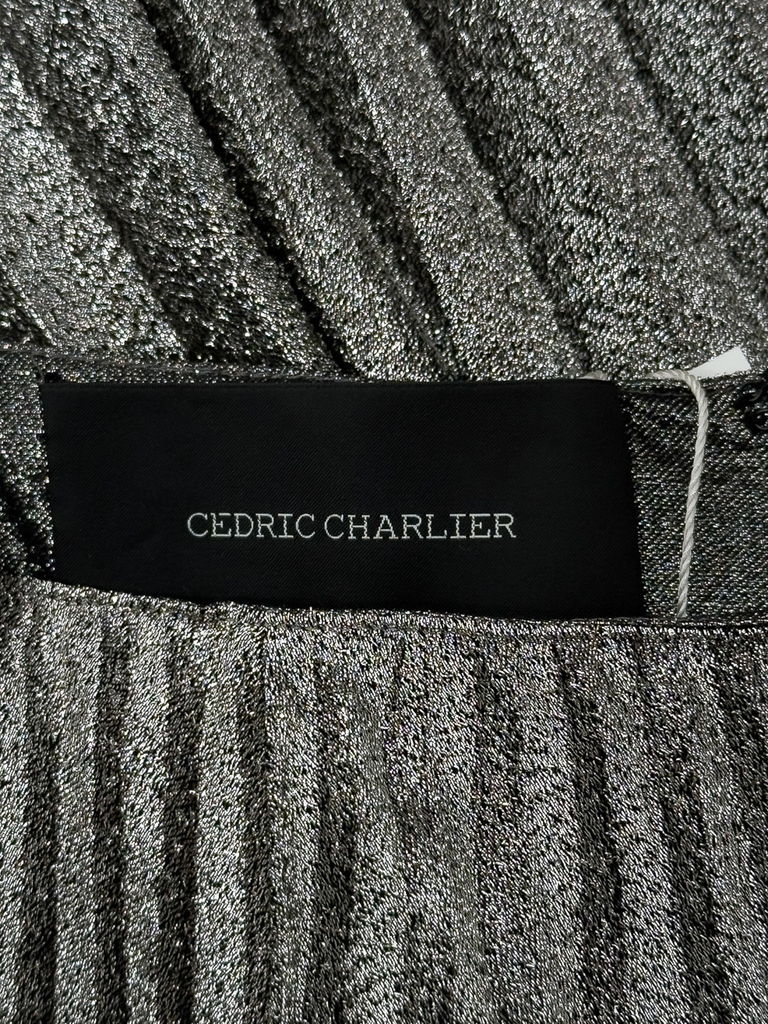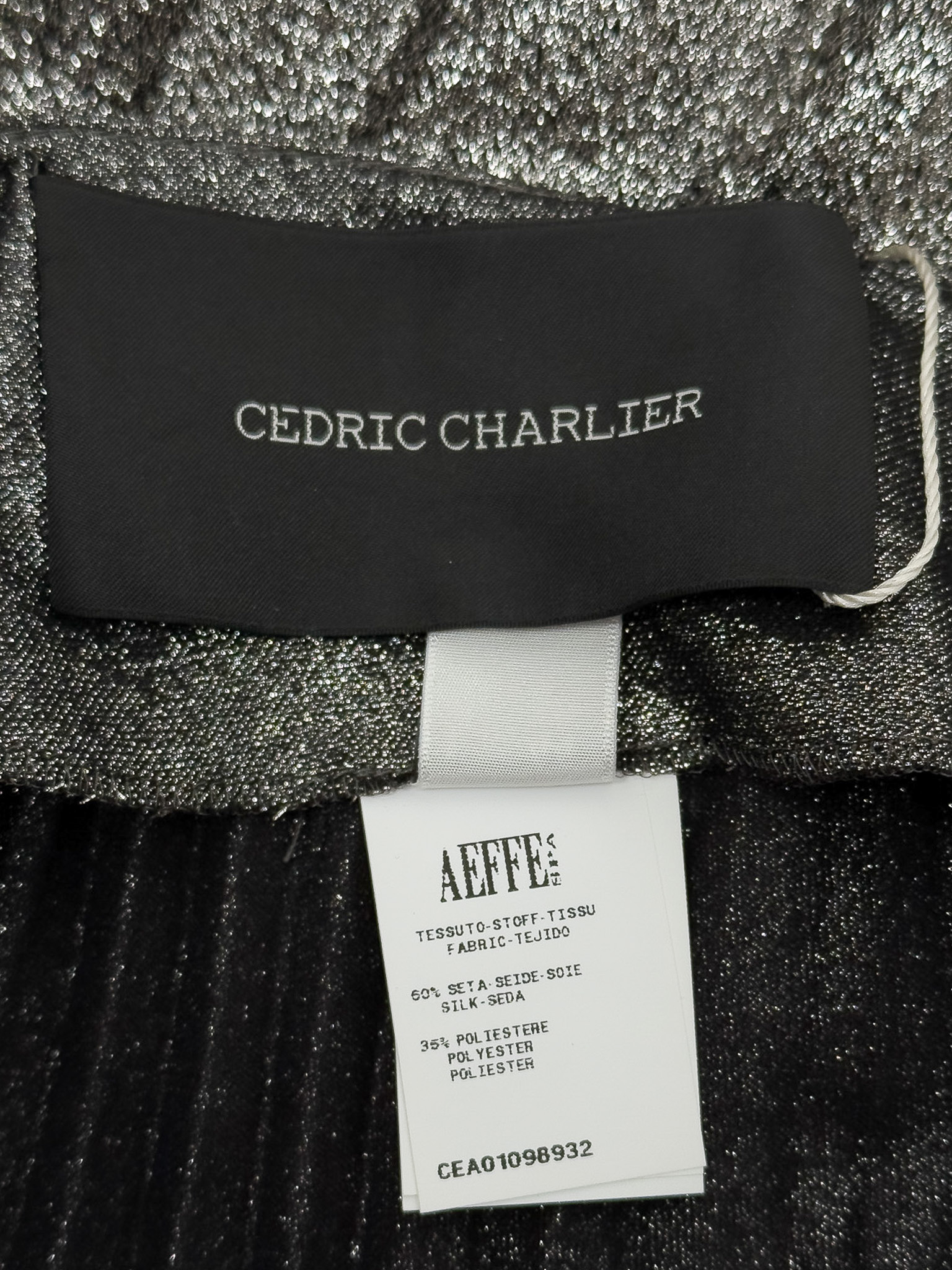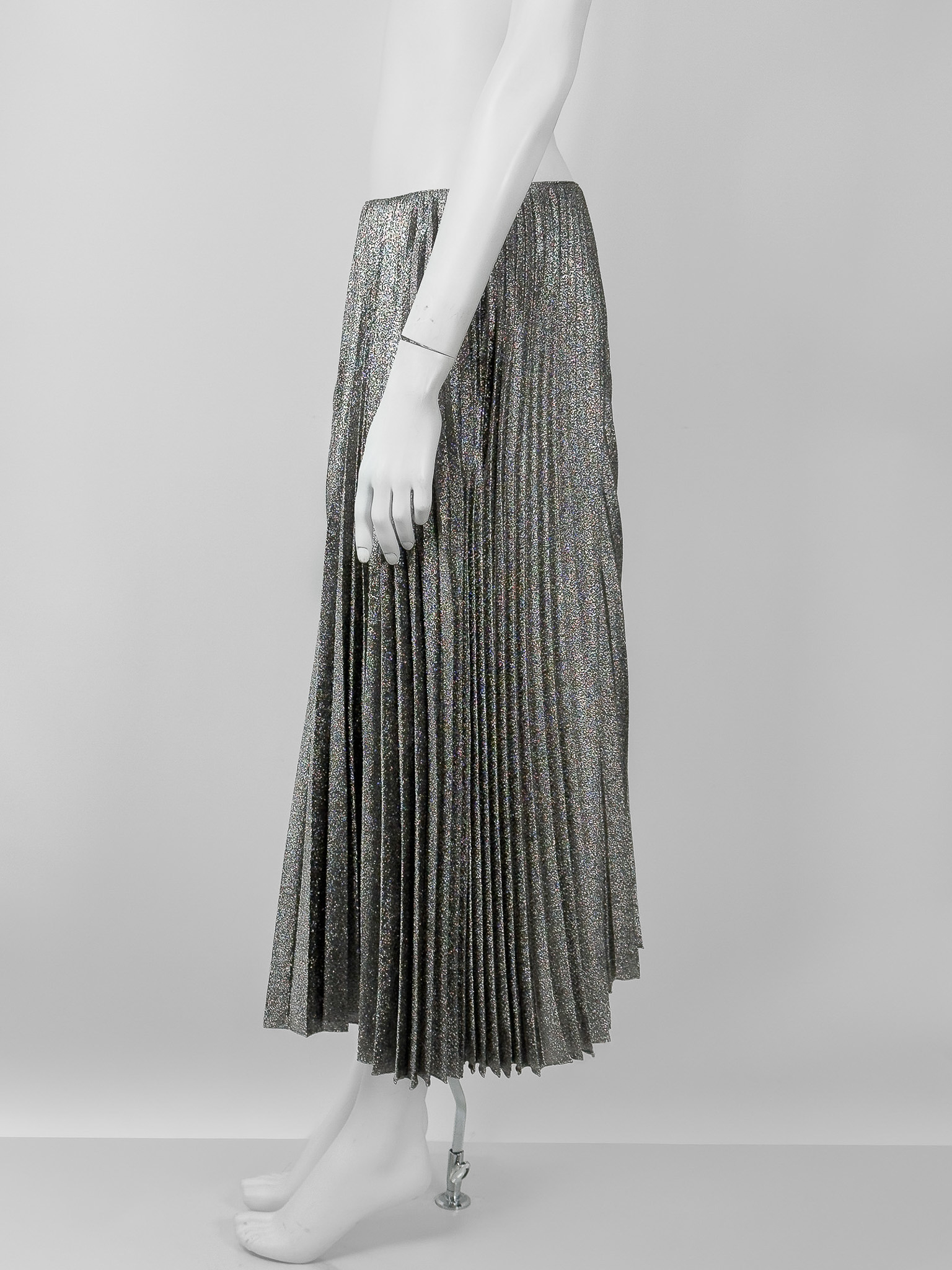 "Srebrna błyszcząca plisowana spódnica z domieszką jedwabiu w składzie, długość midi, rozkloszowany krój, zapinana w tylnej części na kryty suwak. Stan bardzo dobry. Rozmiar z metki IT 44. Skład: 60% jedwab, 35% poliester, 5% inne włókna. Wymiary: szerokość w pasie 39cm, długość całkowita 86cm."