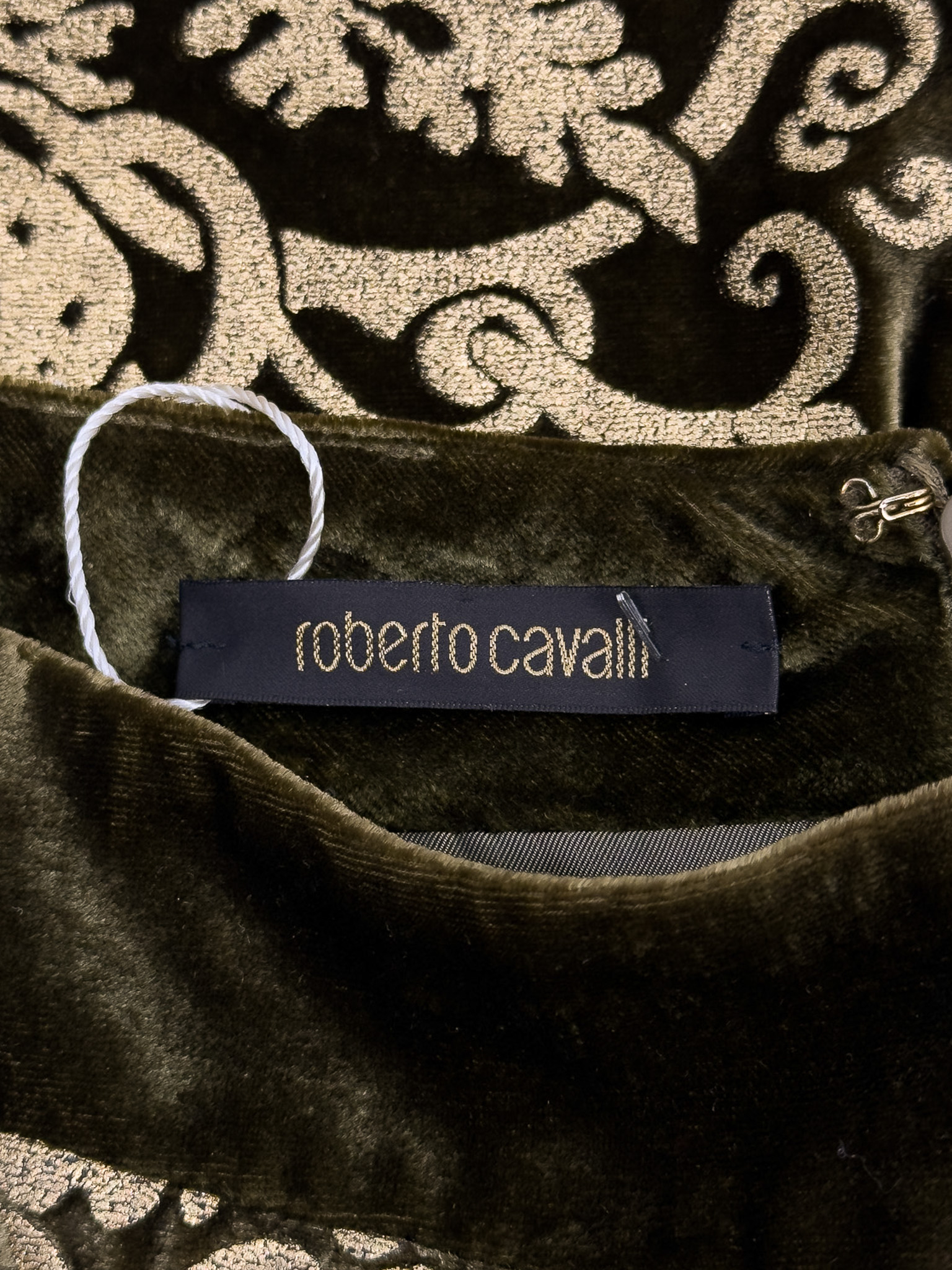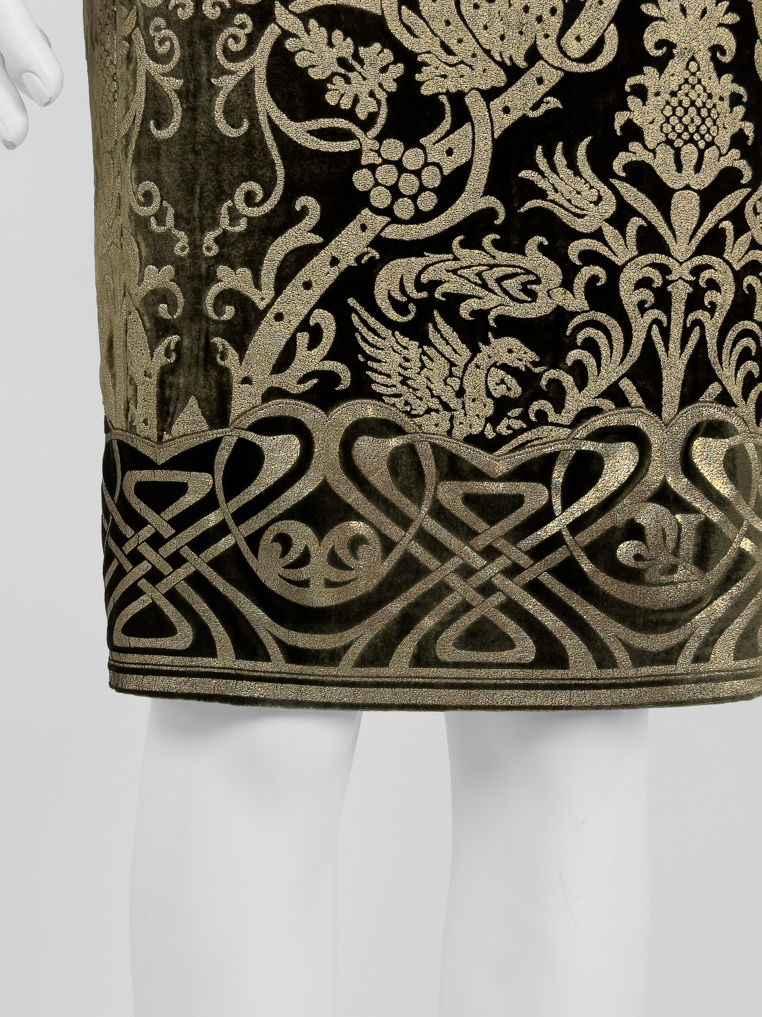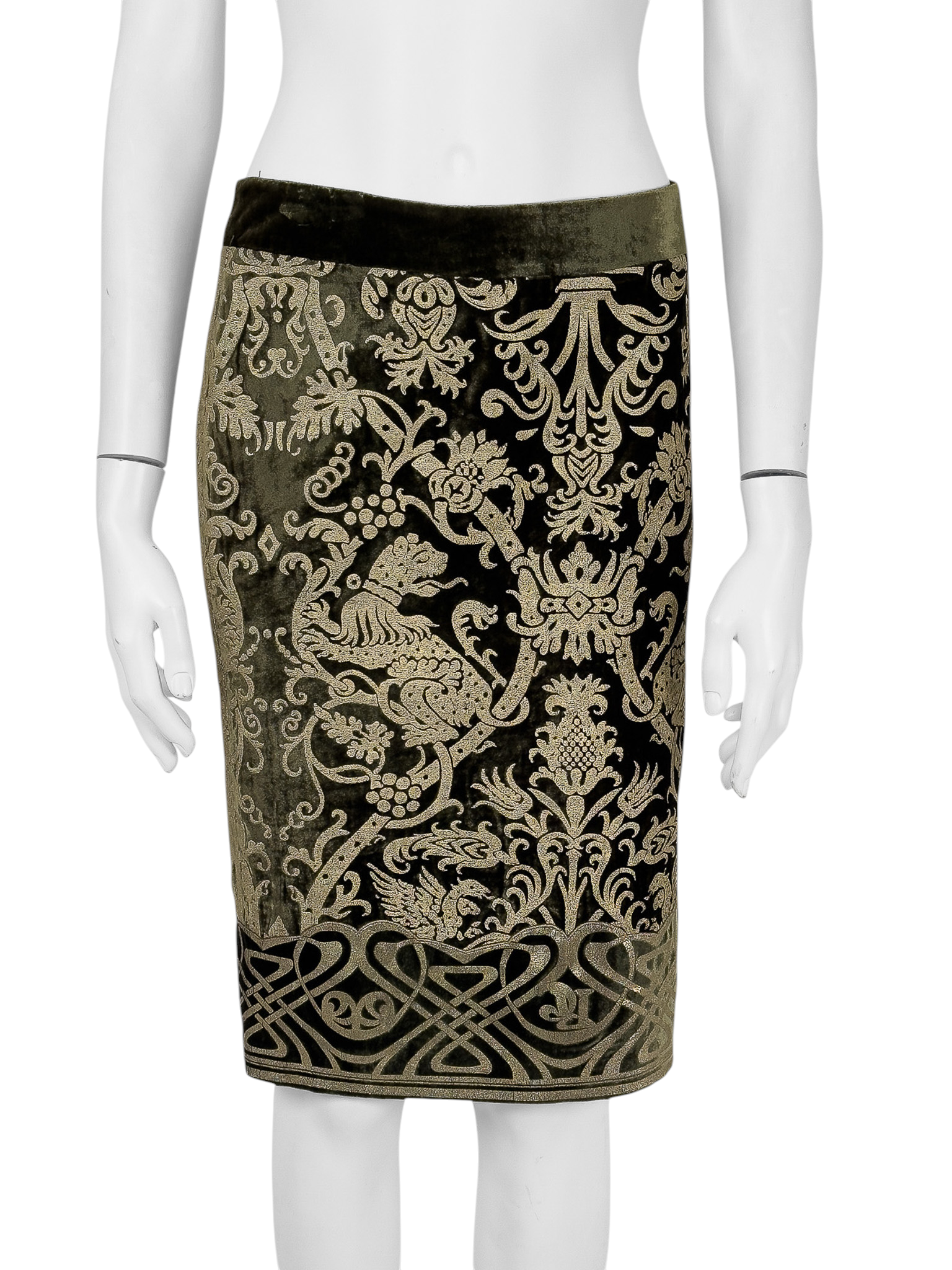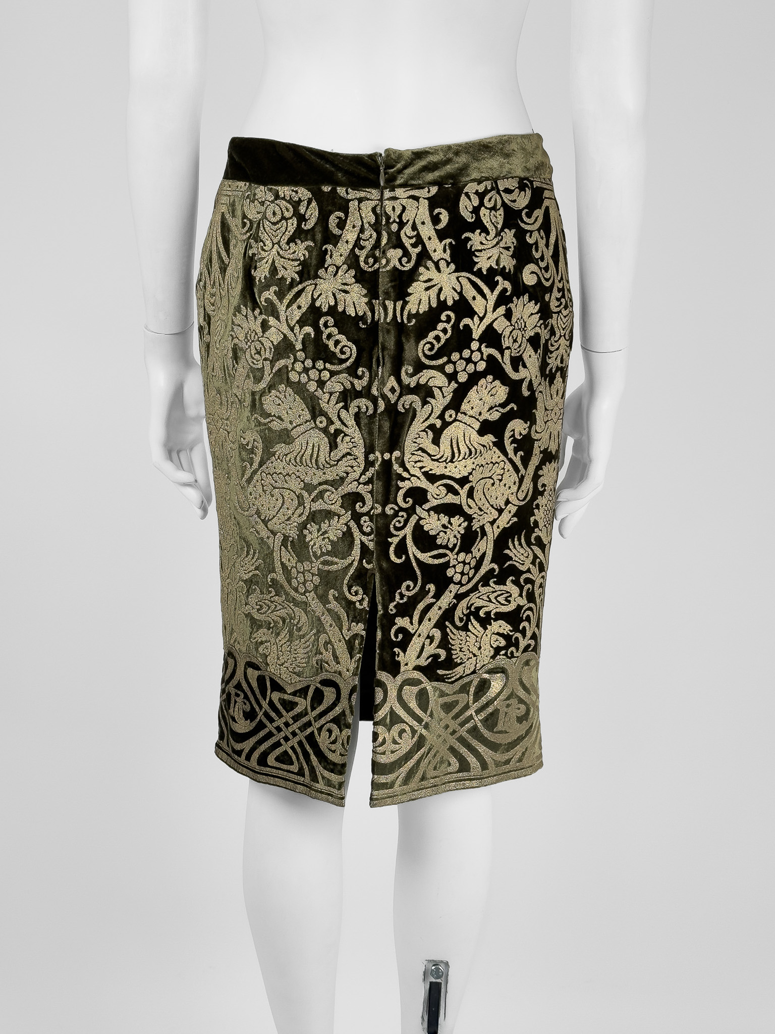 "Aksamitna spódnica w kolorze khaki ozdobiona złotym wzorem, zapinana na suwak ora haftkę, długość do kolan, ołówkowy krój, rozcięcie w tylnej części, logowana podszewka. Stan bardzo dobry, rozprucie przy suwaku. Rozmiar z metki IT 40. Skład: 16% jedwab, 82% wiskoza; podszewka: 100% kupro. Wymiary: szerokość w pasie 37,5cm, długość całkowita 59cm."
