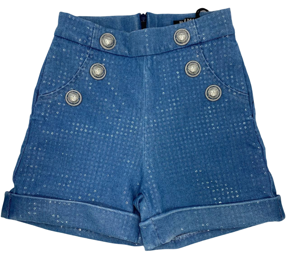 "krótkie jeansowe spodenki, wysoki stan, guziki srebrne logowane, imitacja cekinów po całości, nowe z metką, rozmiar 4A"