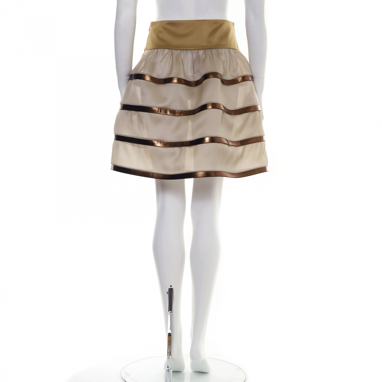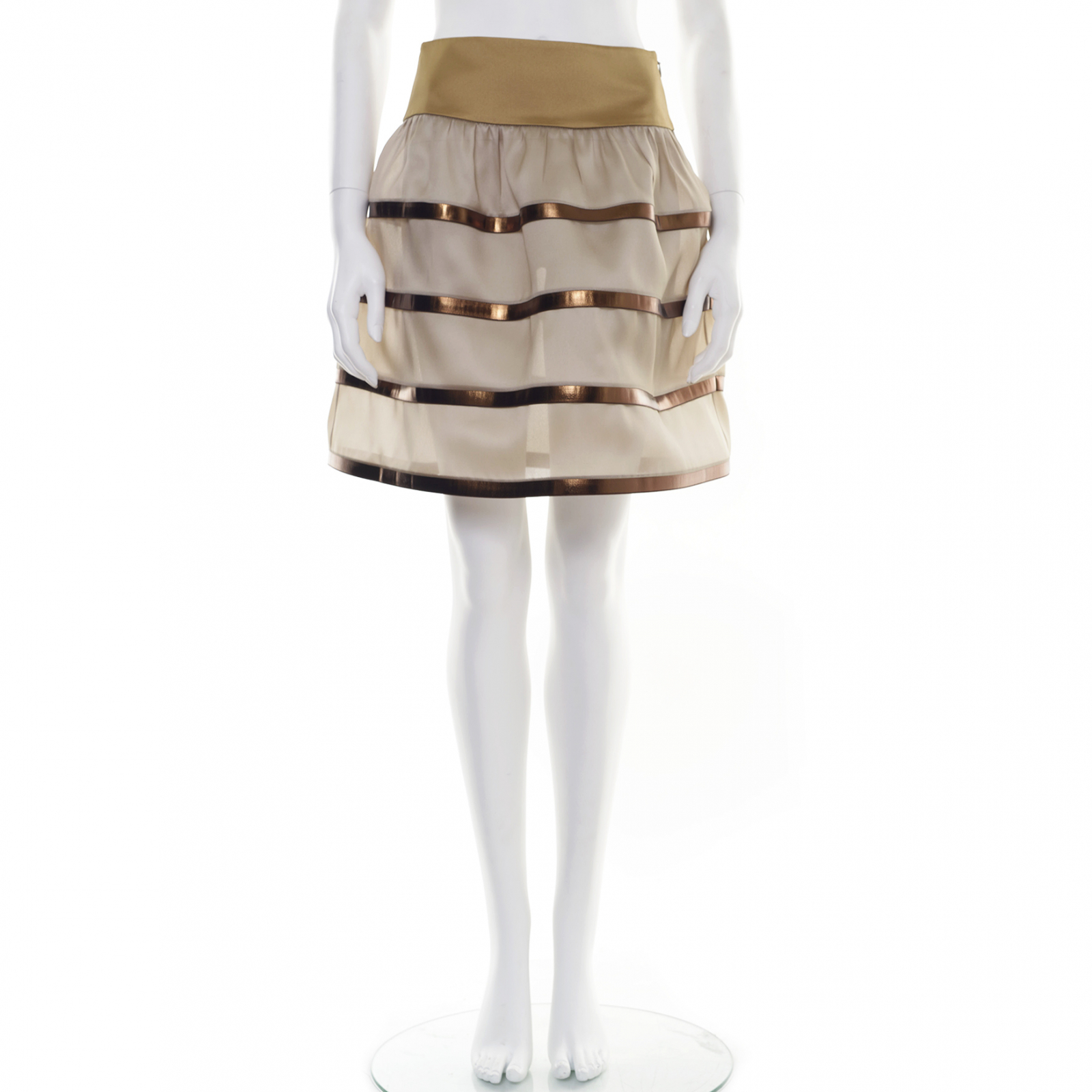 "Rozkloszowana ,transparentna spódnica z metalicznymi paskami , satynowa góra , złoty kolor. Wykonana z 100% jedwabiu , rozmiar S"