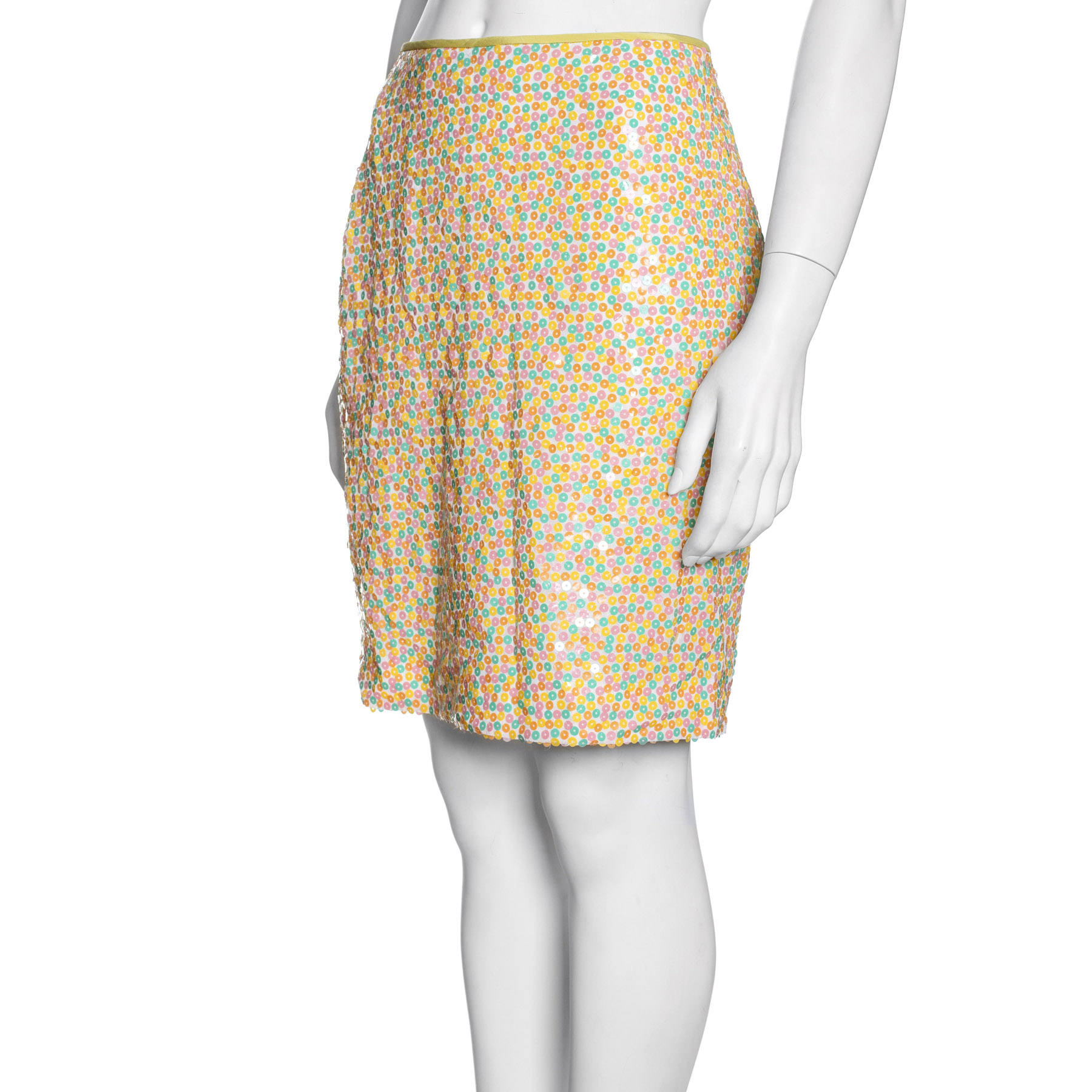 "spódnica w kolorową aplikację, żółta lamówka, rozmiar S; wymiary: pas 39 cm, biodra 50 cm, dł. całkowita 50 cm, skład: 100% polyester, podszewka 100% acetat"