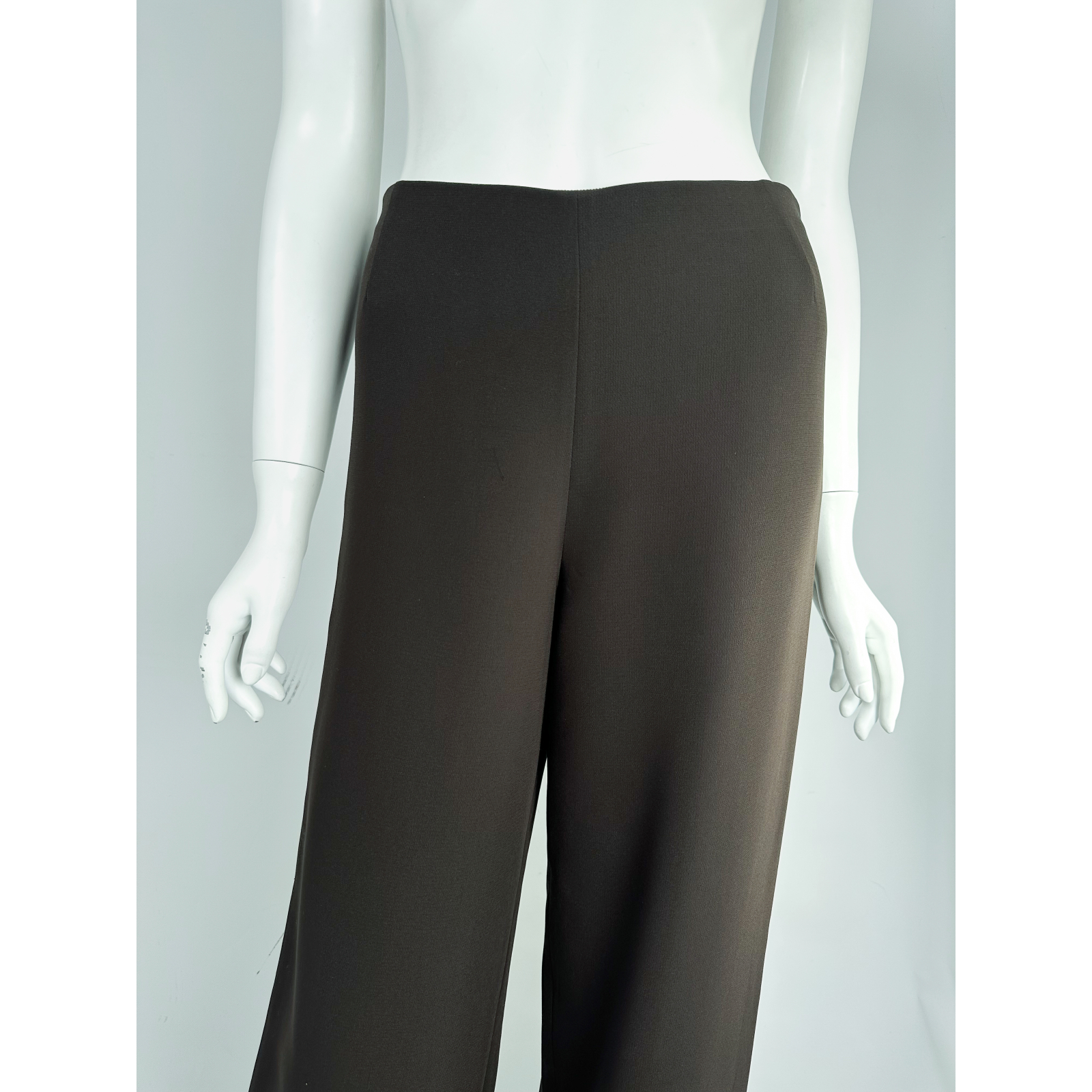 "Brązowe spodnie garniturowe, szeroka nogawka, wysoki stan. Rozmiar 0. Nowe z metkami. Skład: 69% triacetat, 31% poliester, podszewka 100% jedwab. Wymiary: szerokość w pasie 36cm, długość całkowita mierzona od zewnętrznej strony nogawki 107cm."
