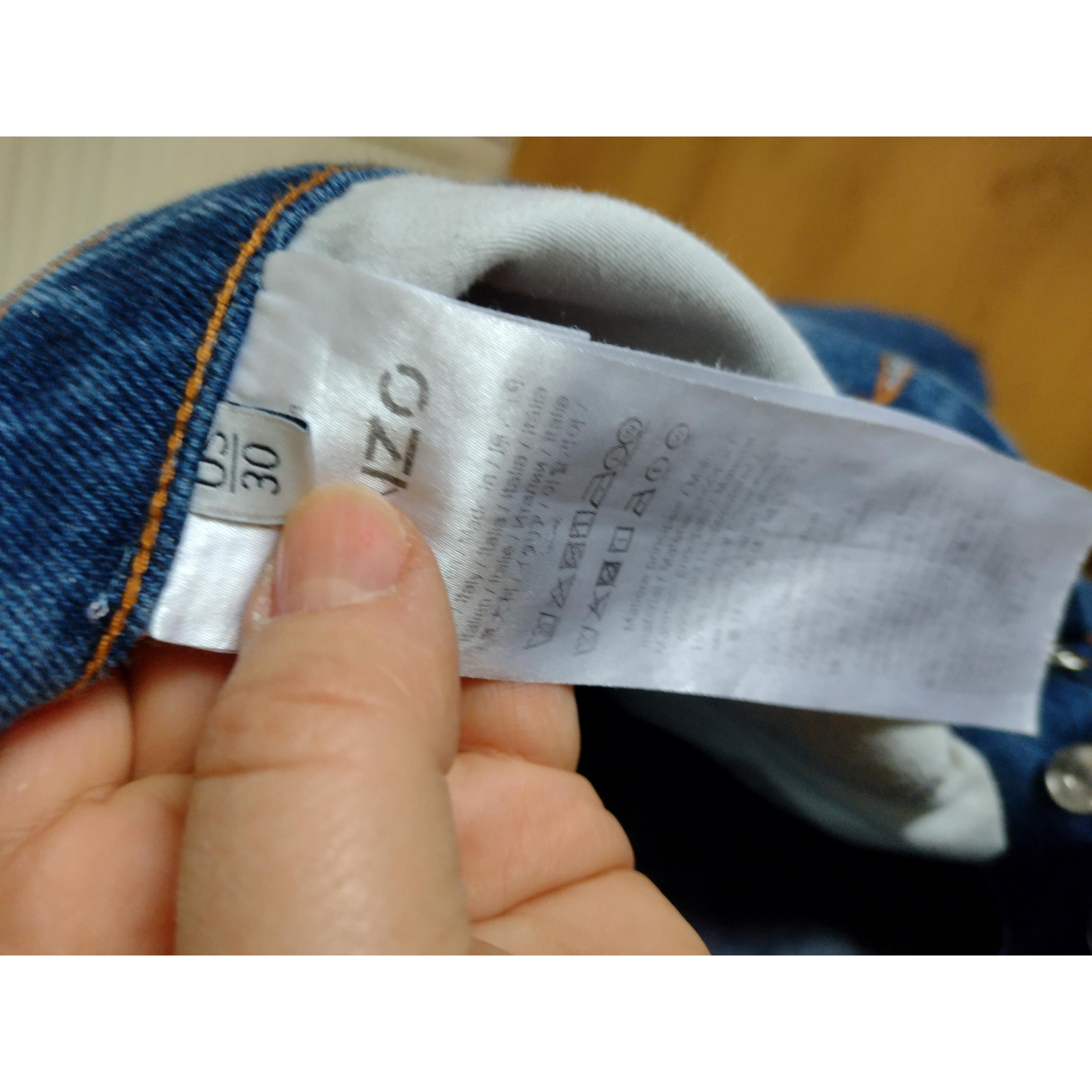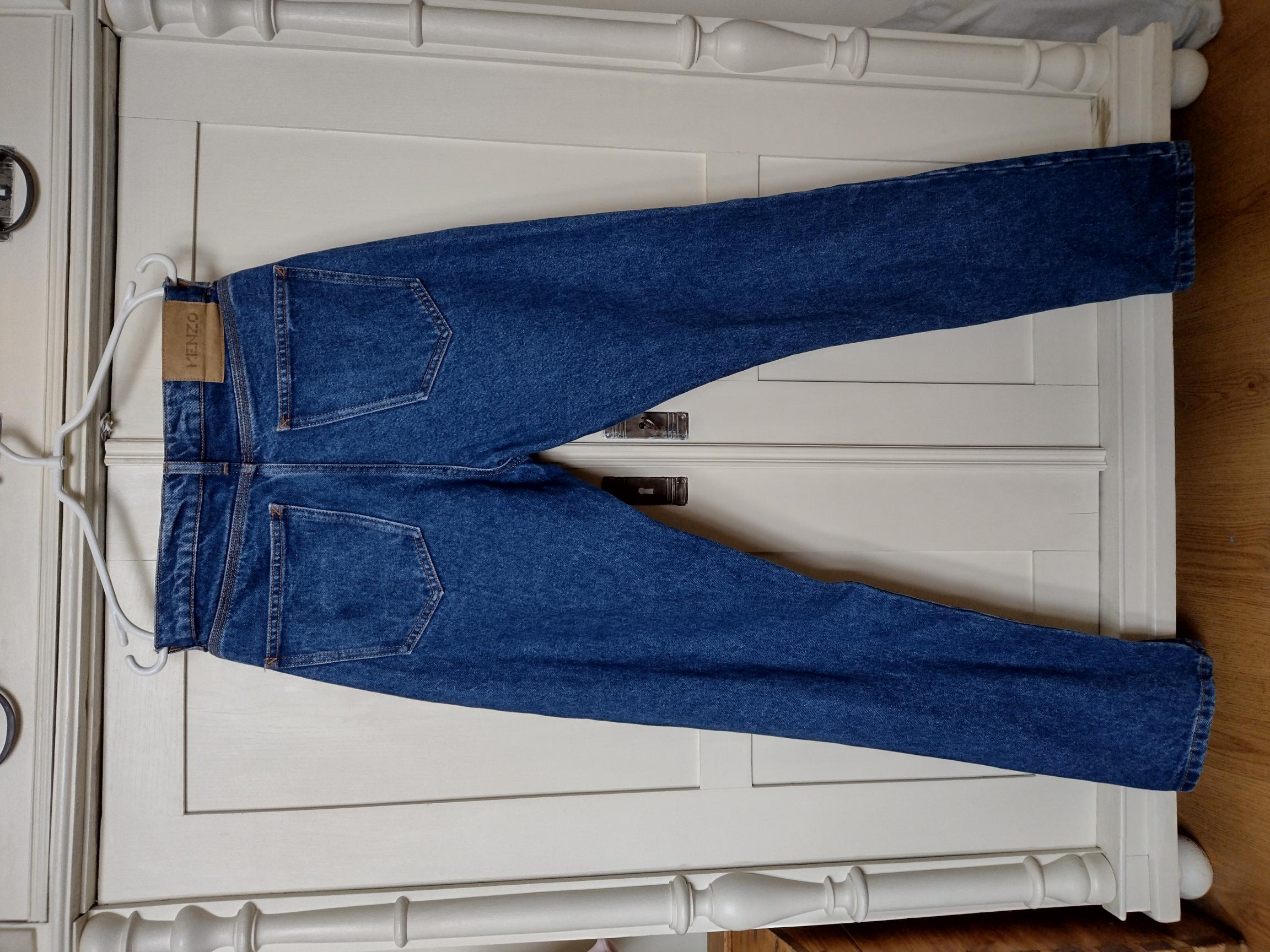 "Spodnie jeansowe Kenzo, stan bardzo dobry- z boku na prawej nogawce lekkie obtarcie na szwie, rozmiar 30 długość 104 cm pas 76 cm stan 27 cm biodra 95 cm , zapinane na guziki"
