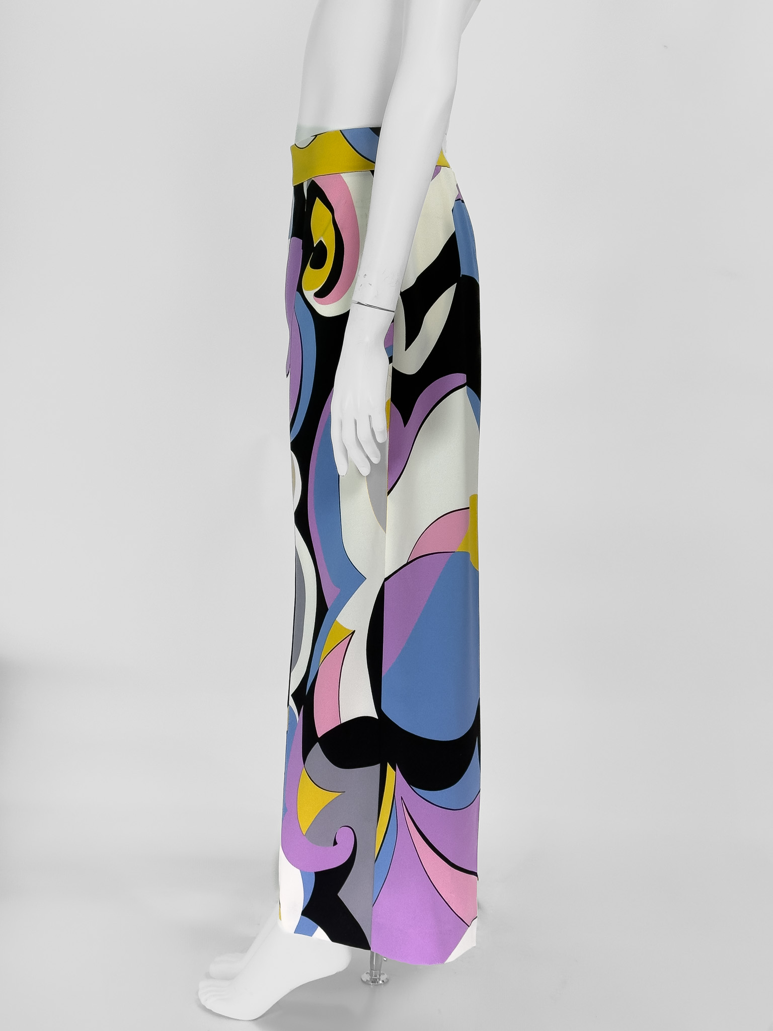 "Wielobarwne spodnie z szeroką nogawką w pastelowych kolorach, zapinane z tyłu na zamek. Stan bardzo dobry. Rozmiar z metki IT 46. Skład: 100% poliester. Wymiary: szerokość w pasie 41cm, długość całkowita mierzona od zewnętrznej strony nogawki 105cm."