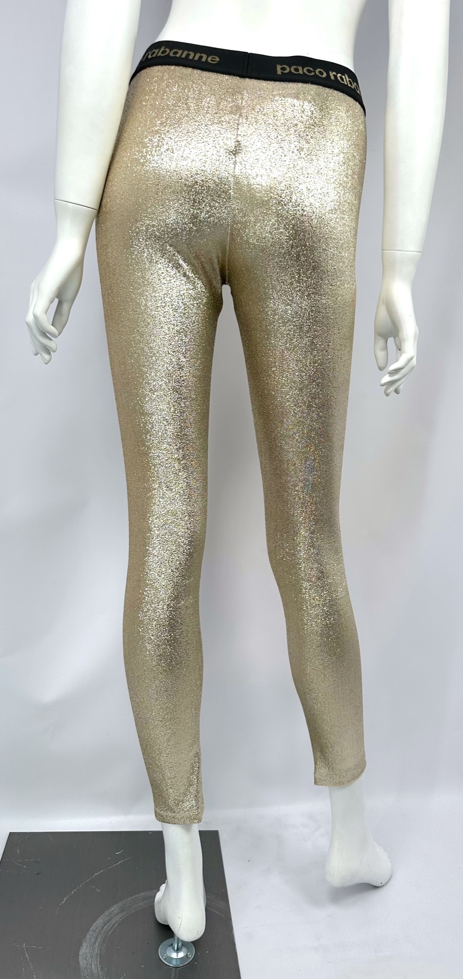 "złoto brokatowe legginsy, czarna guma w pasie z logiem, lampasy z logiem. Rozmiar M. Skład: 75% wiskoza, 20% poliester, 5% elastan. Wymiary: szer. talii 33 cm, szer. bioder 35 cm, dł. całkowita 92 cm."