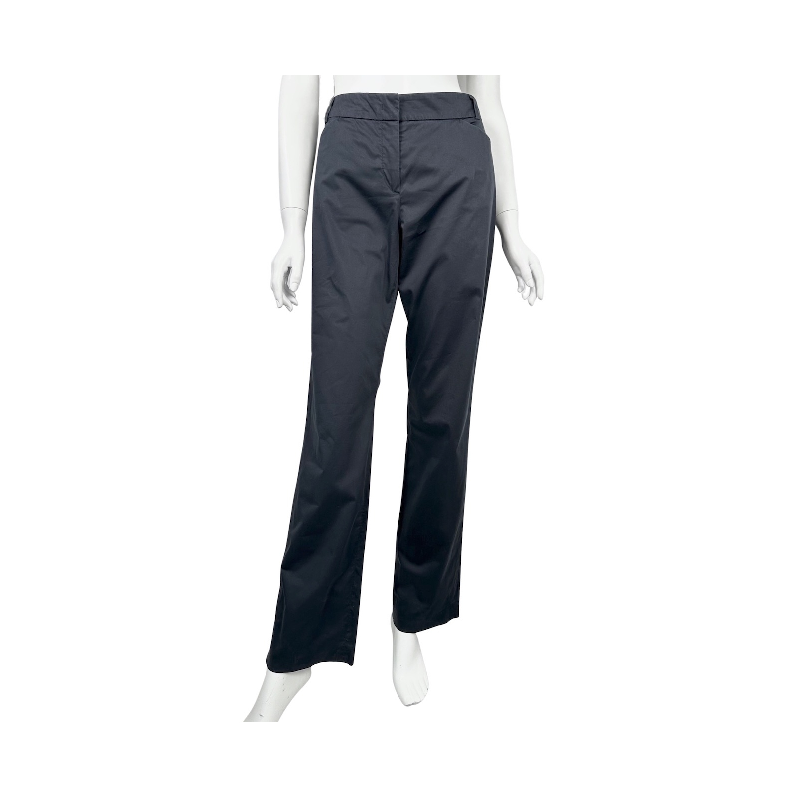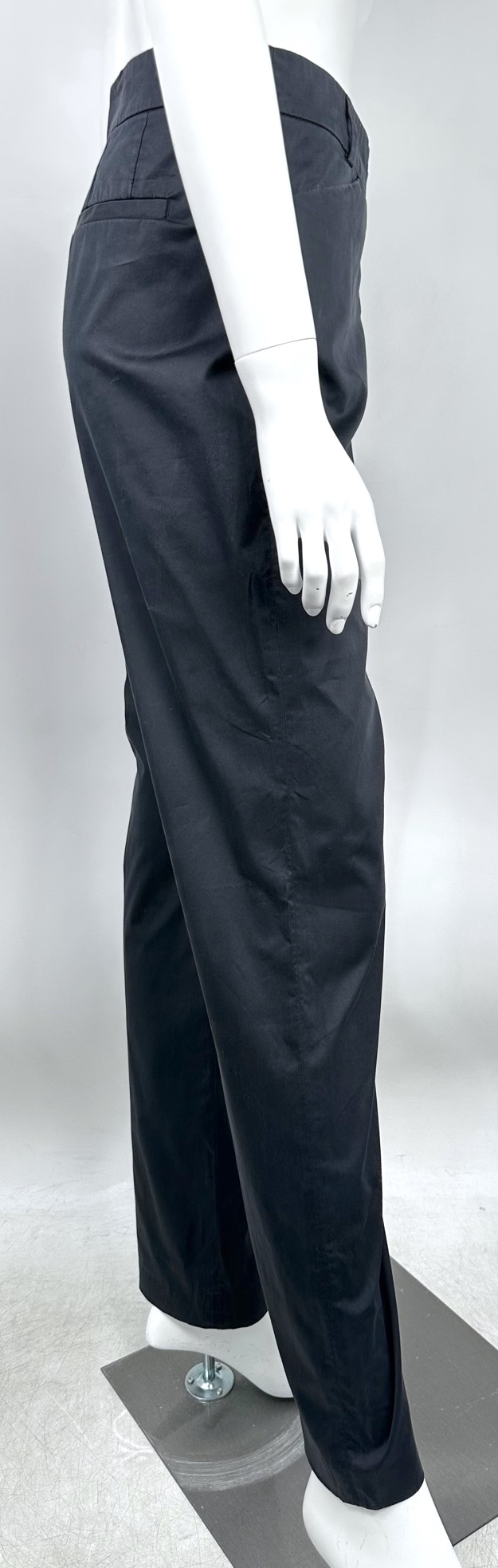 "czarne spodnie, prosta nogawka, z delikatnym połyskiem, z przodu kieszenie. Rozmiar 40. Skład: 96% bawełna, 4% elastan. Wymiary: szer. talii 44 cm, szer. bioder 48 cm, dł. całkowita 106 cm."