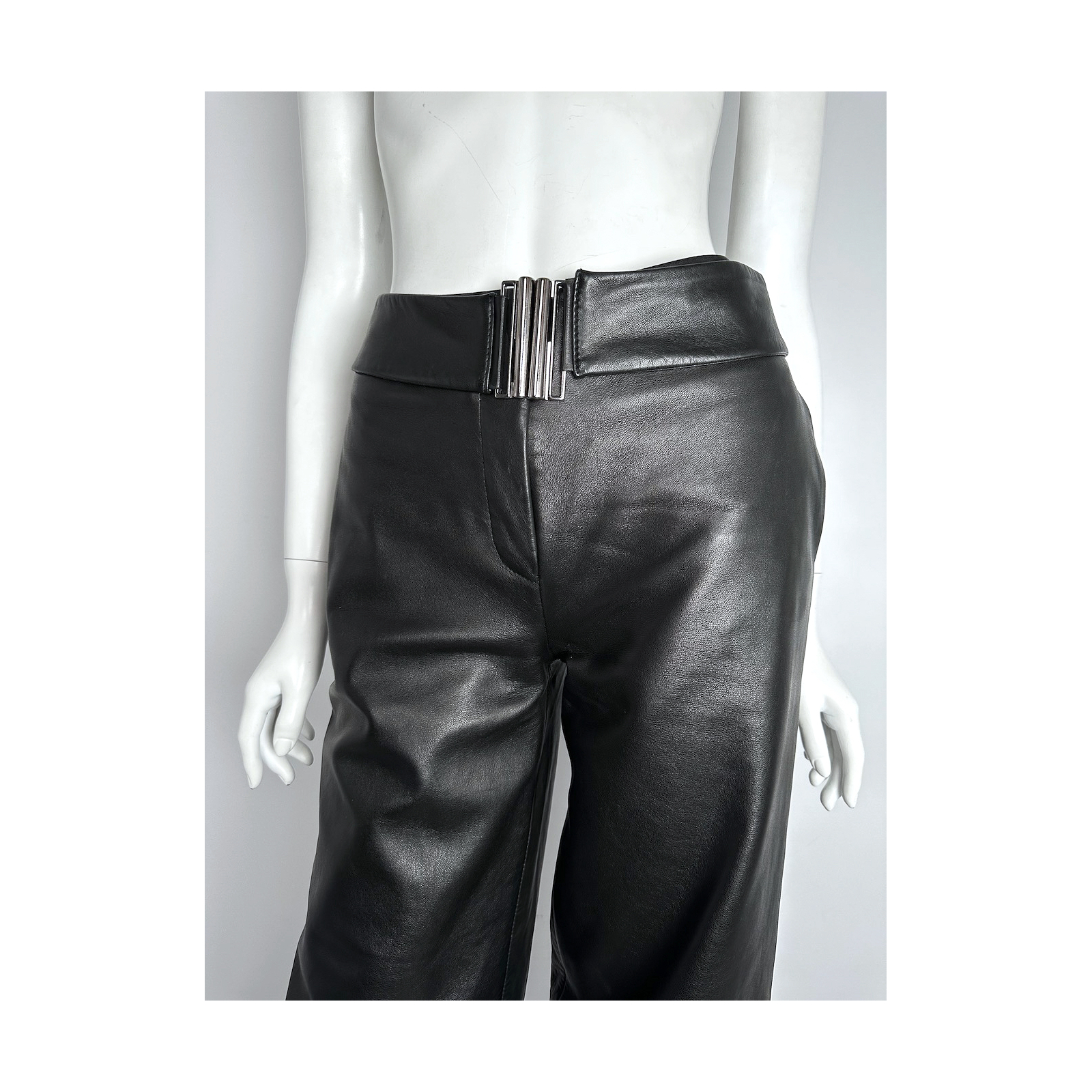 "Czarne spodnie skórzane, baggy, miękka skóra, wysoki stan, częściowy pasek ozdobiony złotą klamrą w pasie, zwężane na wykończeniu nogawek, dekoracyjne przeszycia, zapinane na kryty suwak, mankiety z zatrzaskami, używane. Stan bardzo dobry, delikatnie przetarta skóra w kilku miejscach. Rozmiar z metki 36. Skład: 100% skóra jagnięca. Wymiary: szerokość w pasie 36cm, długość całkowita mierzona od zewnętrznej strony nogawki 105cm."
