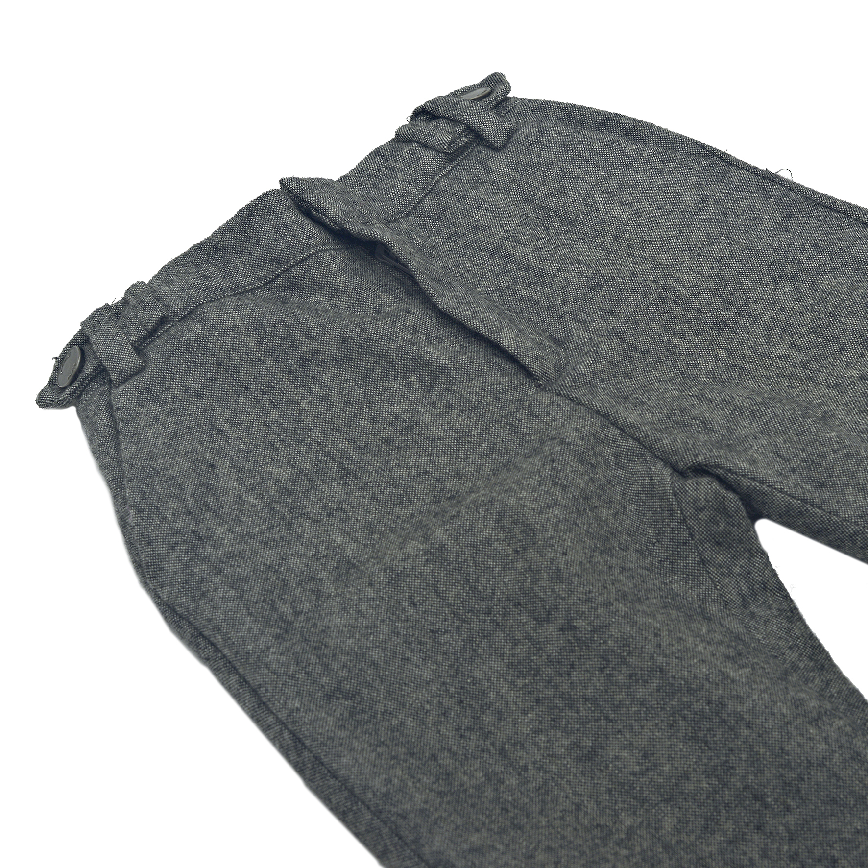 "Spodnie w kolorze szarym, wełniane, z kieszonkami, rozmiar 24 M. (miesiące) , w bardzo dobrym stanie, guziki i napy w kolorze oksydowanego srebra"