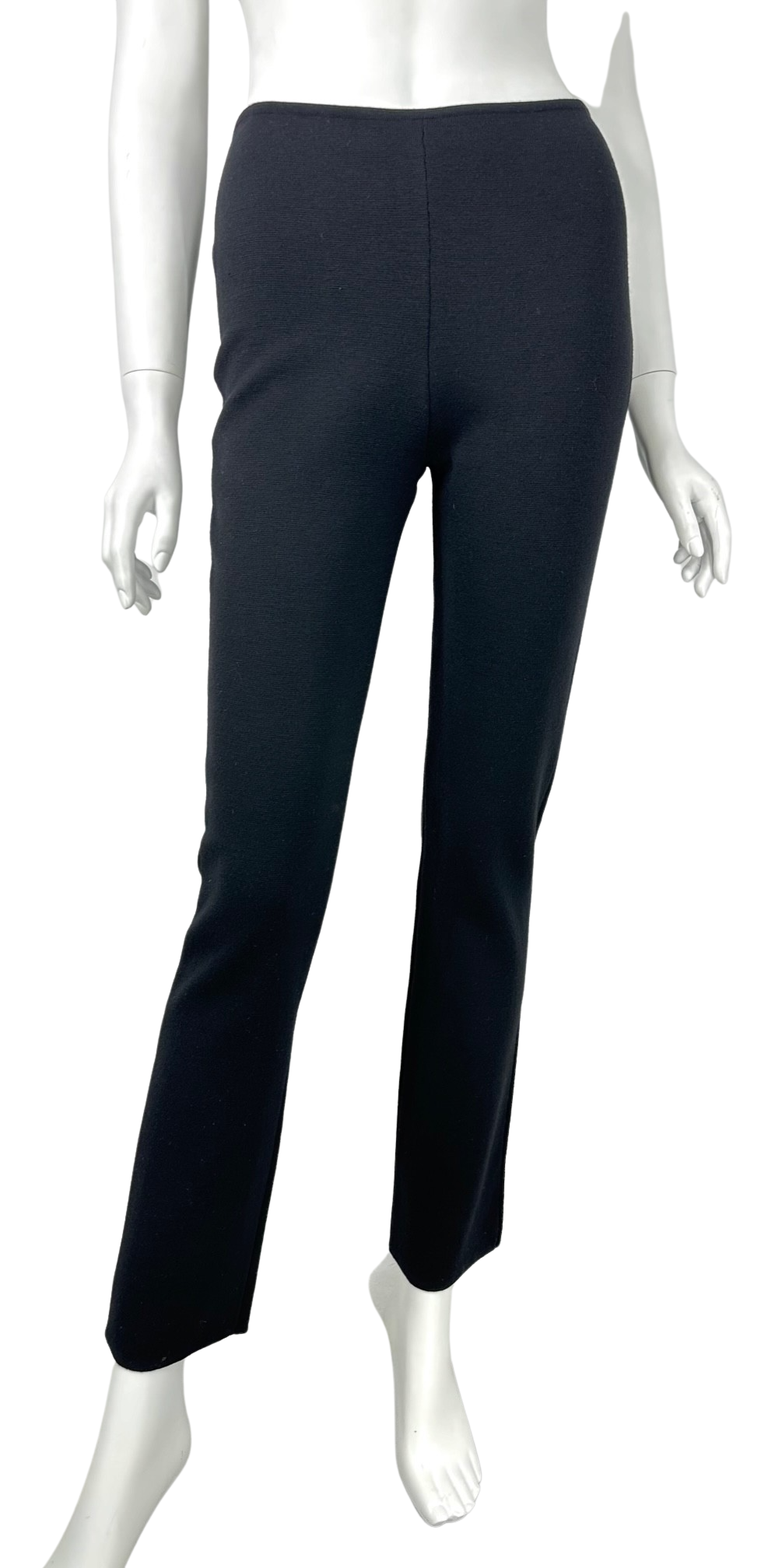 "czarne wełniane legginsy, prosta nogawka, z tyłu zapinane na niewidoczny suwak. Rozmiar M. Skład: 90% wełna, 9% nylon 1% lycra. Wymiary: szer. talii 30 cm, szer. bioder 40 cm, dł. całkowita 100 cm."