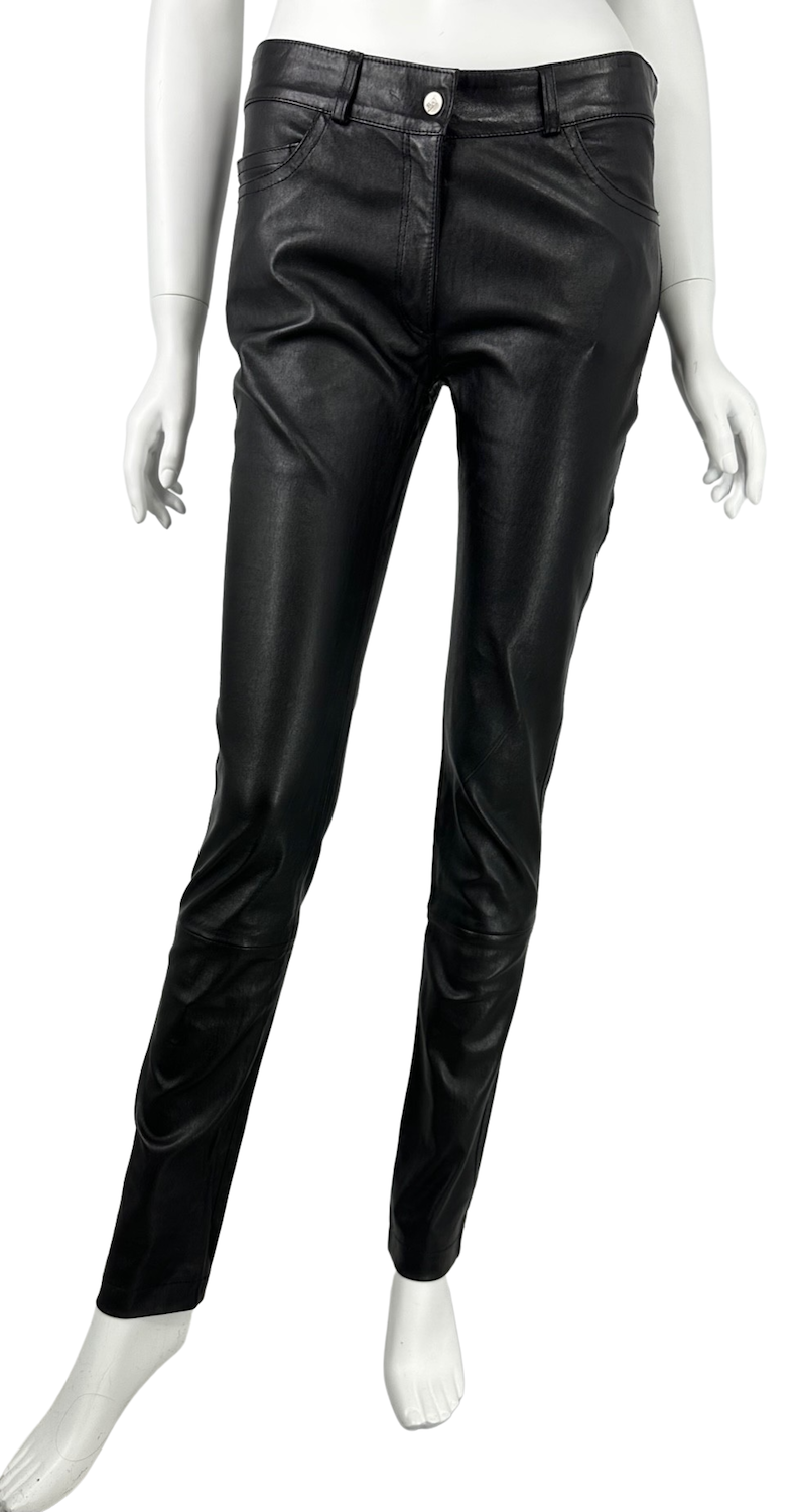 "czarne skórzane spodnie, dopasowane. Rozmiar fr 40. Stan bardzo dobry. Wymiary: szer. talii 39 cm, szer. bioder 44 cm. dł. całkowita 104 cm."