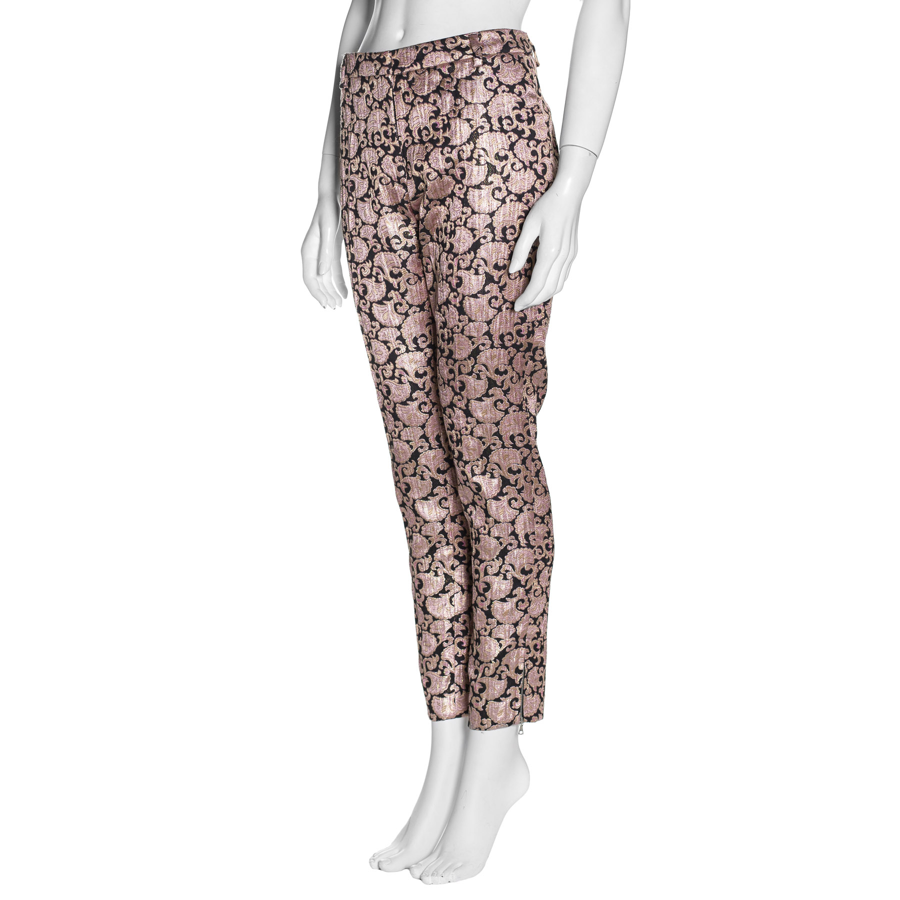"Żakardowe spodnie w różowo-złote barokowe wzory, w kant. Rozmiar 40, skład 91% bawełna 9% poliester// wymiary: pas 41%, biodra 53 cm., długość nogawek 97 cm."
