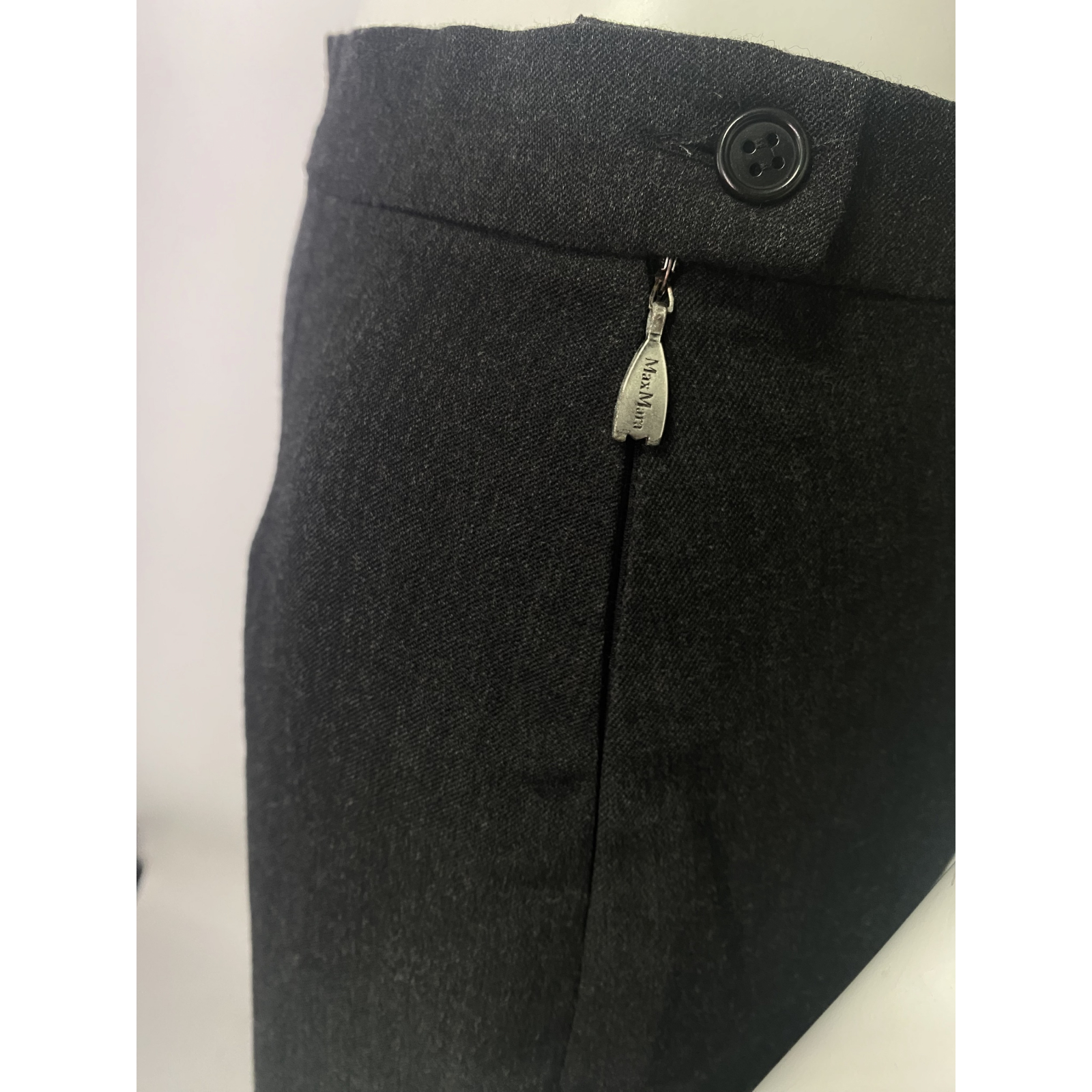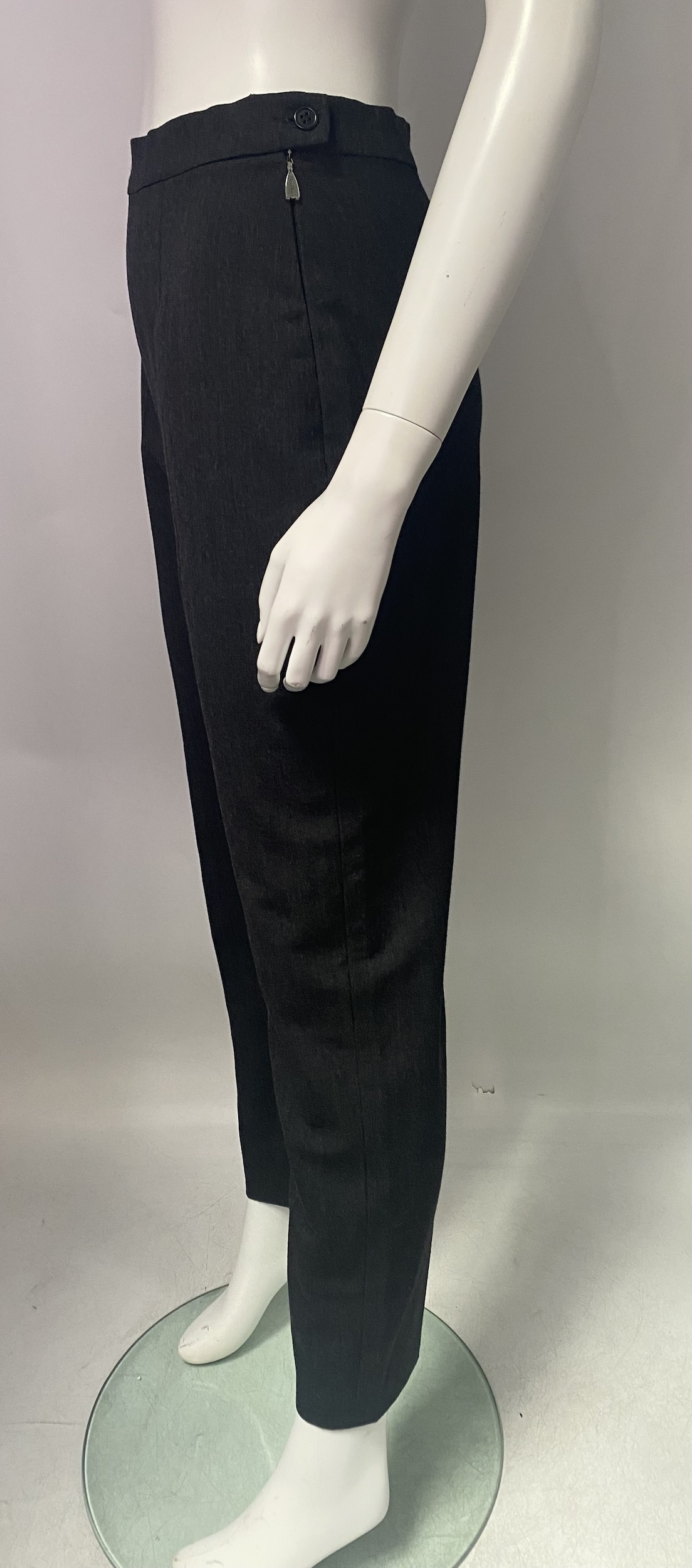 "wełniane, czarne spodnie, zapinane z boku na zamek i guziki w pasie. Rozmiar 38. Skład: 94 % virgin wool, 3% poliamid, 3% elastan. Wymiary: szer. talii 34 cm, szer. bioder 43 cm, dł. całkowita 101 cm."
