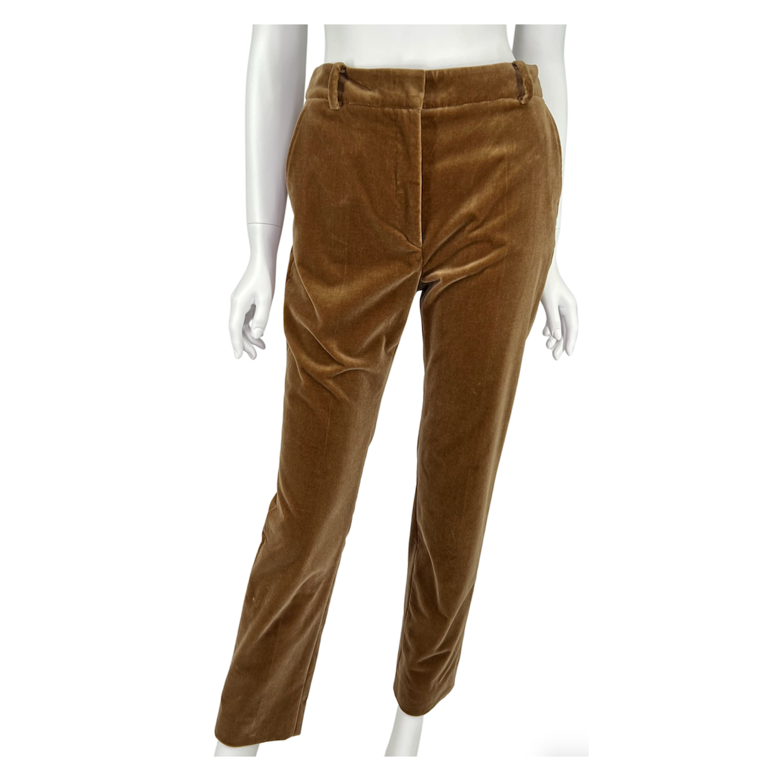 "welurowe spodnie w odcieniach kawy z mlekiem, zwężane ku dołowi, kieszenie z przodu oraz z tyłu, nowe z metką. Rozmiar IT36. Skład: 98% bawełna, 2% elastan. Wymiary: szer. talii 36 cm, szer. bioder 44 cm, dł. całkowita 95 cm."