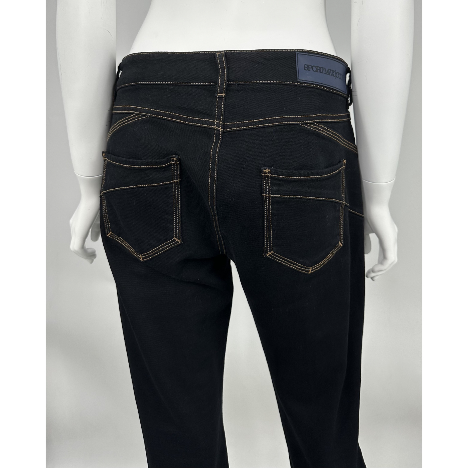 "czarne/ ciemno granatowe spodnie z brązowymi przeszyciami. Dopasowane. Fason z metki Cigarete. Rozmiar 28. Skład: 99% bawełna, 1% elastan. Wymiary: szer. talia 41 cm, dł. całkowita 91 cm, szer. biodra 47 cm"