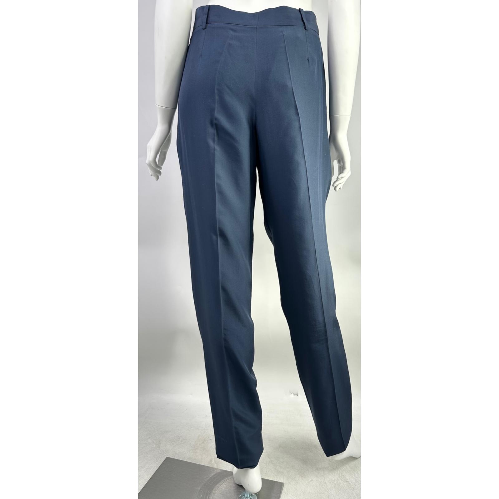 "granatowe jedwabne spodnie w kant, zaszewki na biodrach, boczne kieszenie, zapięcie w talii na haftkę, guzik i suwak. Rozmiar IT 40. Skład: 100% jedwab. Wymiary: szer. talii 39 cm, szer. bioder 45 cm, dł. całkowita 122 cm."