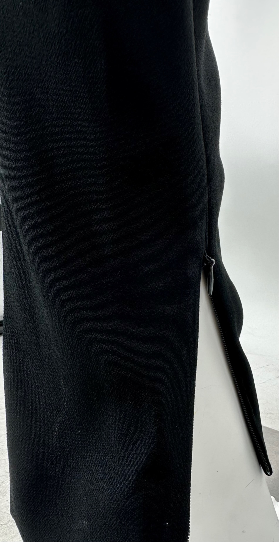 "czarne spodnie, skórzane wstawki po bokach, zwężane nogawki z suwakami na dole, w talii zapięcie na haftki i suwak. Rozmiar IT 44. Skład: 65% wiskoza, 32% acetat 3% elastan. Wymiary: szer. talii 40 cm, szer. bioder. 46 cm, dł. całkowita 103 cm."
