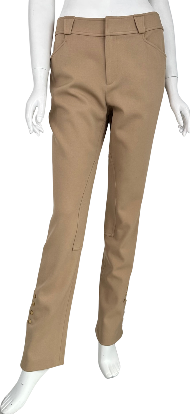 "spodni beżowe proste nogawki ozdobione na dole guzikami, przeszycia na wewnętrznej stronie ud, boczne kieszenie, zapinane w talii na haftkę i suwak. Rozmiar 8. Skład: 96% virgin wool, 4% elastan. Wymiary: szer. talii 37 cm, szer. bioder 45 cm, dł. całkowita 107 cm."