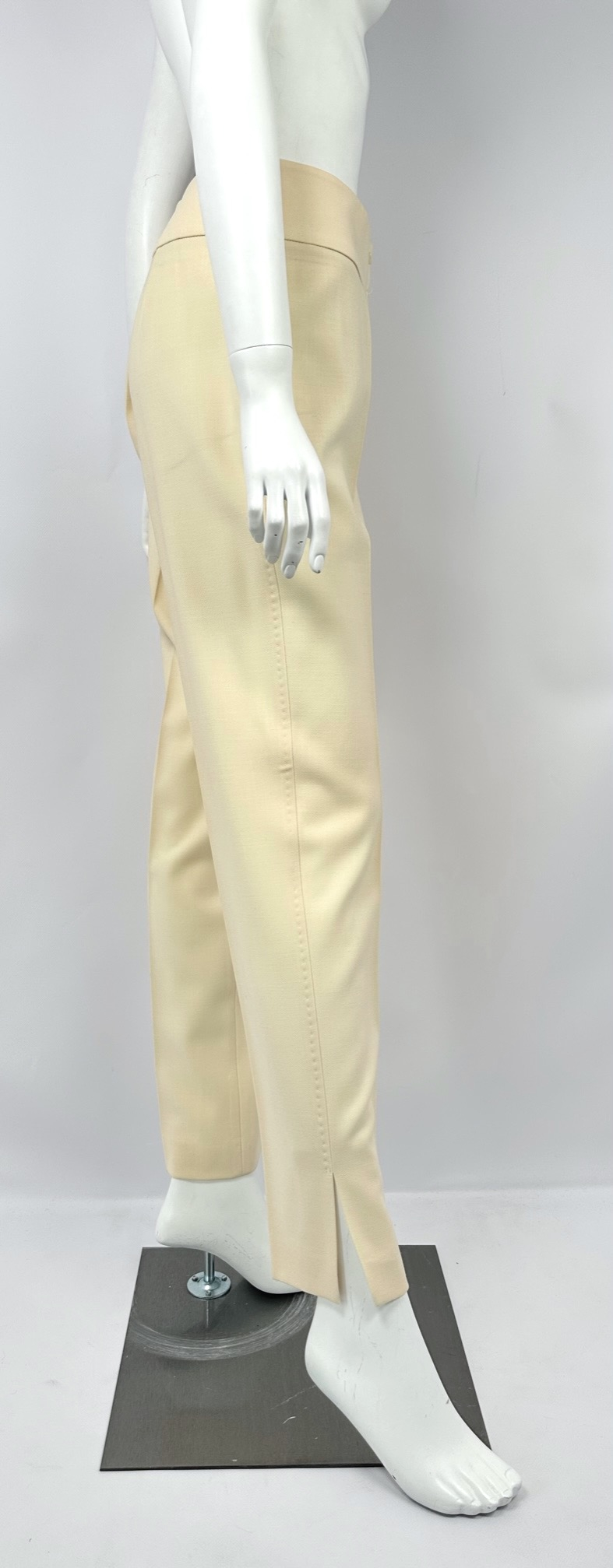 "spodnie w kant z prostą nogawką i szerokim paskiem, zapinane z przodu na suwak i dwa guziki. Rozmiar IT 44. Wymiary szer. talii 39 cm, szer. bioder 46 cm, dł. całkowita 102 cm."