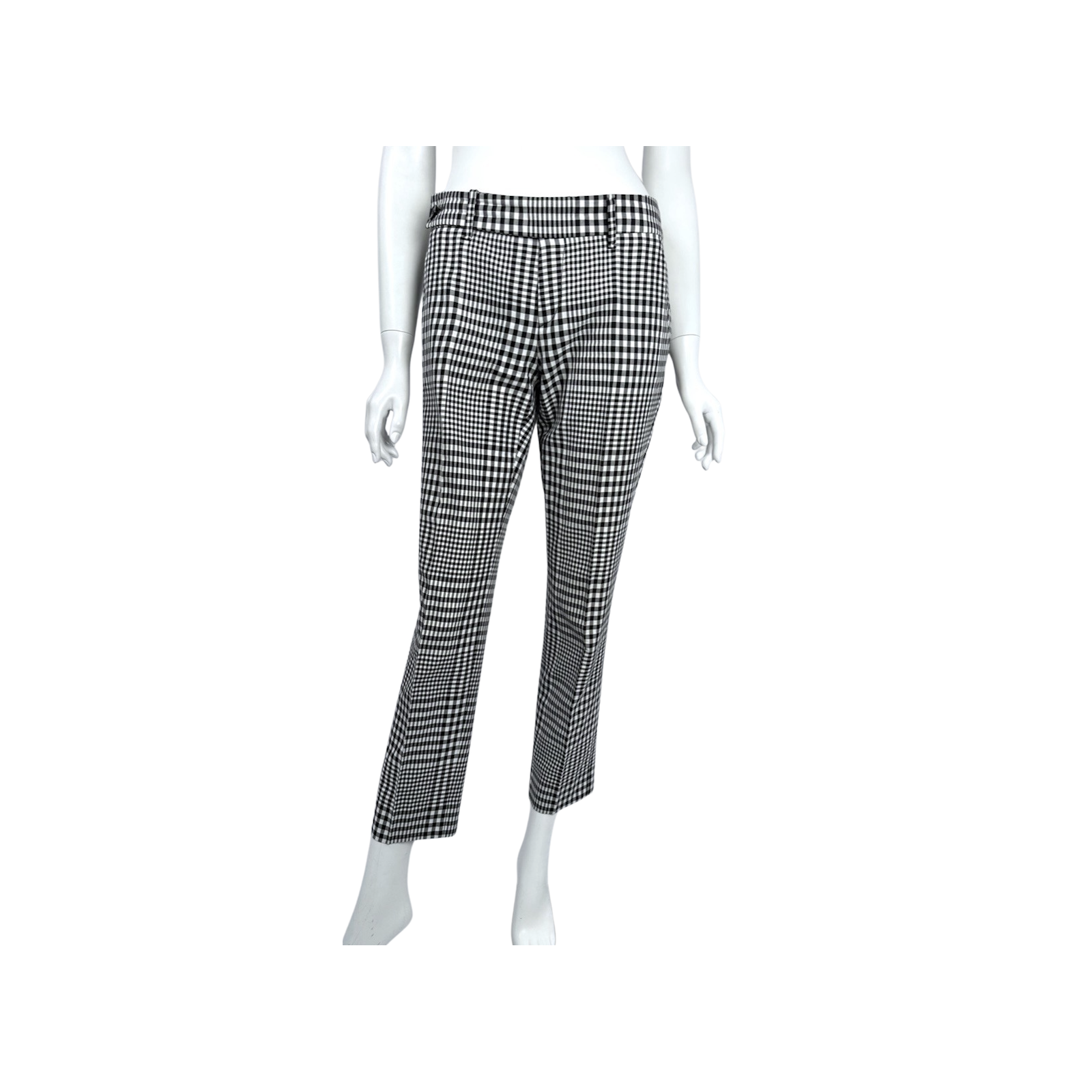 "spodnie w kratę czarno białą. Rozmiar it 40. Skład: 75% bawełna, 15% jedwab. Wymiary: szer. talii 40 cm, szer. biustu 46 cm, dł. całkowita 91 cm."