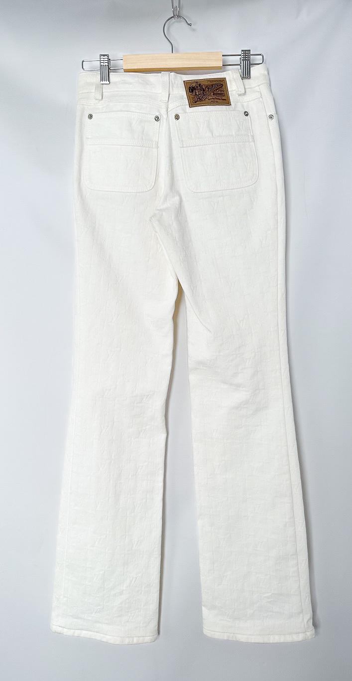 "Białe logowane spodnie, niski stan, zapinane na srebrny suwak oraz guzik z logo marki, szersza nogawka, trzy kieszenie na przodzie oraz dwie z tyłu, przyszyte brązowe logo marki z grafiką przy szlufkach. Wymiary: szerokość w pasie 35cm, długość nogawki mierzona od zewnętrznej strony 108cm."
