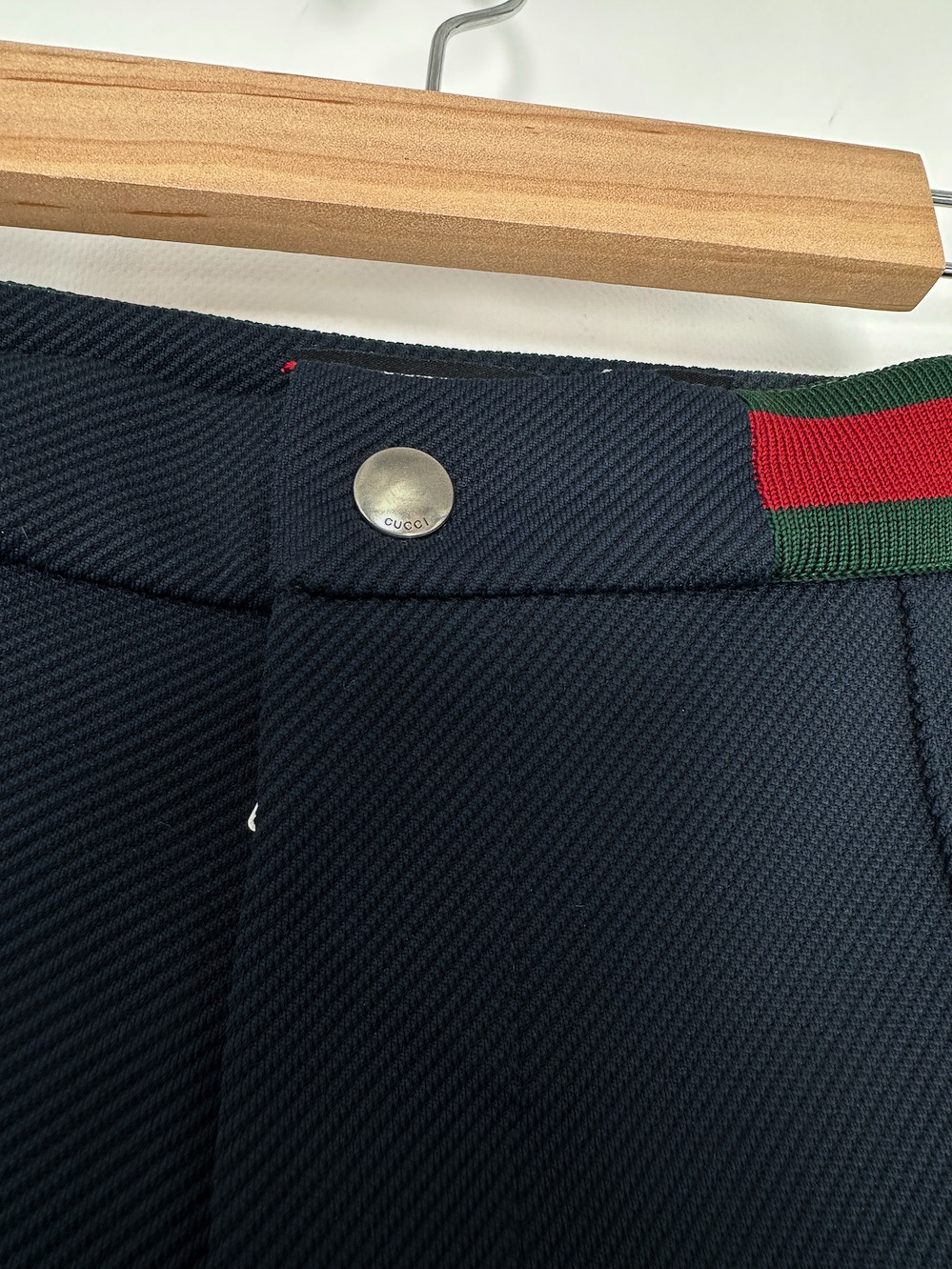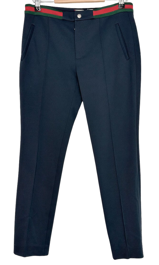 "Granatowe spodnie materiałowe wykończone zielono-czerwonym pasem, w kant, prosta nogawka, średni stan, zapinane na srebrny logowany zatrzask oraz kryty suwak, dwie kryte kieszenie z przodu oraz dwie z tyłu. Rozmiar z metki S. Skład: 100% poliamid, lamówka: 100% poliester. Wymiary: szerokość w pasie 40cm, długość całkowita 91cm."