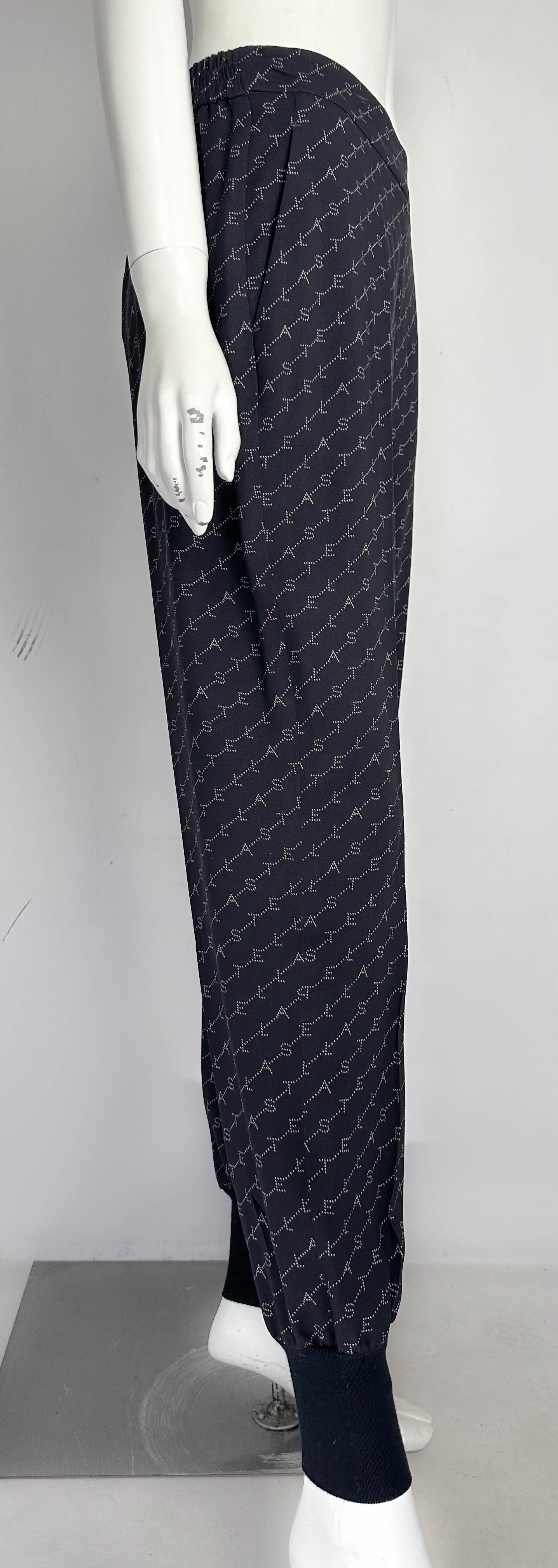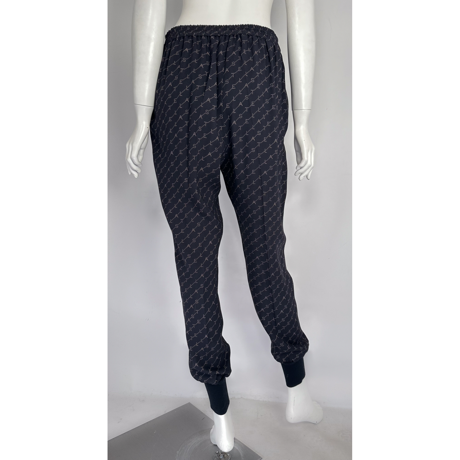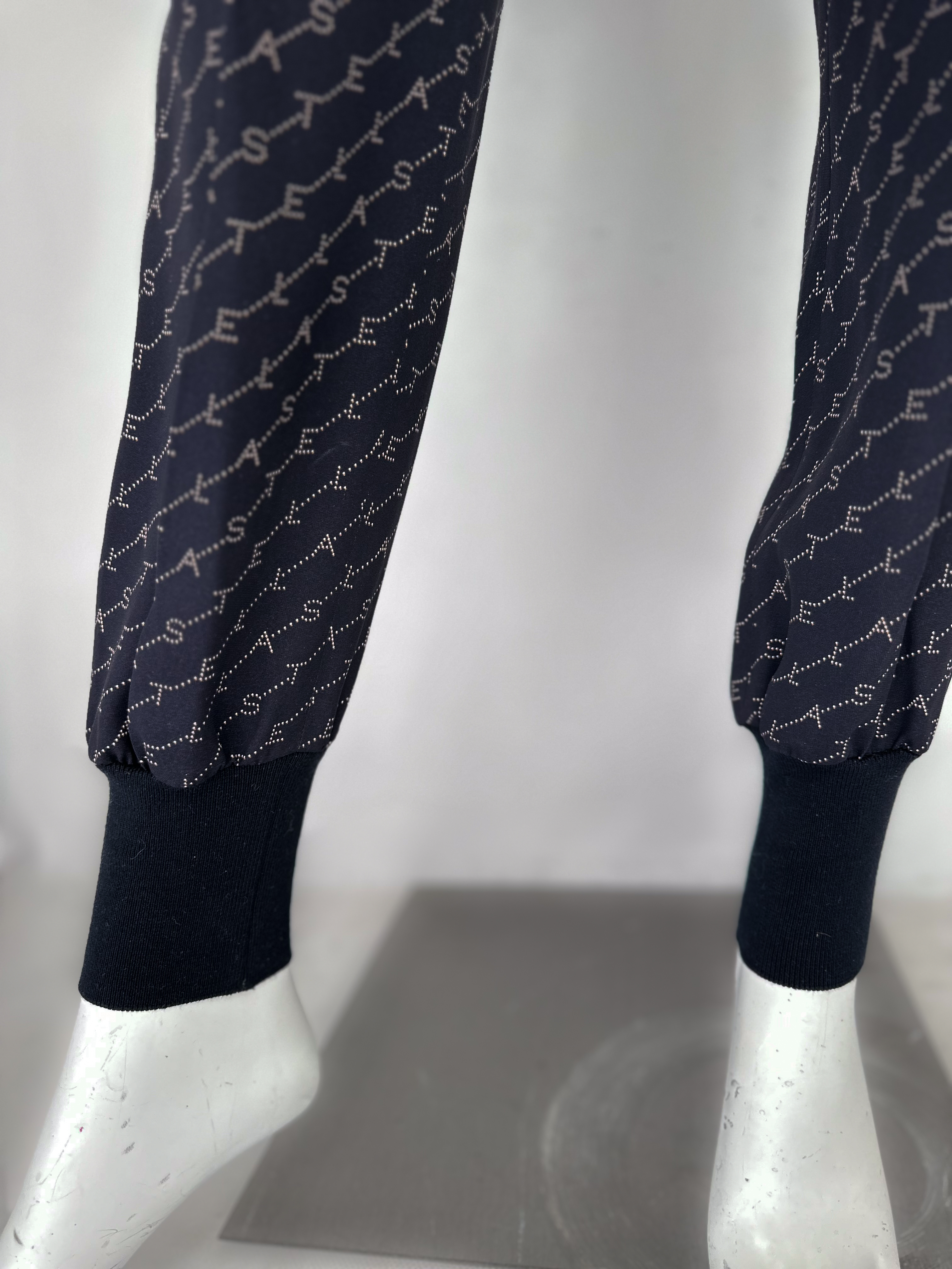 "Granatowe spodnie w brązowo-białe logowanie, częściowa guma w pasie, nogawki zakończone ściągaczem, dwie kryte kieszenie po bokach. Rozmiar z metki 40. Skład: 75% wiskoza, 21% jedwab, 4% elastan,; detale: 100% bawełna. Wymiary: szerokość w pasie 37cm, długość całkowita mierzona od zewnętrznej strony nogawki 102cm."