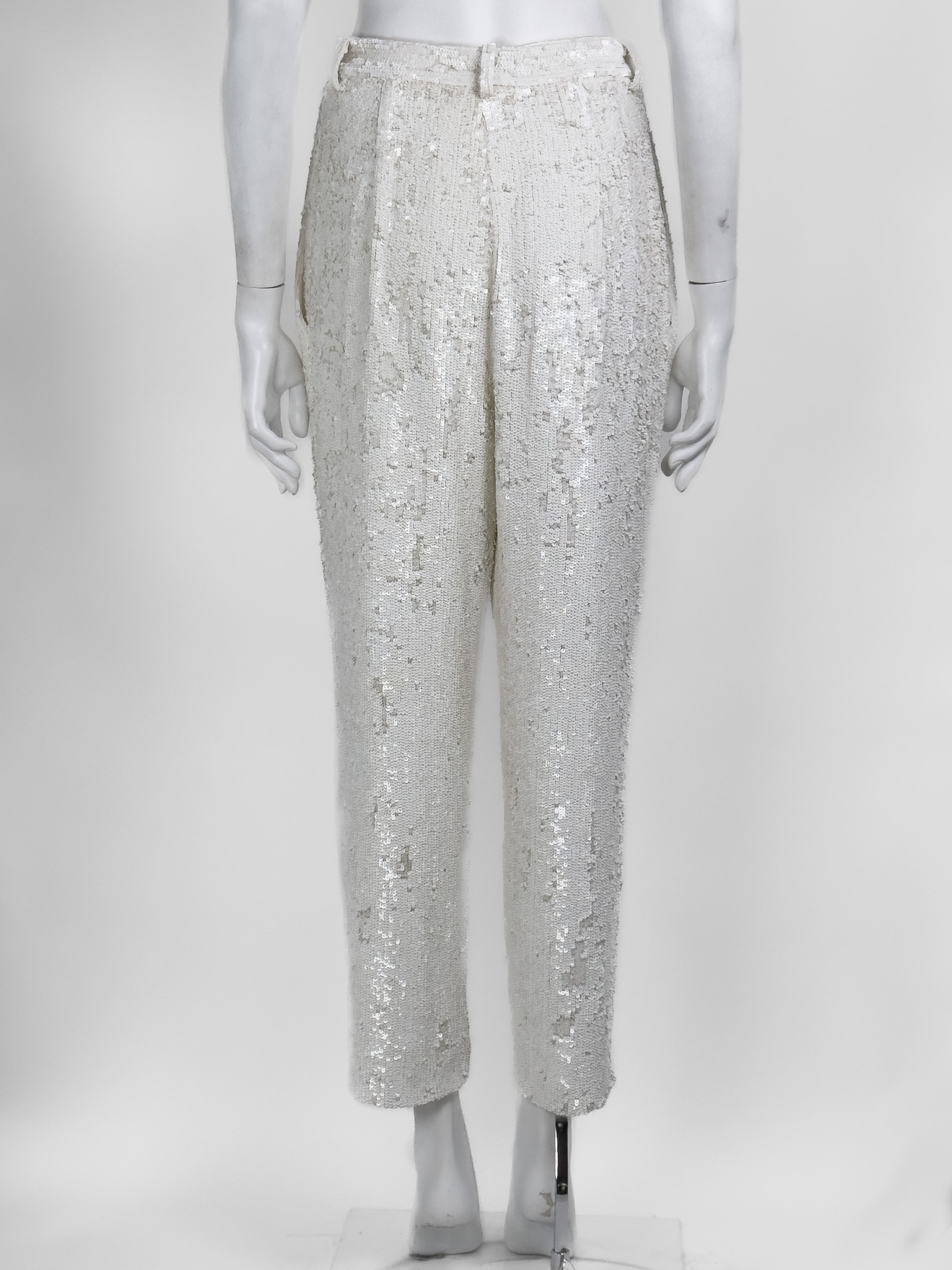 "Cekinowe spodnie w kolorze mlecznej bieli, zaszewki, prosta nogawka, szlufki w pasie, wysoki stan, obniżony krok, zapinane na kryty suwak oraz dwie haftki, dwie kryte kieszenie po bokach. Rozmiar z metki 38. Skład: 100% wiskoza; podszewka: 100% jedwab. Wymiary: szerokość: 37cm, długość całkowita nogawki: 100 cm"
