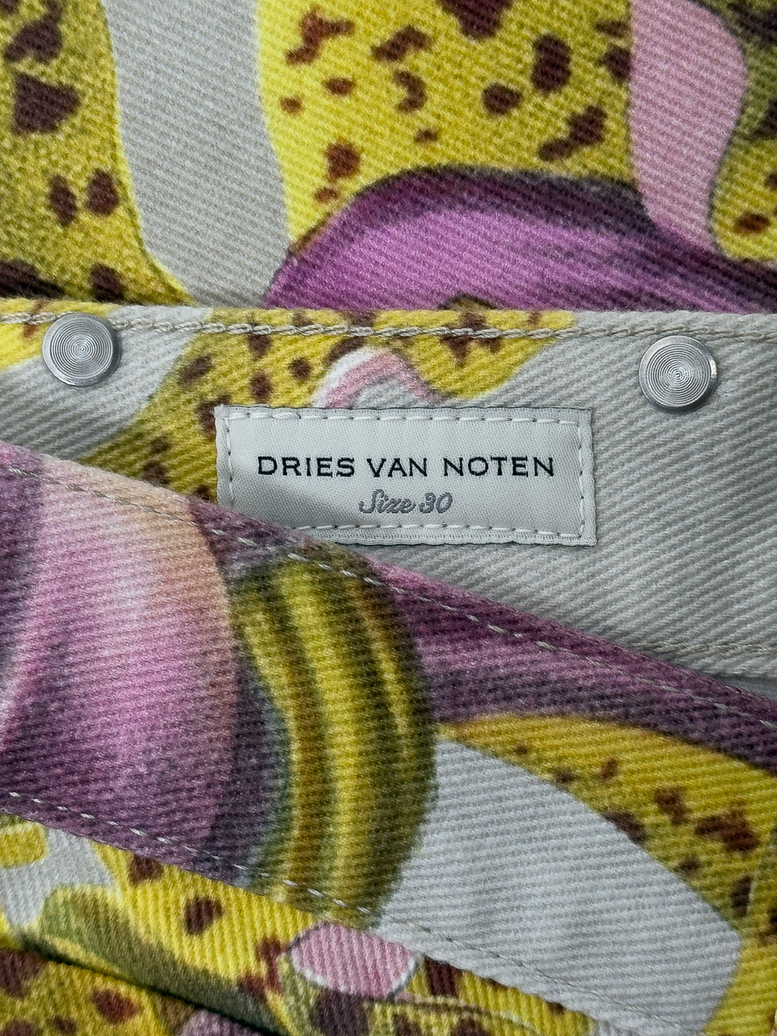 "Jasnoszare spodnie jeansowe ozdobione żółto-różowym wzorem o motywie kwiatowym, wysoki stan, prosta nogawka, zapinane na kryte guziki oraz jeden widoczny logowany, pięć kieszeni, skórzana naszywka z logo marki na wysokości szlufek. Stan nowe z metką Rozmiar z metki 30. Skład: 100% bawełna. Wymiary: szerokość w pasie 42cm, długość całkowita mierzona od zewnętrznej strony nogawki 106cm."
